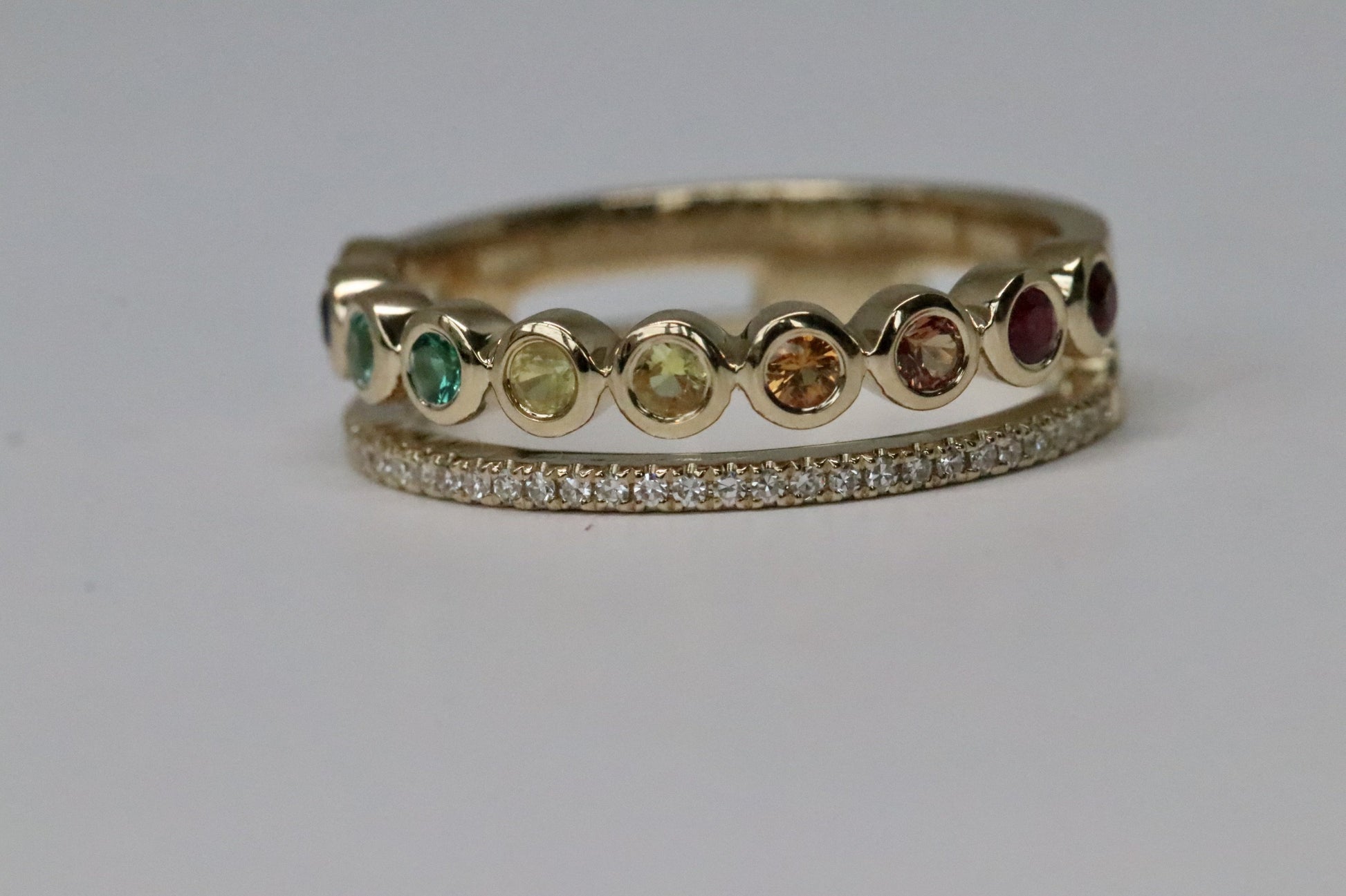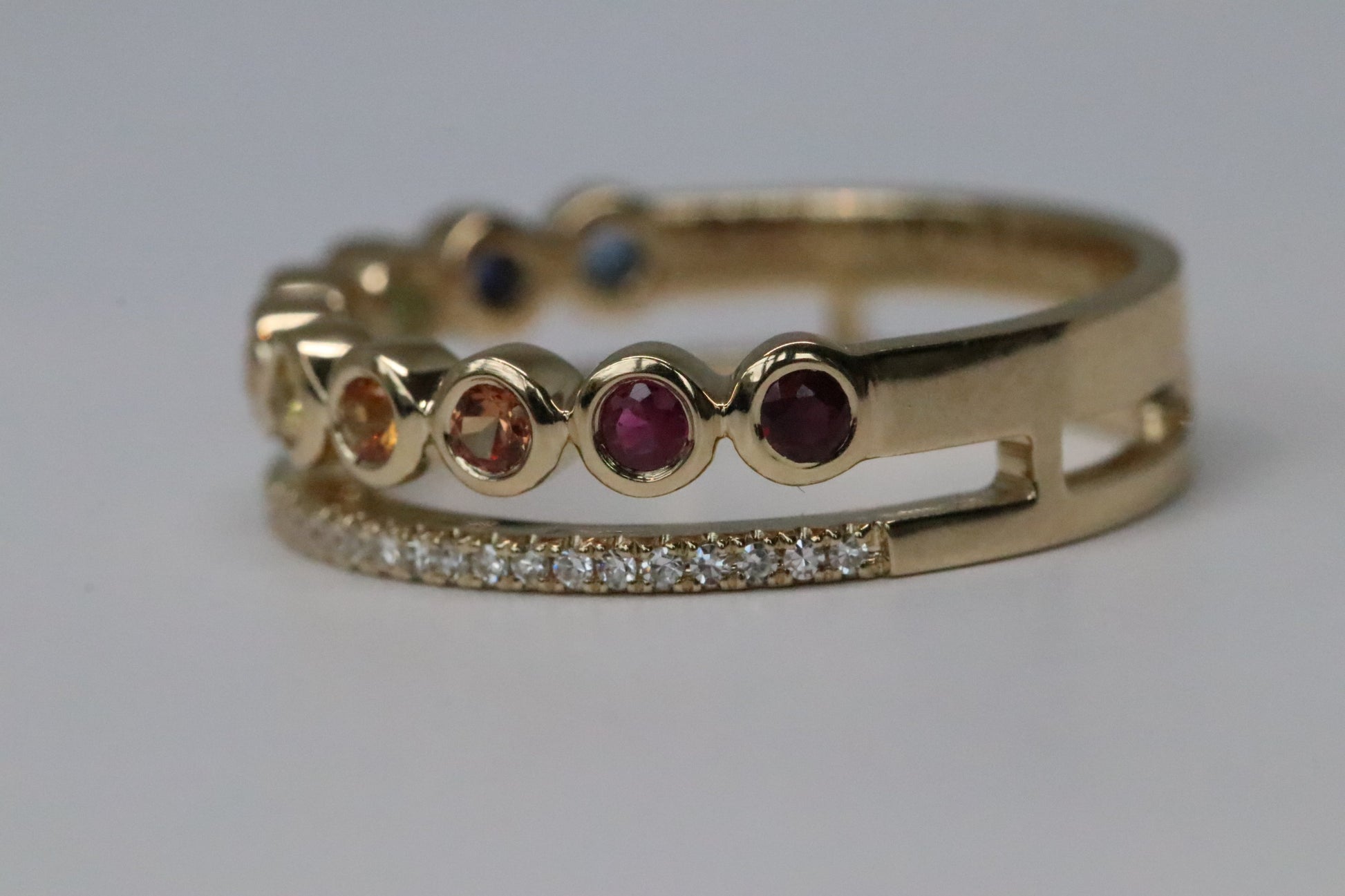 This ring is super fun, comfortable, and VERY unique. It has one row of 30 round brilliant cut diamonds that equal 0.10tcw shared prong set. Then it has a second row of 10 multi-color round-cut sapphires bezel set that equals 0.40tcw.