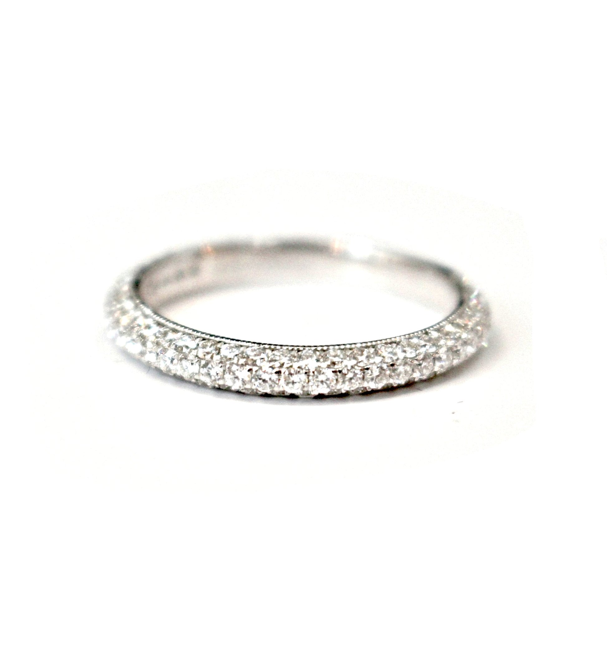 This band has 109 round brilliant cut diamonds that are pave set throughout the band. The band sits low and is slightly domed in shape. You can see diamonds from every angle on this ring. There is also mil-grain added on both side profiles for extra detail. Currently, this ring is only available in 14kt white gold in sizes 5-7.50 for next day delivery. We also have a matching engagement ring you can visit here.