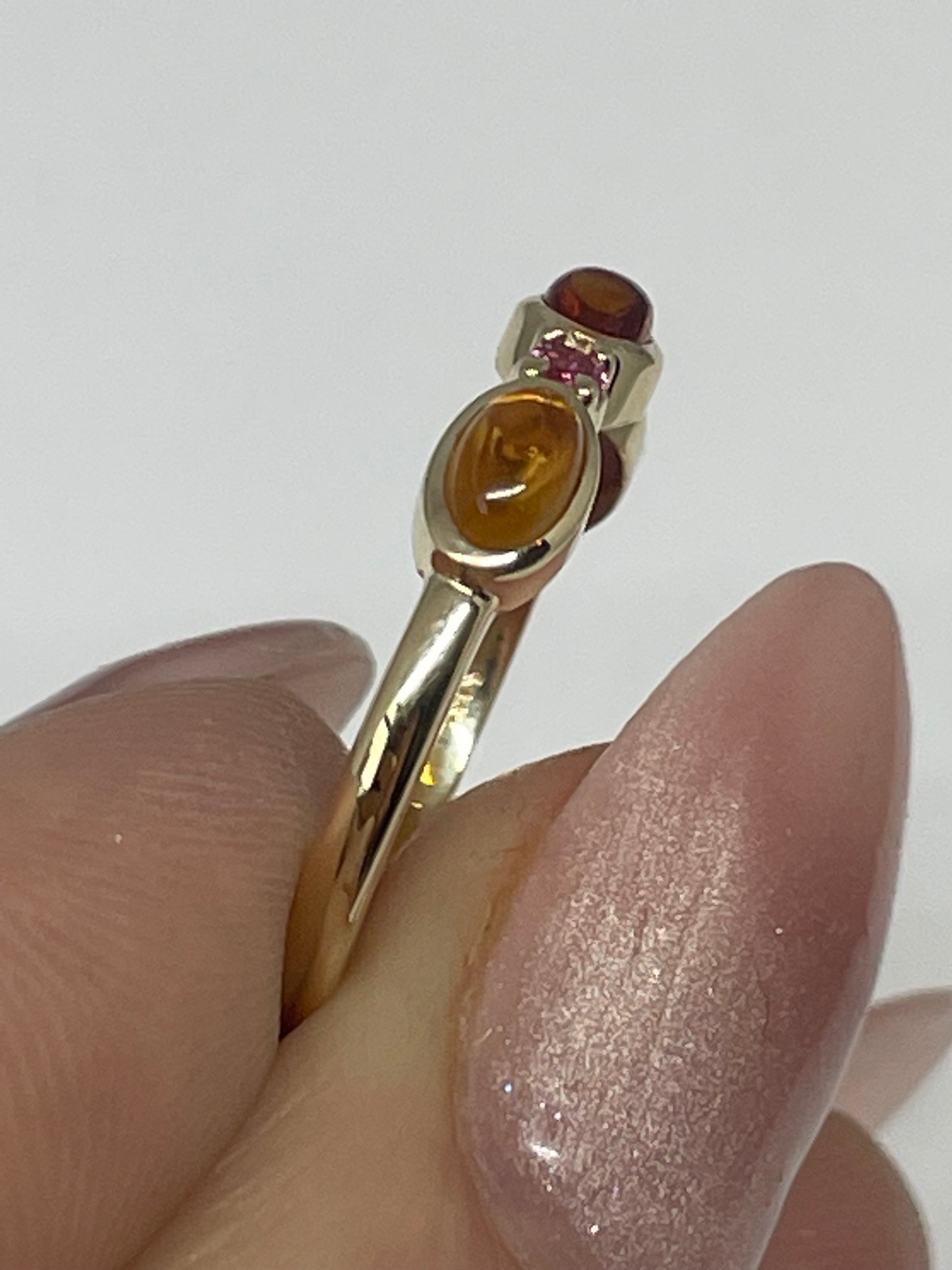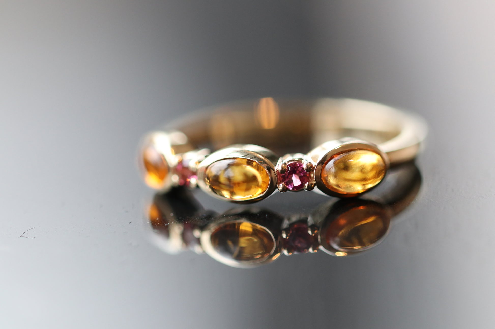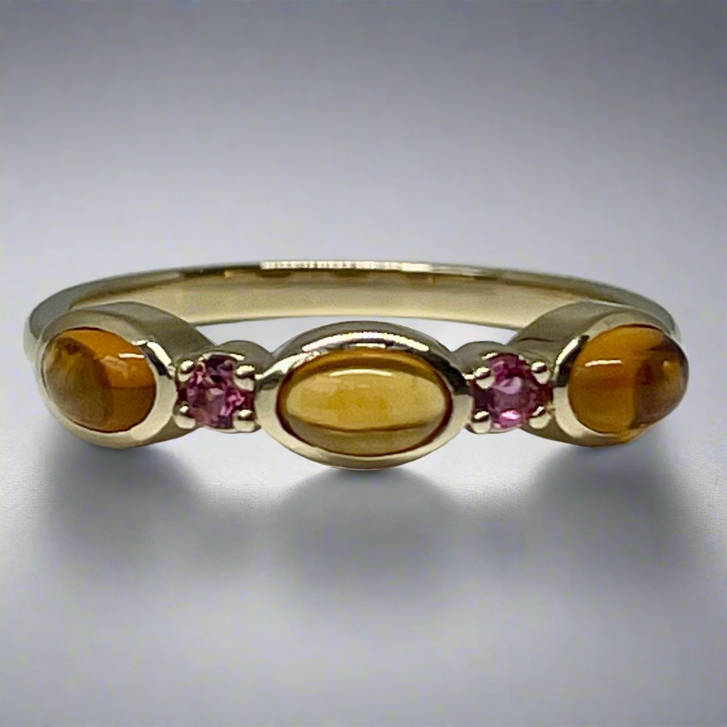 This stunning ring showcases alternating Oval Cut Citirne Cabochons with round facet cut pink tourmalines all bezel set for a smooth clean look. Citirne also happends to be the Birthstone for the month of November.