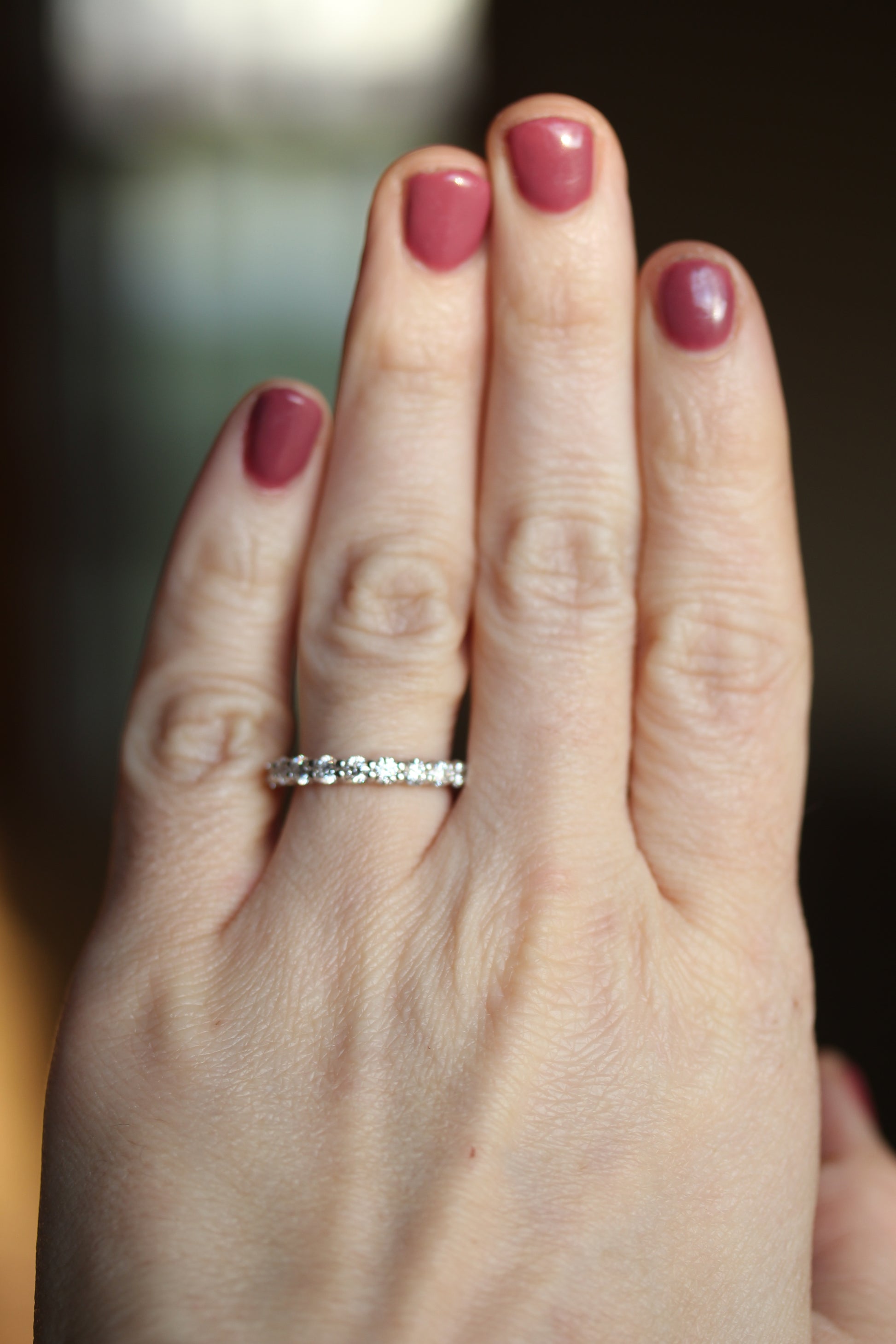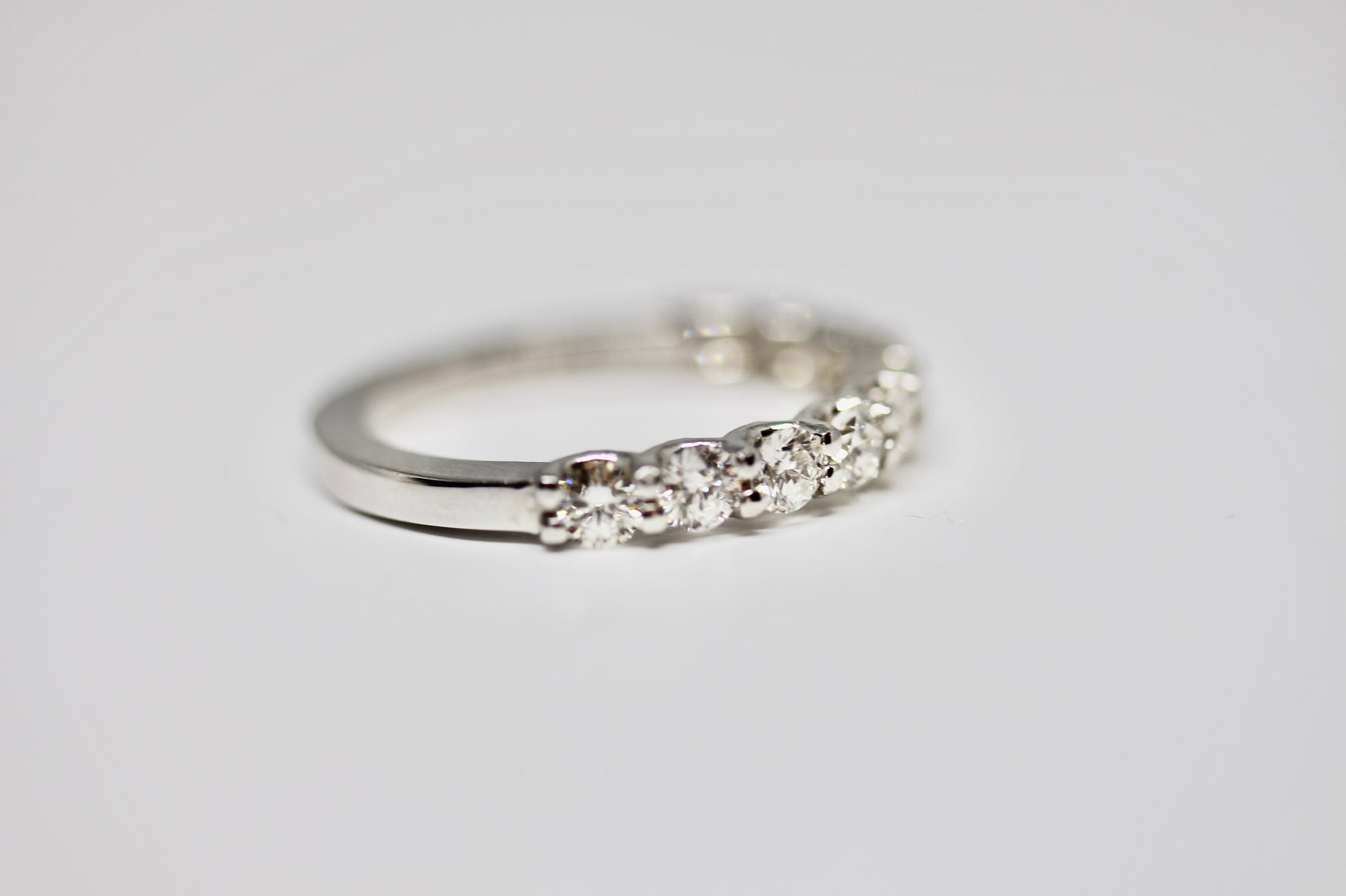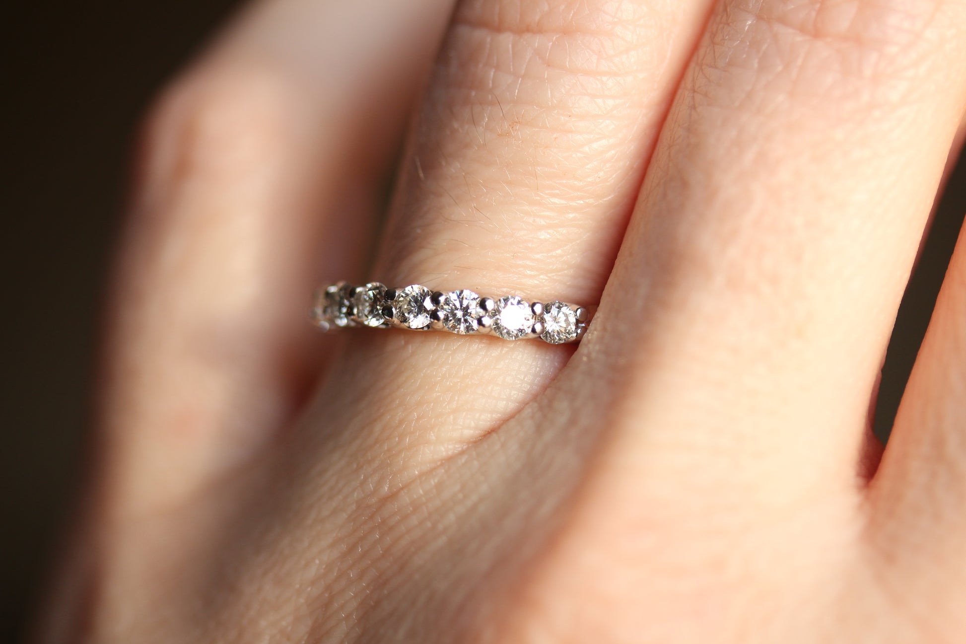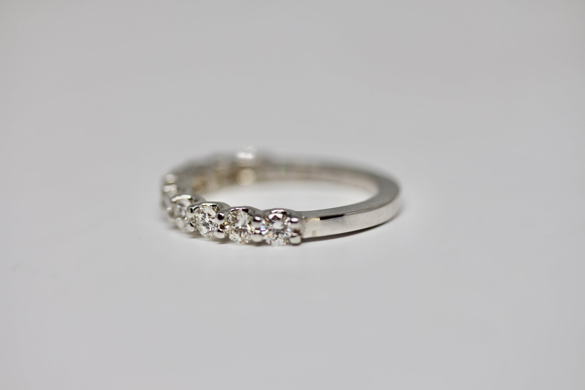 This wedding band has 10 round brilliant cut diamonds shared prong set in a U-shaped. The U-shaped opening on the sides allows light to travel through the diamonds for ultimate sparkle. We make this in various carat weights and metals. We have 14kt yellow gold available for next-day delivery. 14kt Rose and White Gold will take 5 days to make. If you would like in Platinum, another gemstone, or carat weight Call/Text (630)355-RING for time frame and availability.
