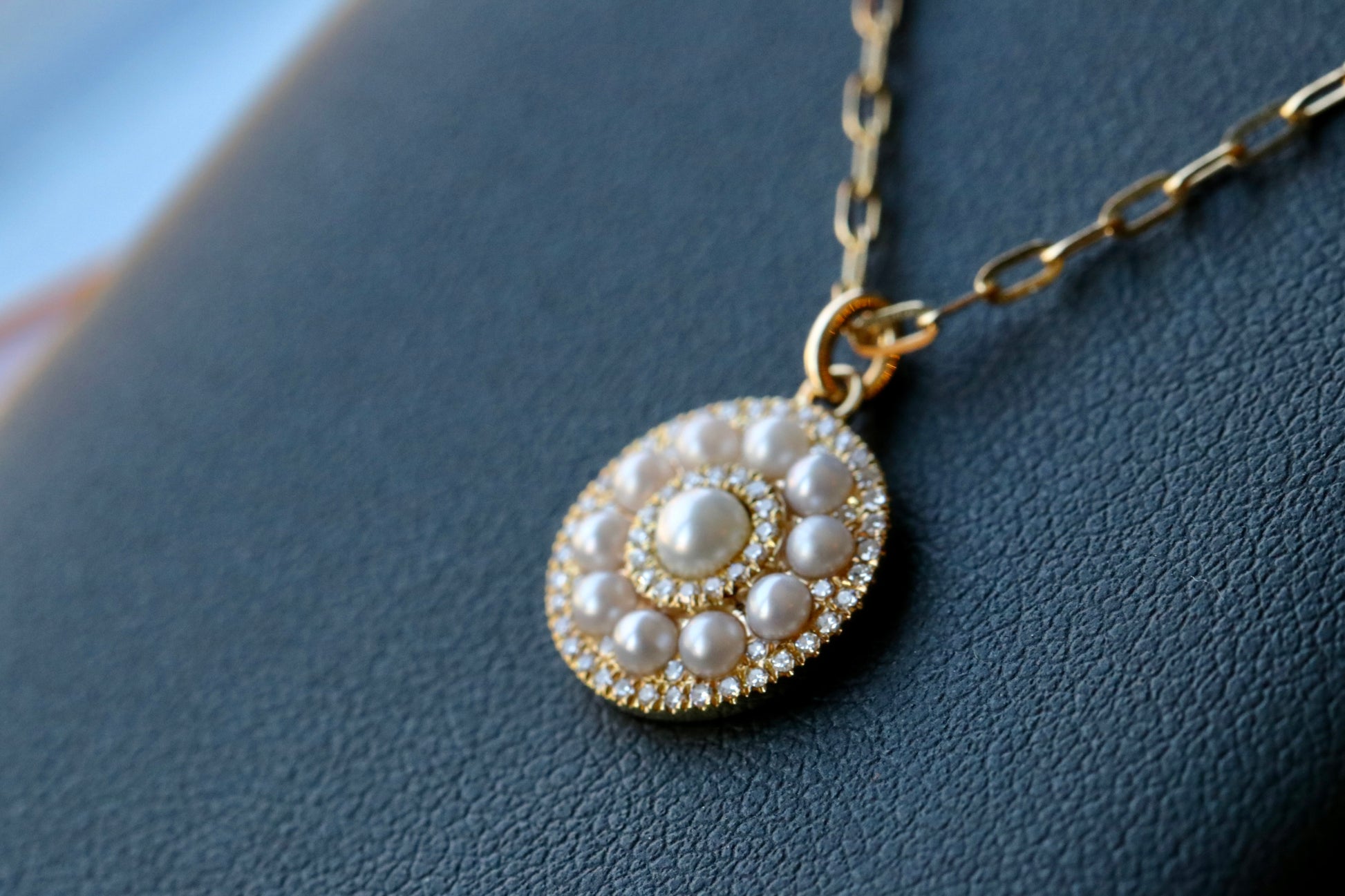 This disc pendant has freshwater pearls and diamonds shared prong set on the disc for a unique look. It also comes on a 18" 2mm paperclip necklace.