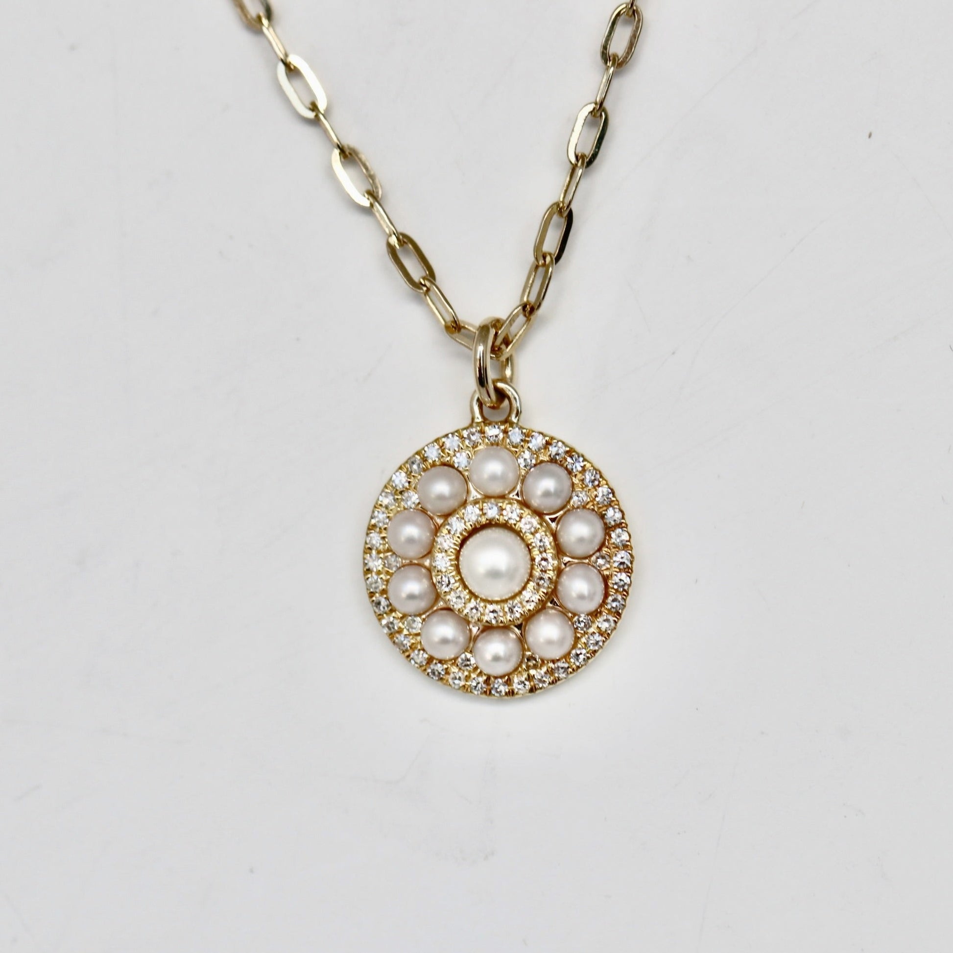 Pearl an Diamond Disc Pendant on a Paperclip Chain in 14kt Gold