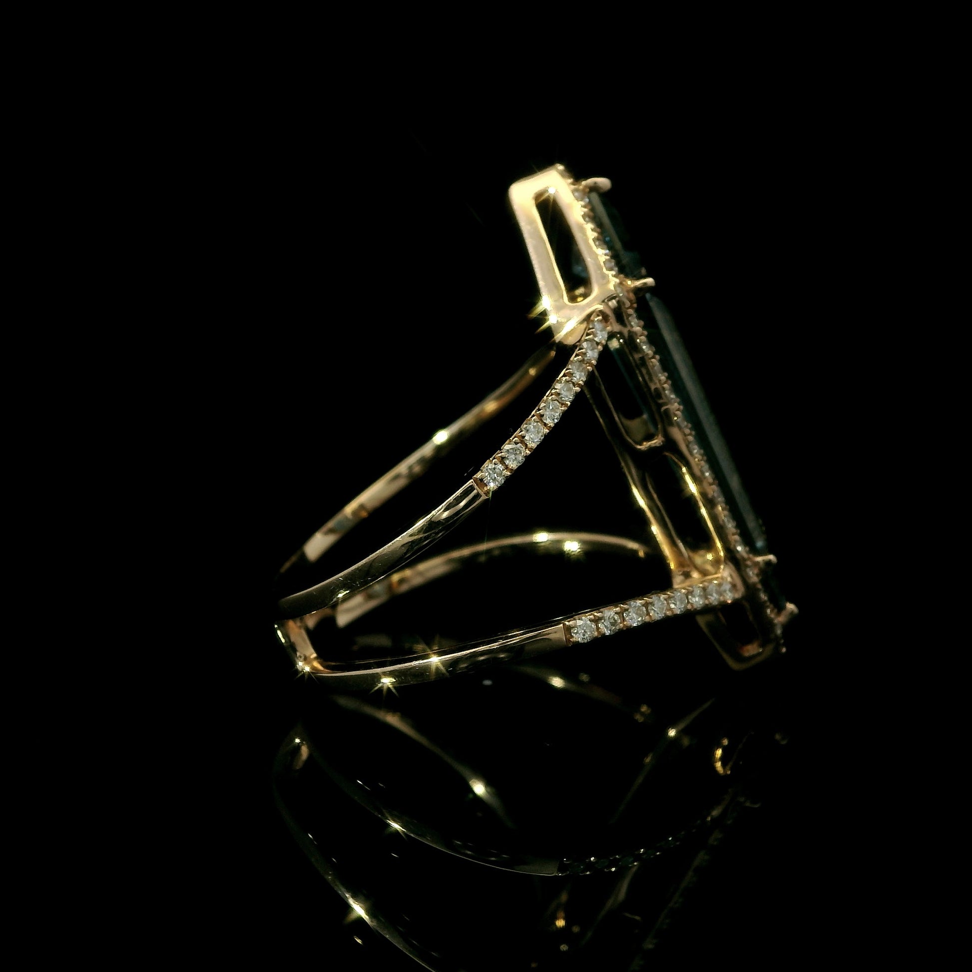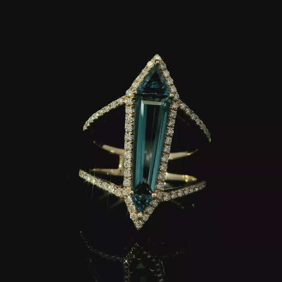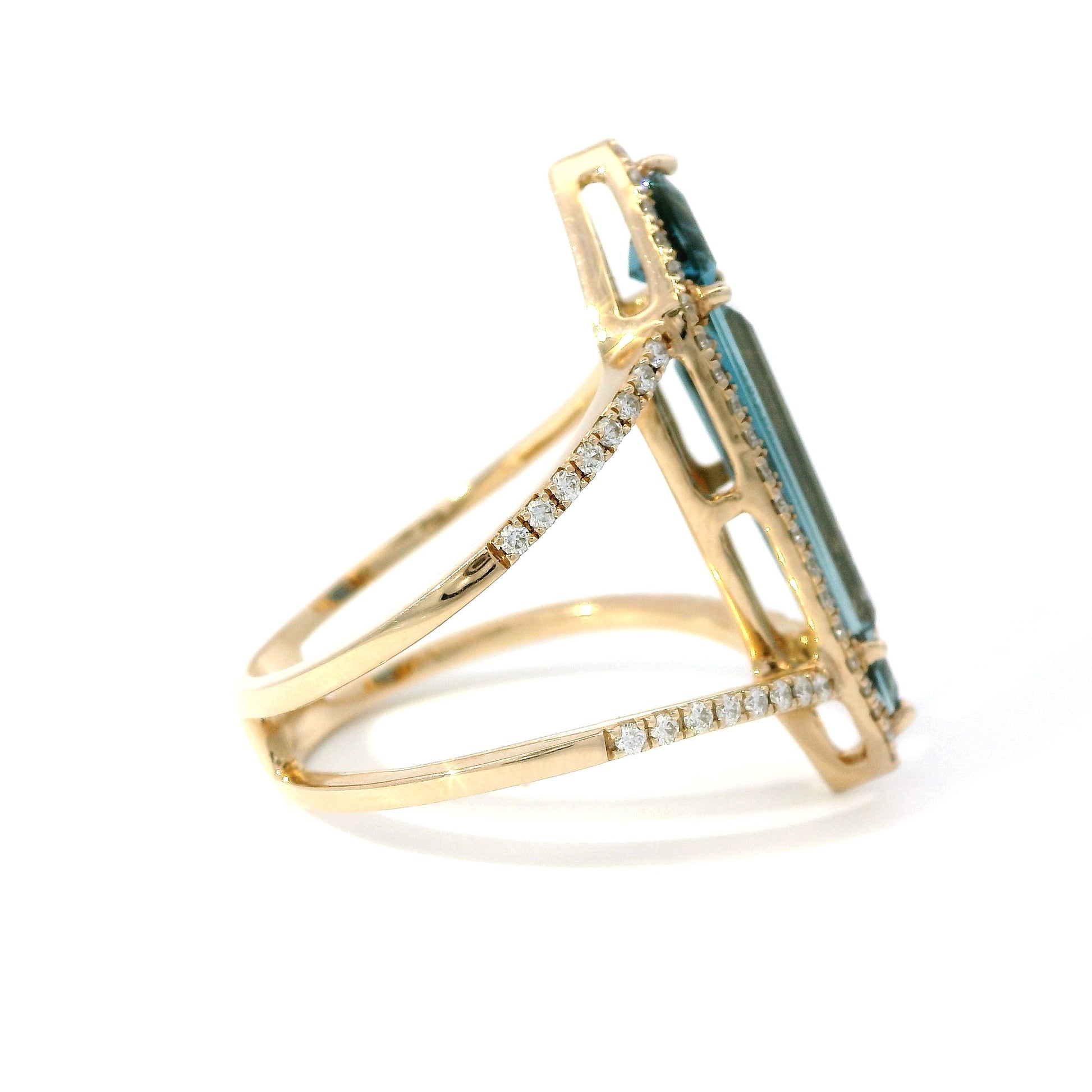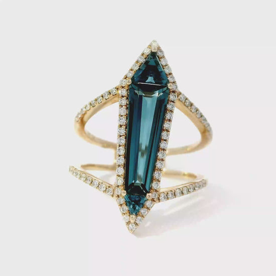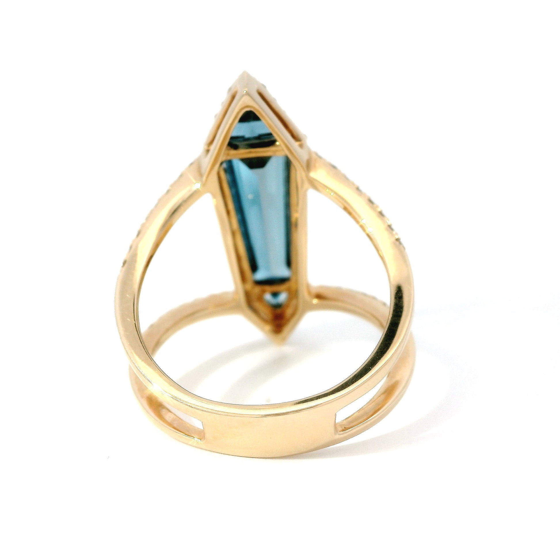 Bold, sculptural, and impossible to overlook — this piece makes a statement. Crafted in 14K rose gold, the ring features an elongated geometric-cut London blue topaz, perfectly faceted to draw the eye straight into its vivid, ocean-deep color.