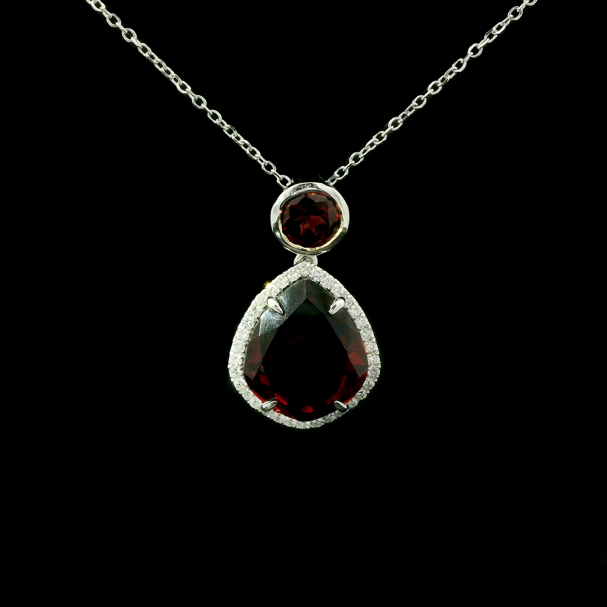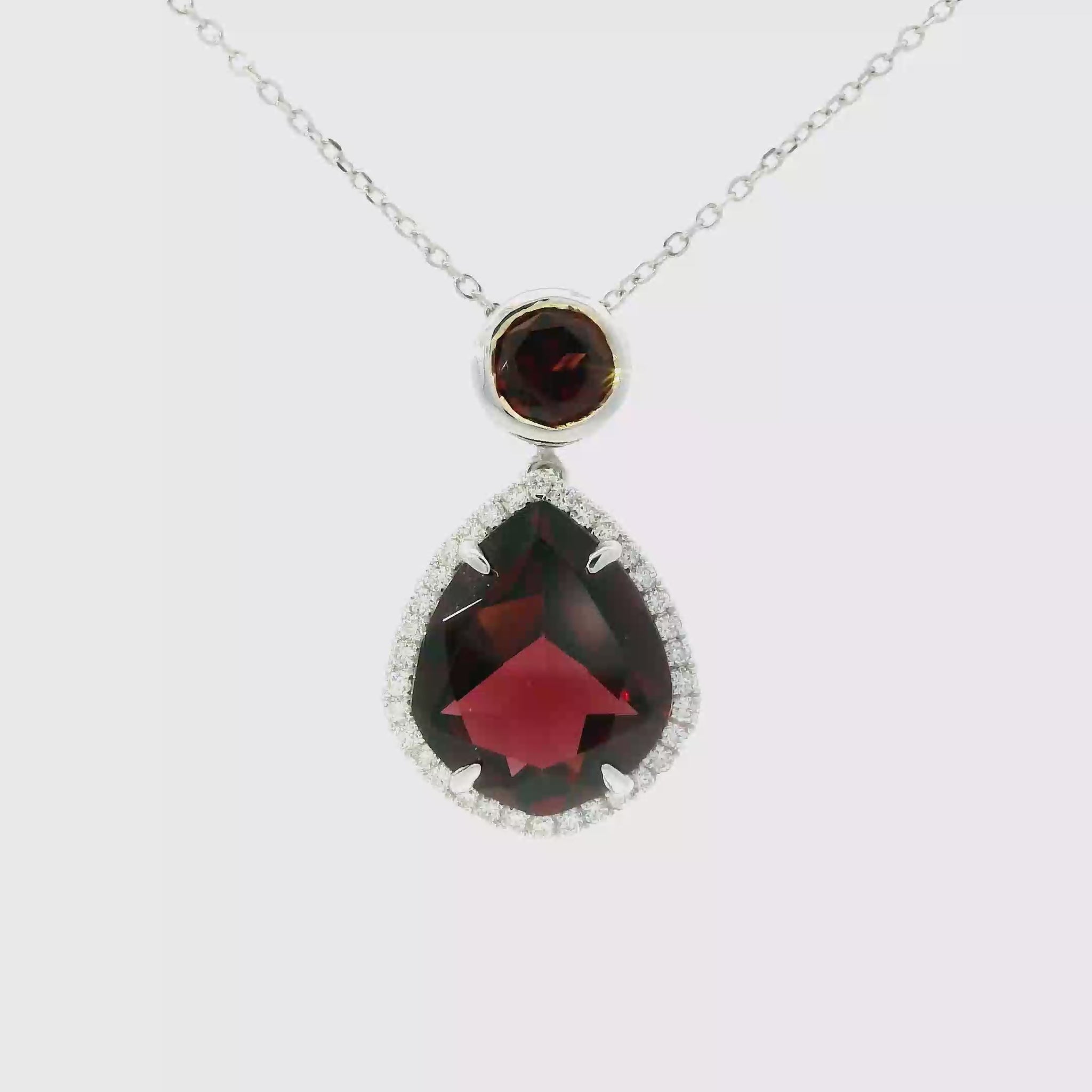 A rich, captivating pop of color — this Diamondaire pendant features two natural deep-red garnets, elegantly stacked for a luxurious drop effect. The top round garnet glows warmly in a sleek bezel, while the larger pear-shaped garnet below is wrapped in a shimmering halo of natural diamonds that light up every angle.