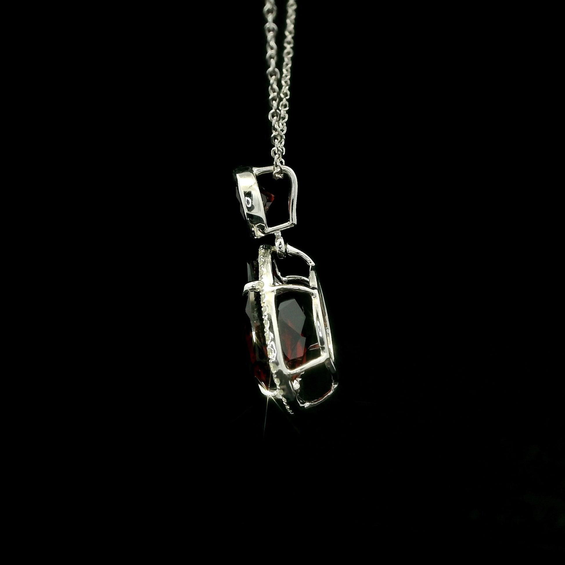 Crafted in 14K white gold, this piece feels both modern and timeless. The contrast between the dark garnet fire and the bright diamond sparkle creates a striking, romantic look that stands beautifully on its own or layers seamlessly with your everyday favorites. A true statement of bold elegance — ready to cherish and ready to gift. This also is made with a diamond cut link chain that is to adjustable 16-18" and a strong lobster clasp.
