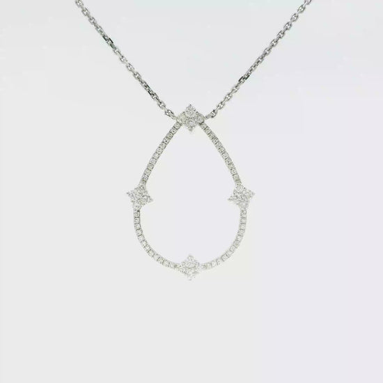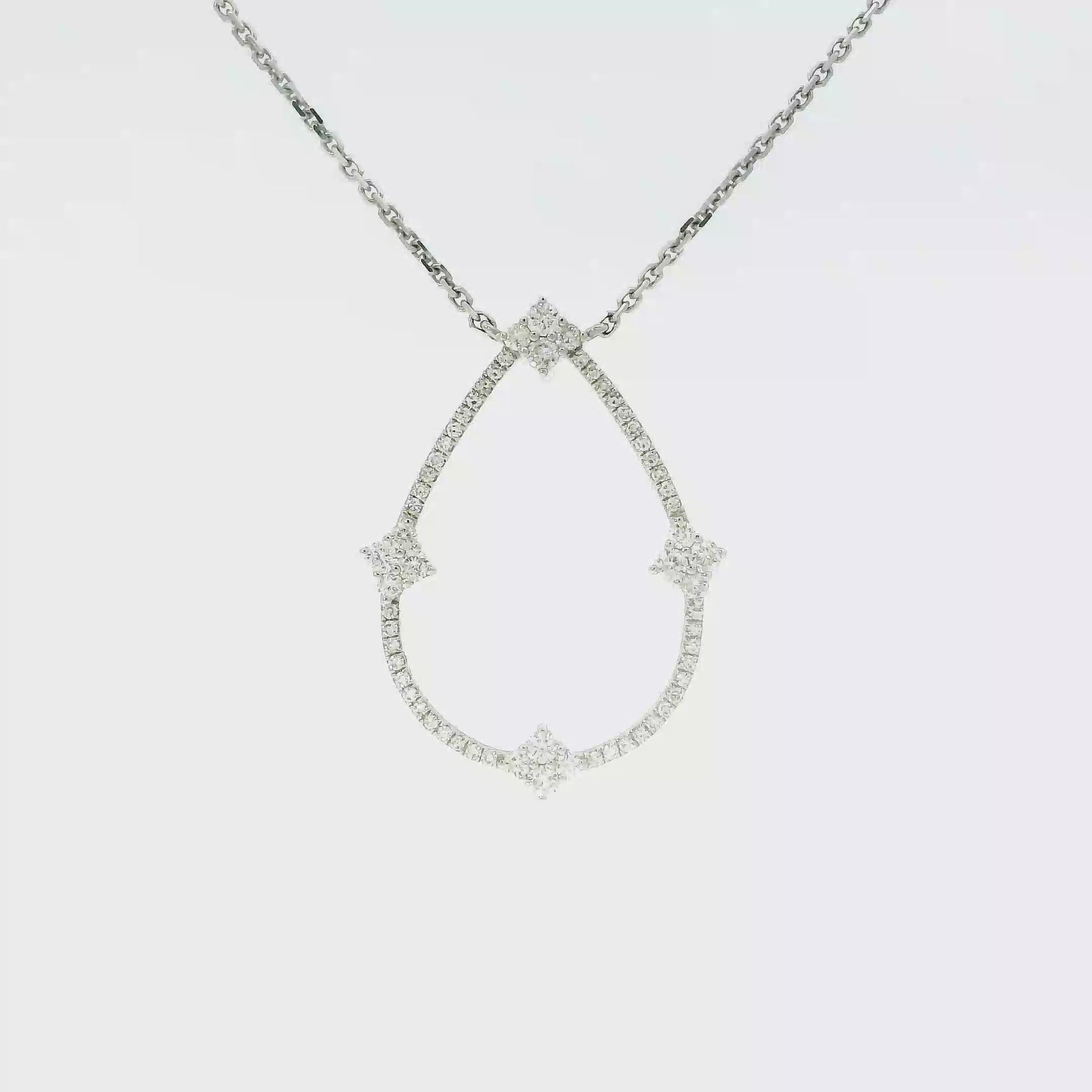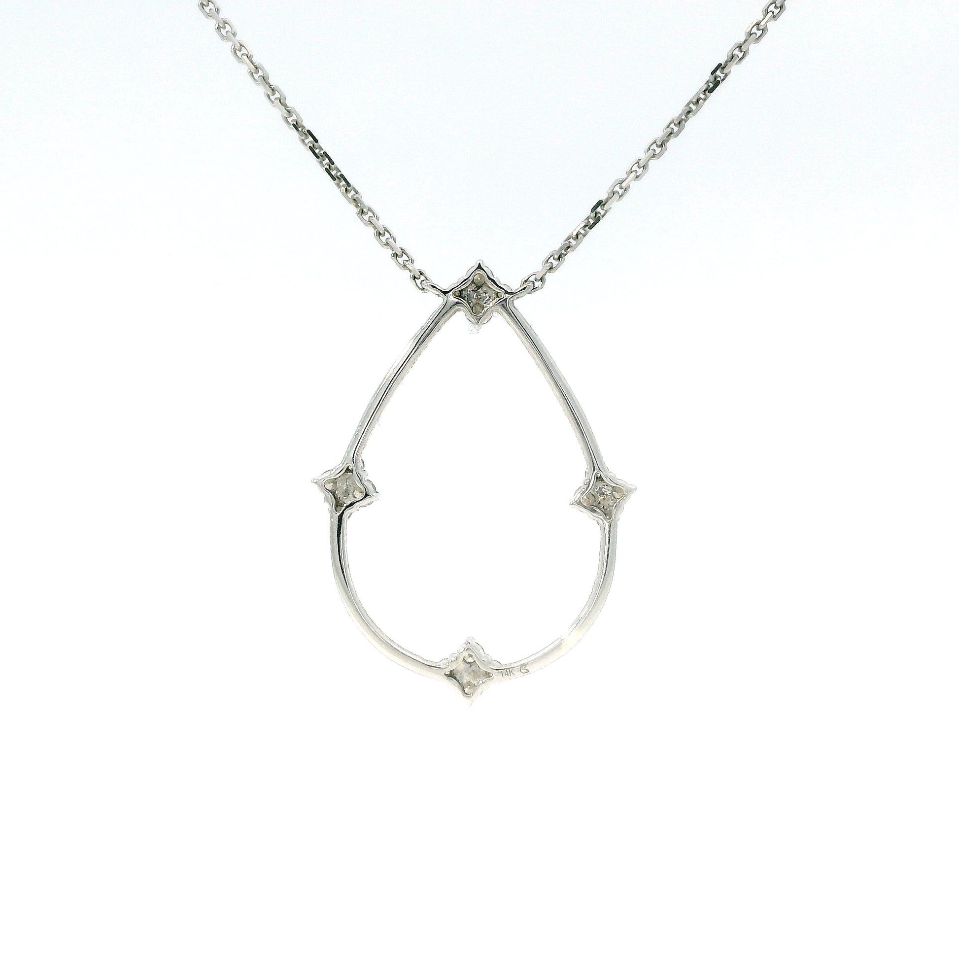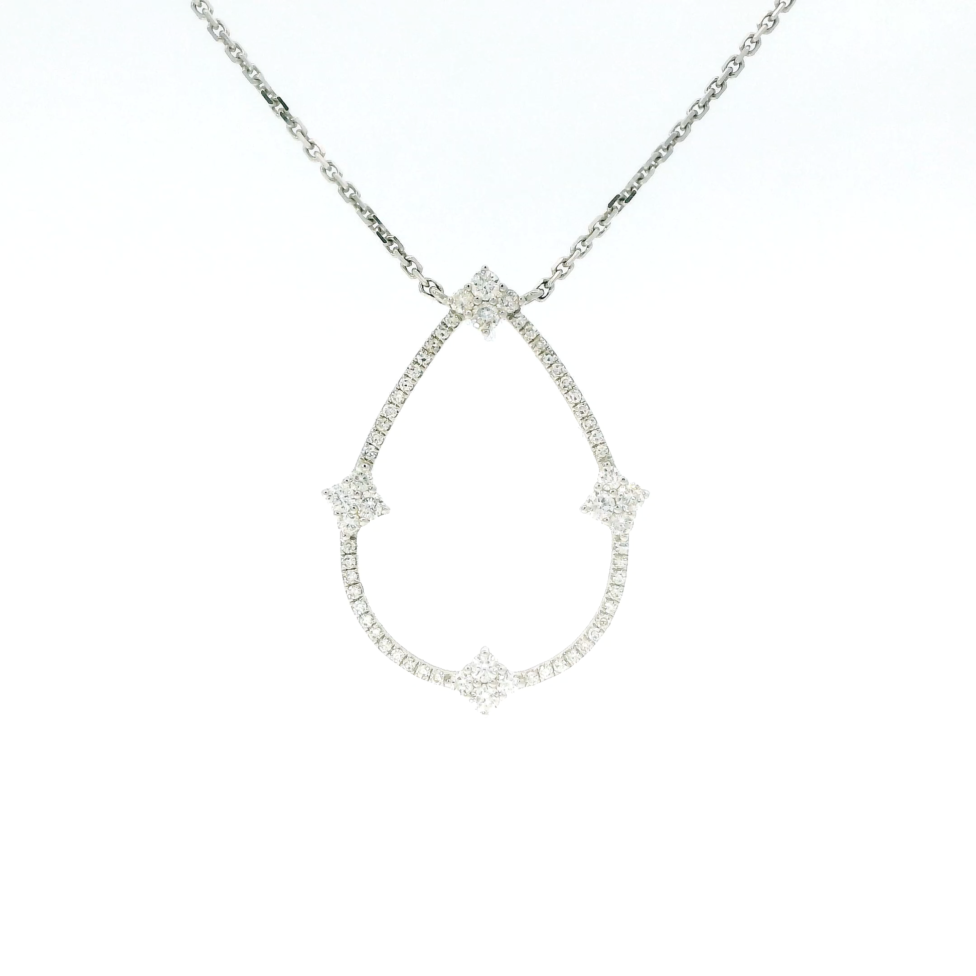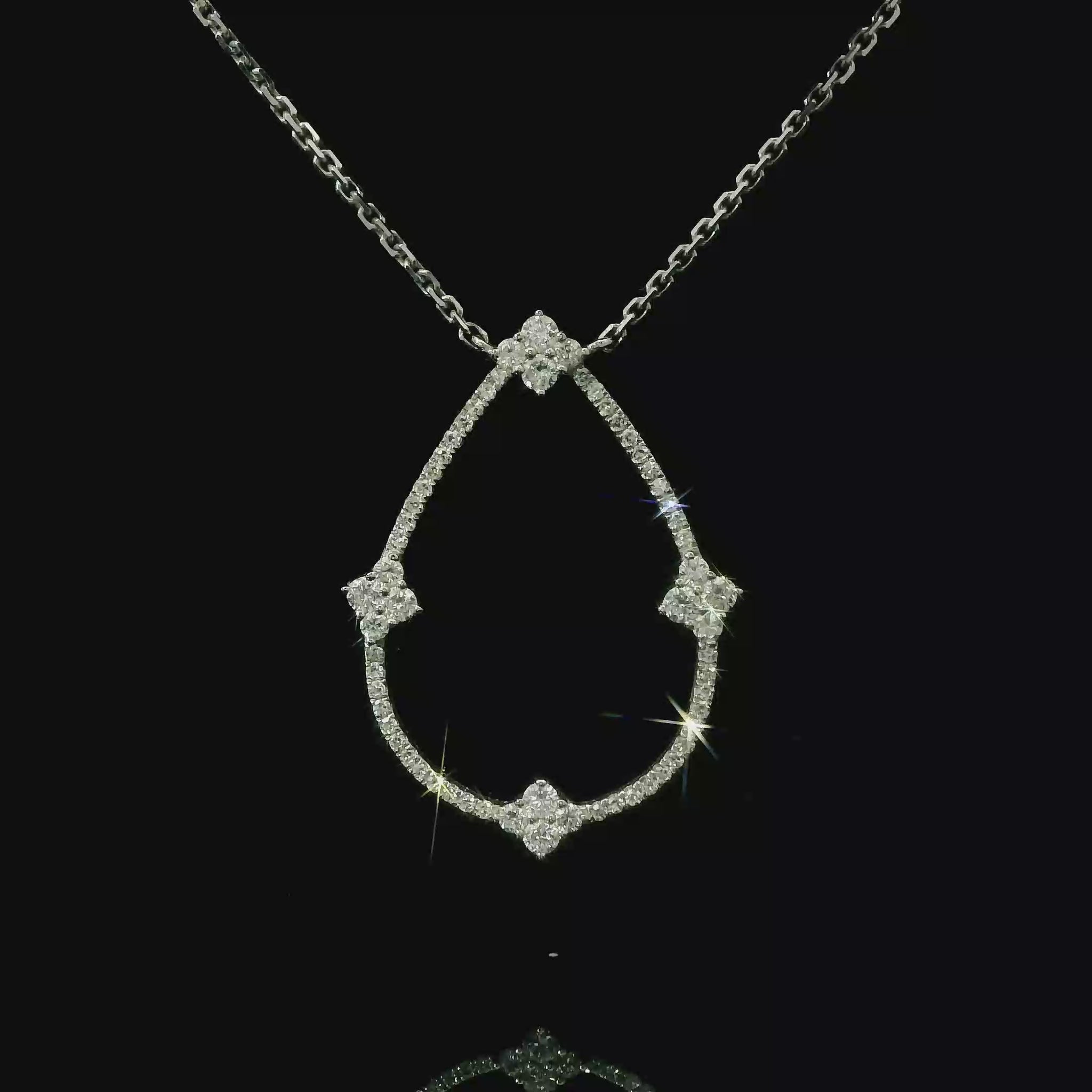 Delicate, airy, and endlessly elegant — this Diamondaire pendant brings sparkle to every curve. The design features a graceful pear-shaped diamond outline, completely traced in natural round brilliant diamonds for a soft, fluid shimmer. Four diamond clusters accent the silhouette, adding a point of focus and giving the piece that boutique, couture feel you’re known for.