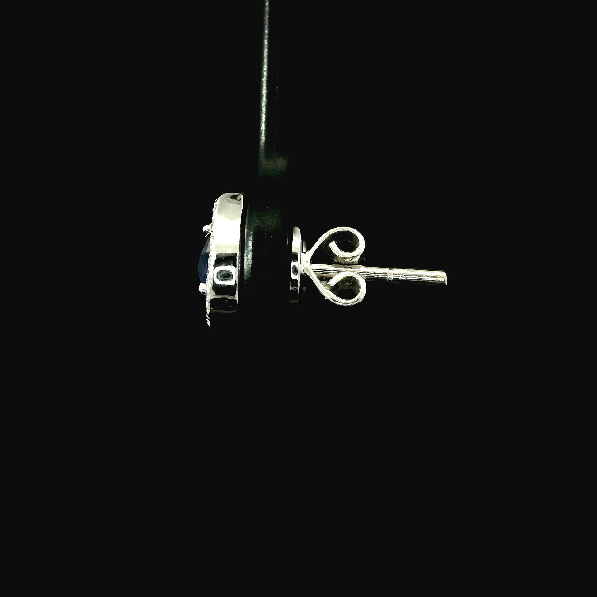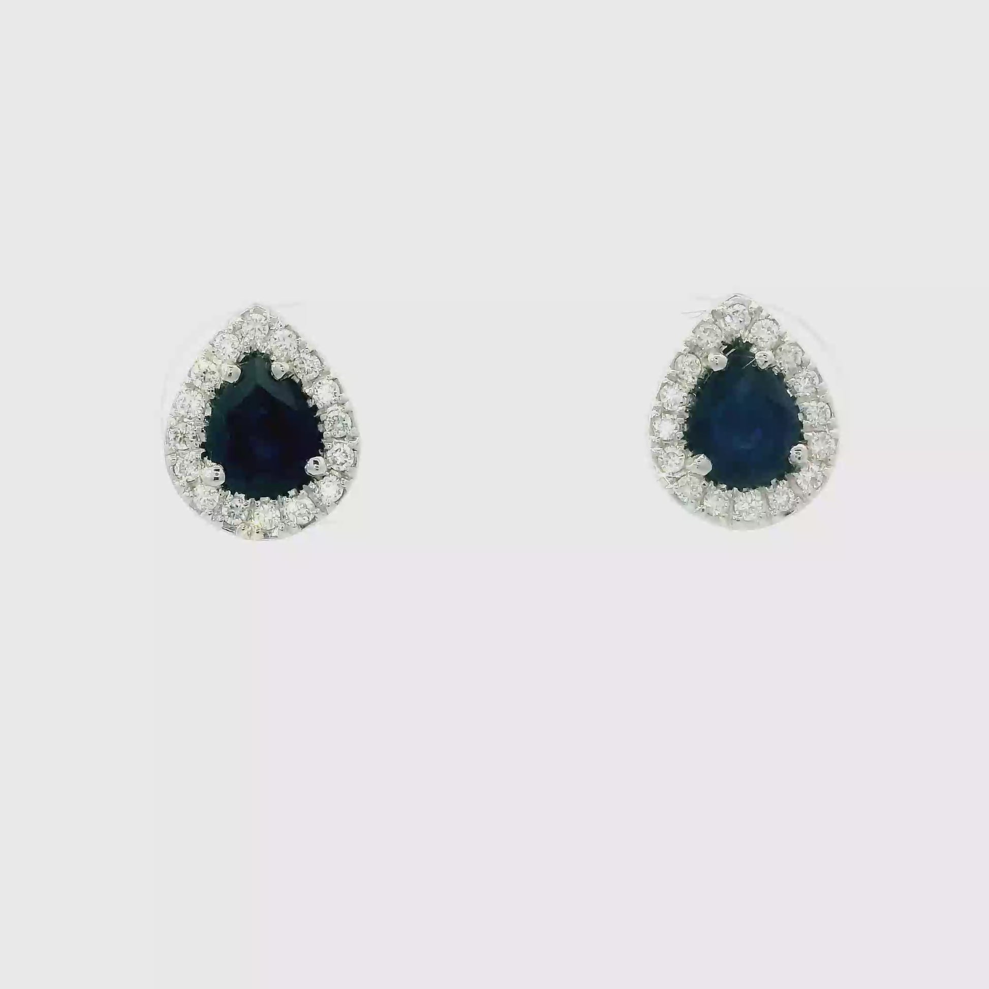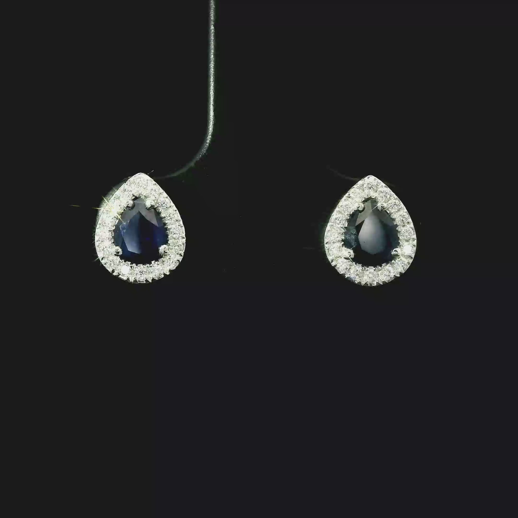 Classic elegance meets deep, velvety color. These Diamondaire earrings feature pear-shaped natural blue sapphires, each wrapped in a bright diamond halo. The contrast is breathtaking — the midnight-blue center stones glow beautifully against the crisp sparkle of hand-set diamonds.