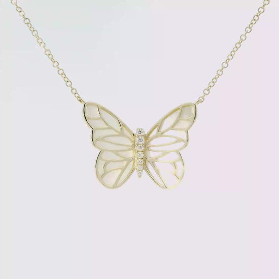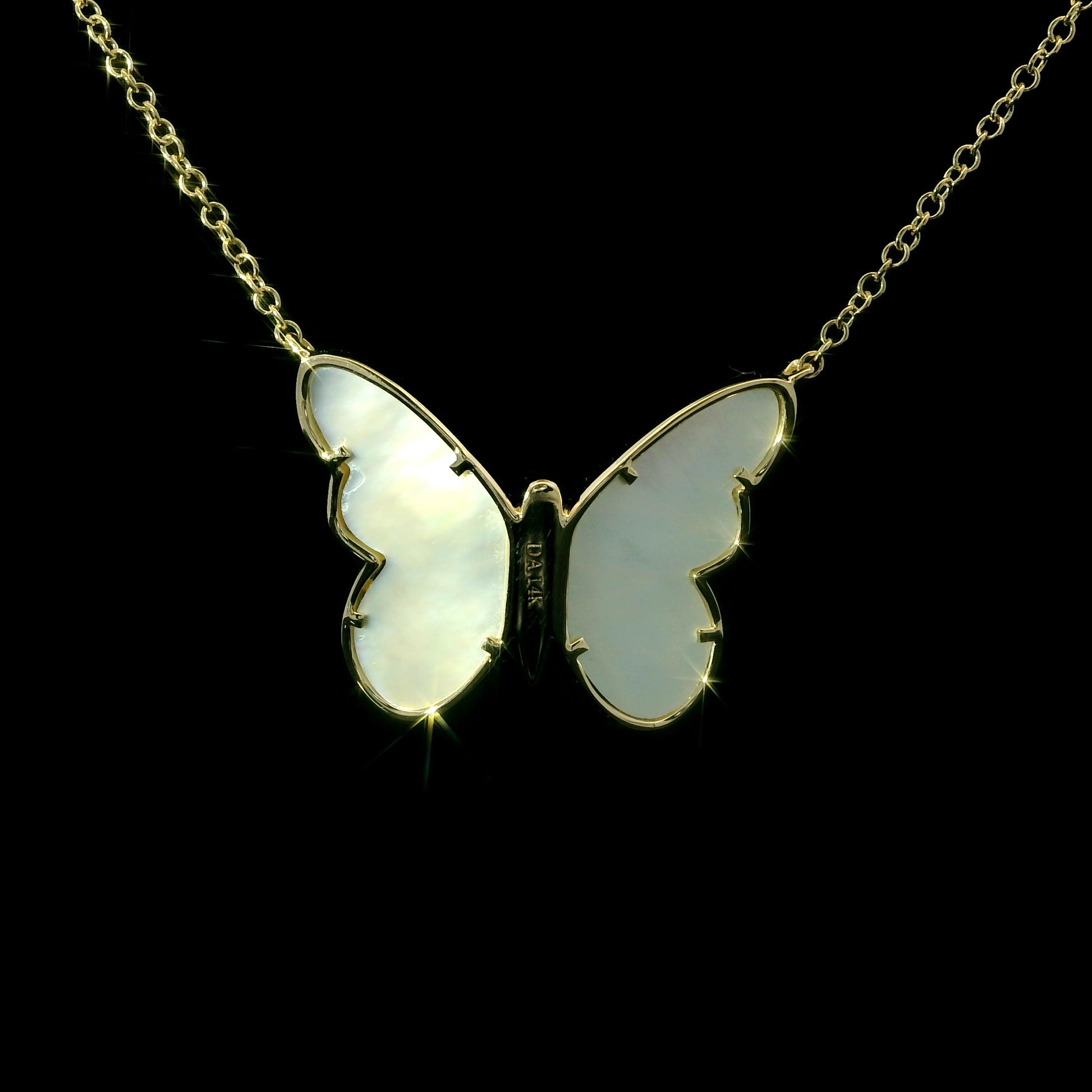 This diamond butterfly necklace features luminous mother-of-pearl wings outlined in polished gold, with a vertical row of sparkling diamonds forming the butterfly’s body. Delicate yet eye-catching, the design captures movement, light, and meaning all at once.