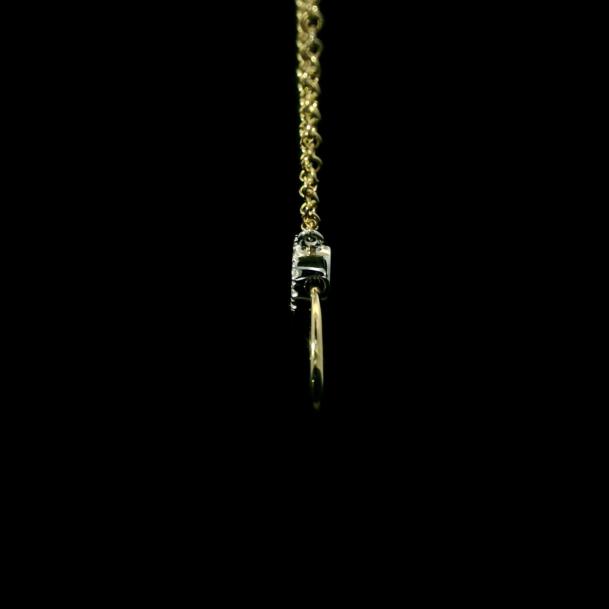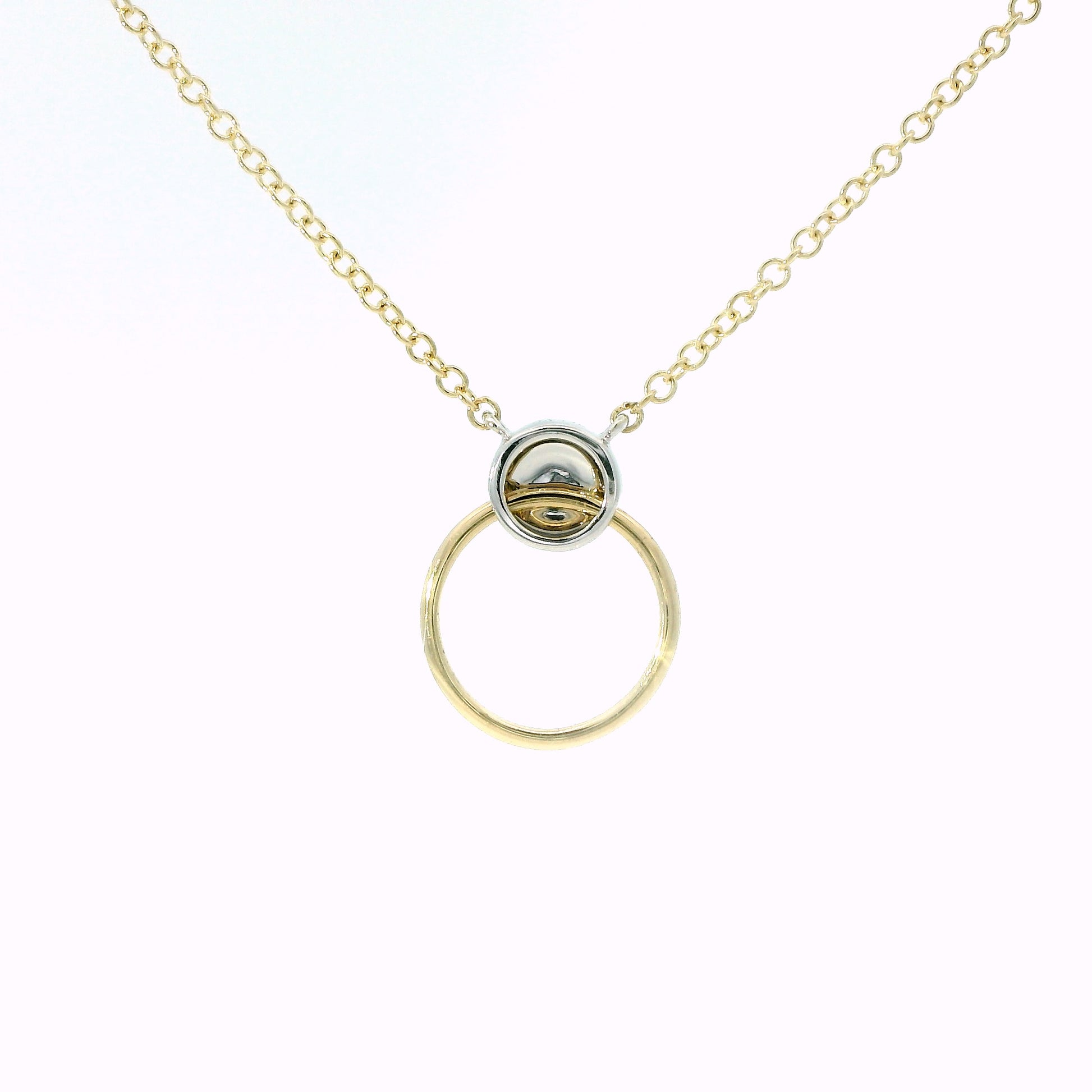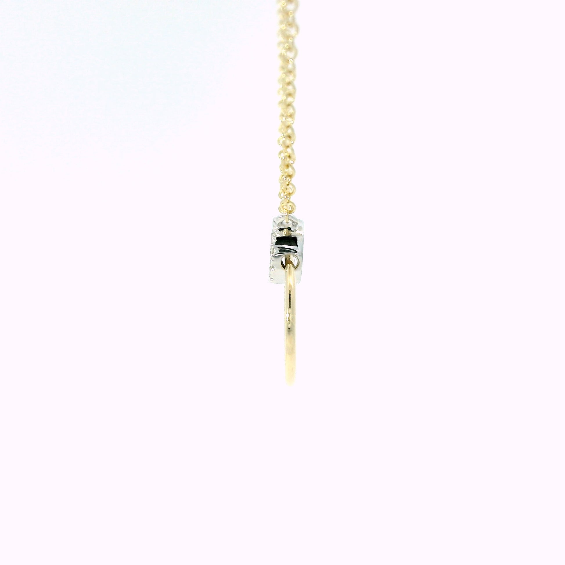 This necklace pairs a softly sparkling pavé diamond disc with a polished open gold circle that floats just below. It’s the kind of piece that doesn’t try to steal the spotlight — it creates it.