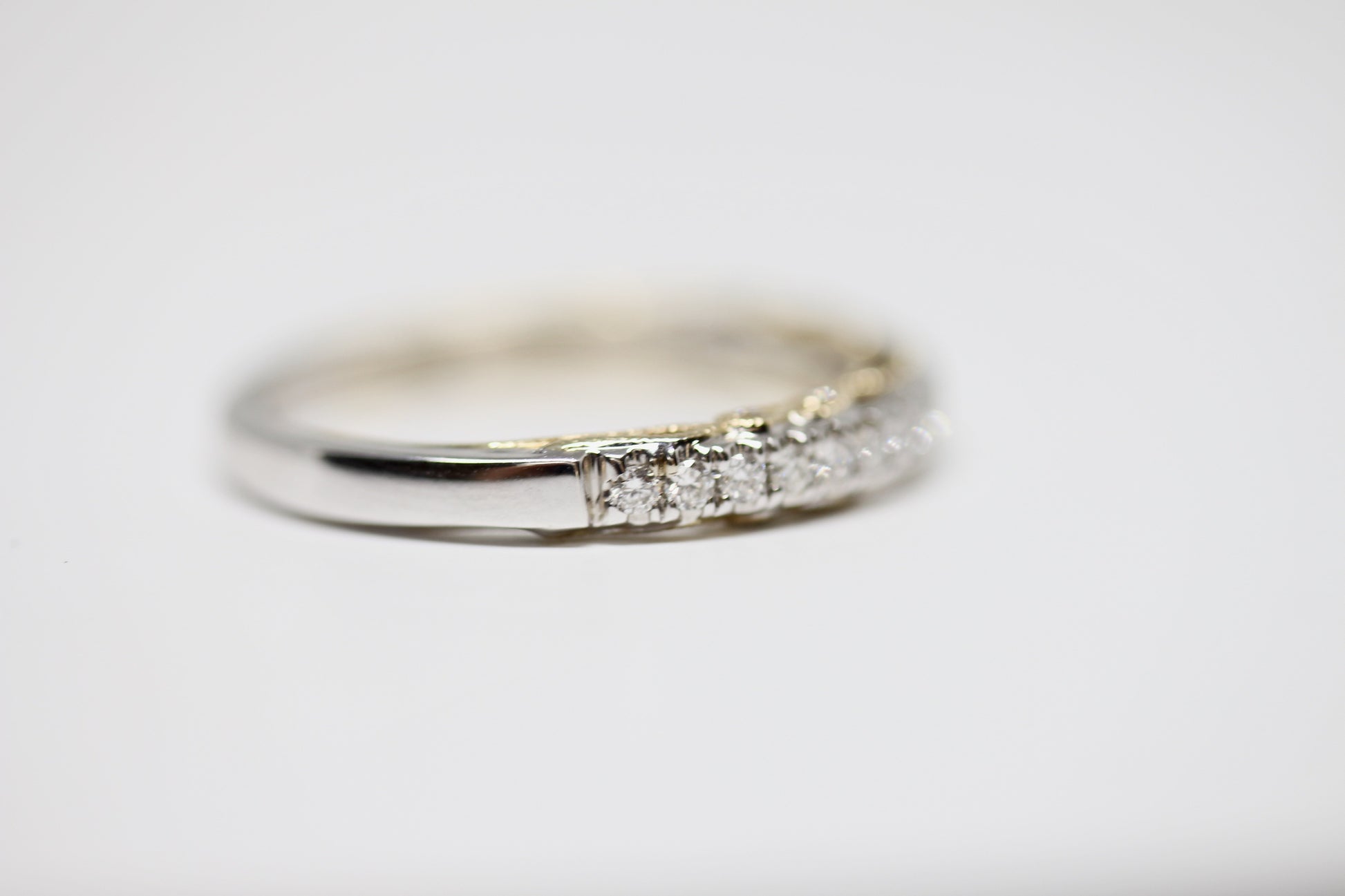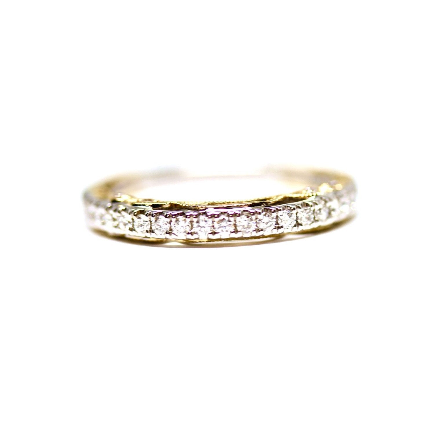 This wedding band has 28 round brilliant cut diamonds shared prong set on top and a total of 8 round brilliant cut diamonds underneath that can only be seen from the sides. The sides are in 14k yellow gold and have a mil-grain design with open space for an added vintage look. Very beautiful and unique.