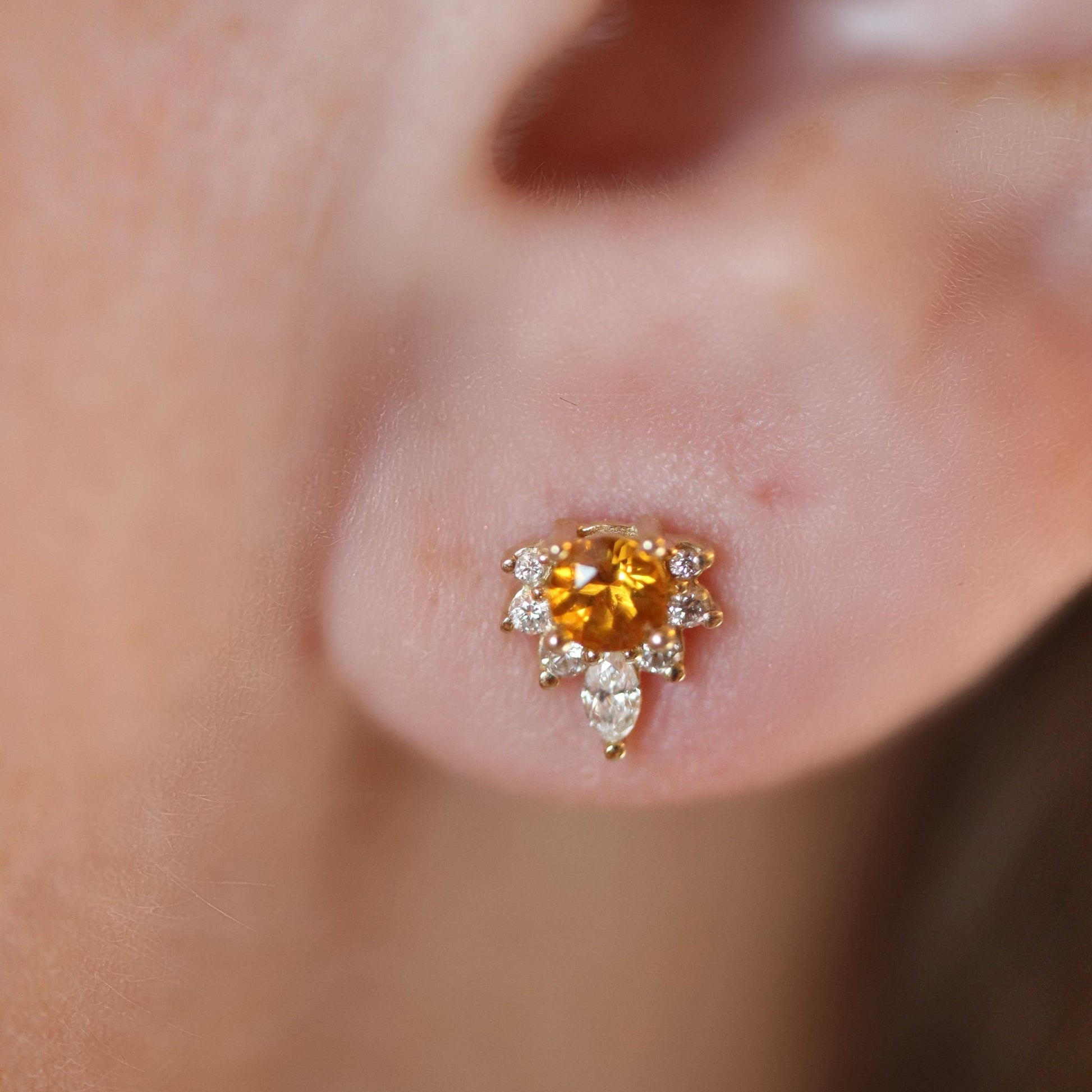 These earrings have 12 round brilliant-cut graduated diamonds and 2 Marquise cut diamonds half surrounding 2 matching round genuine citrines. Currently, these earrings are available for next day delivery in 14kt yellow gold but if you would like it in another metal or gemstone, please call/text us at (630) 355-7464 for the availability time frame.