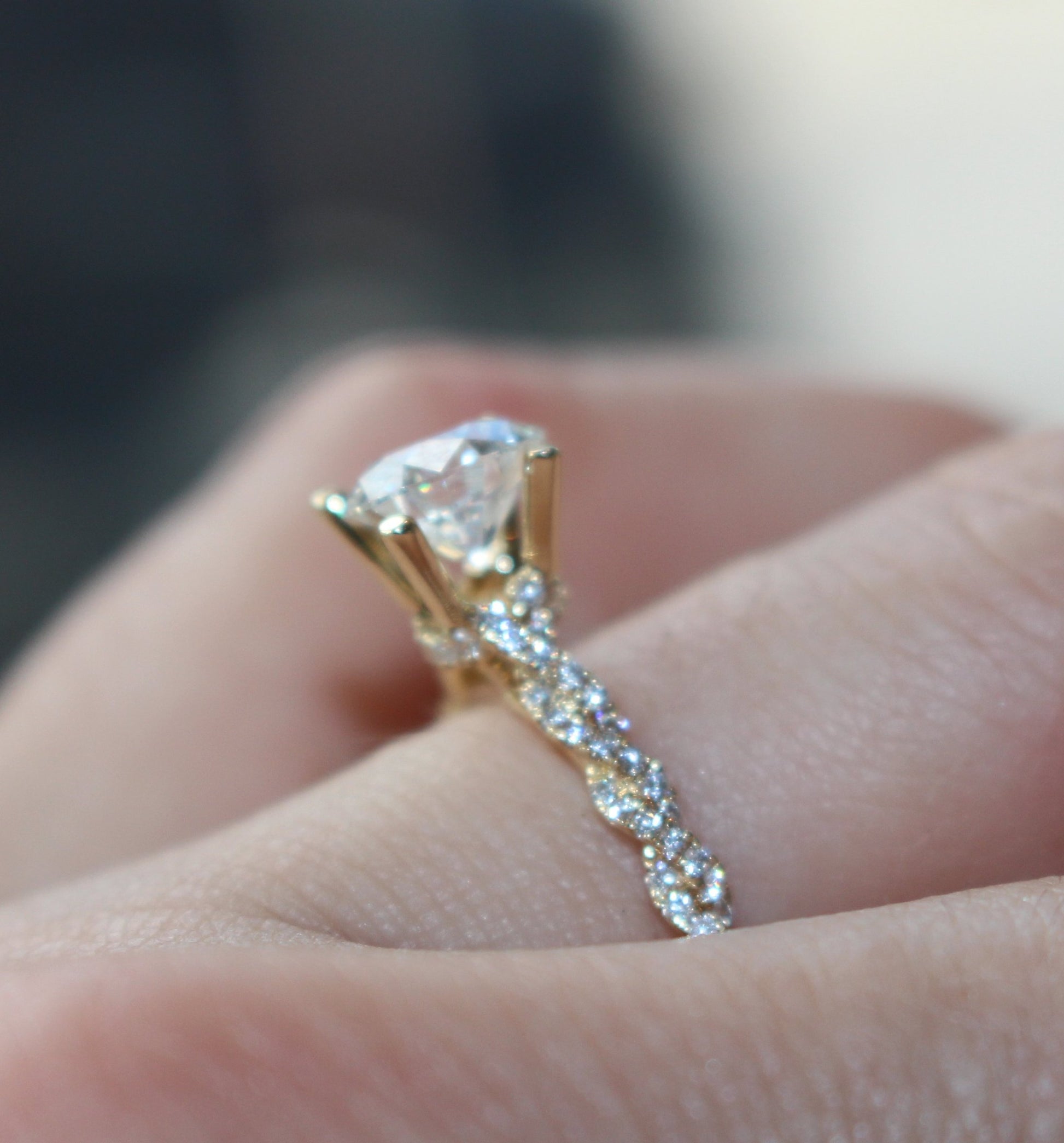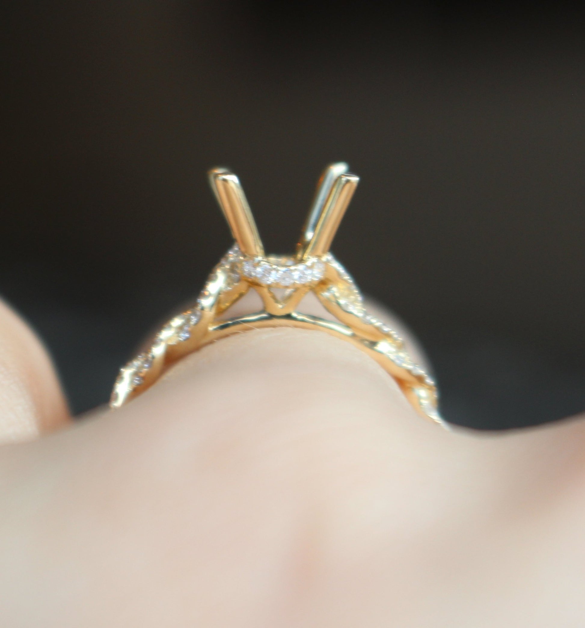 This shared prong tight twist engagement ring features 56 round brilliant cut diamonds that climb up the shank. The center is able to hold any size or shape diamond. Currently, this setting is available for next day delivery in yellow gold but if you would like it in another metal, please call/text us at (630)355-7464 for availability time frame.