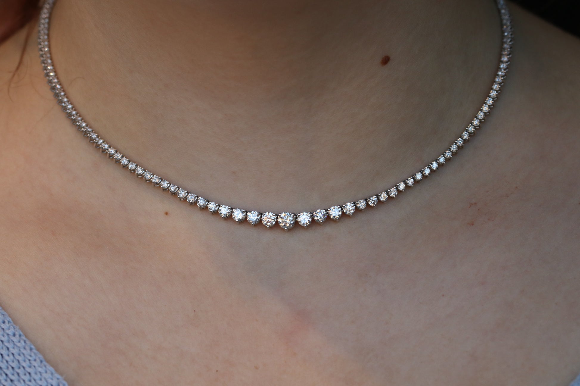 This is one of those necklaces that when you put it on, you don't want to take it off. It is 16" in Length and has 151 round brilliant cut diamonds that graduate in the front with a total carat weight of 10.08cts. This necklace can be layered with others or worn alone. The locking clasp on the back makes sure that it is secure and comfortable.