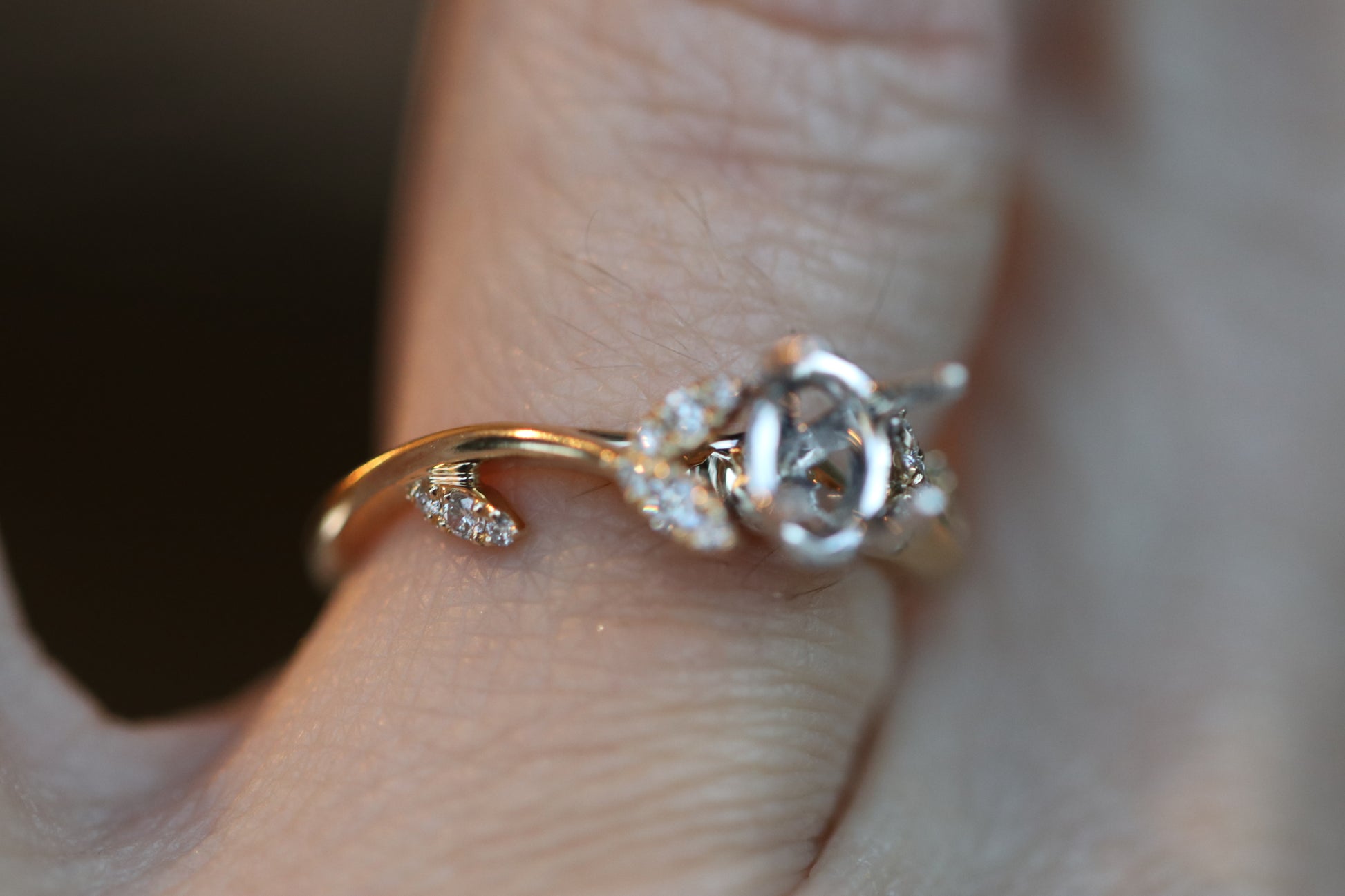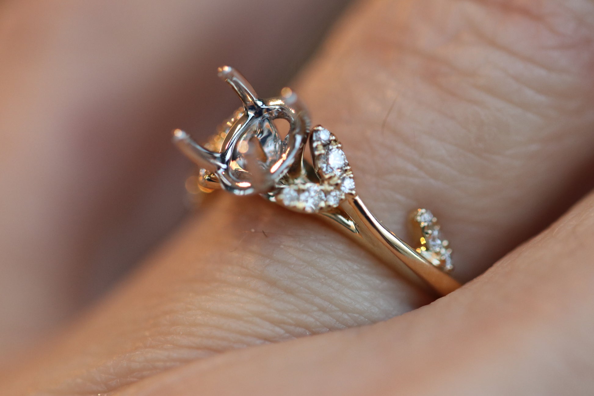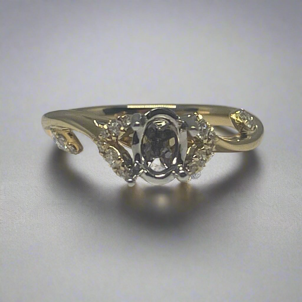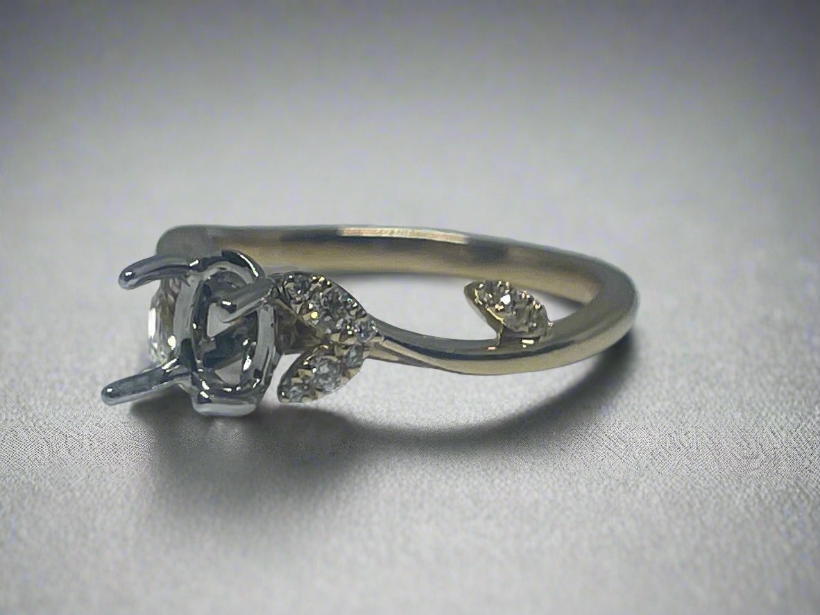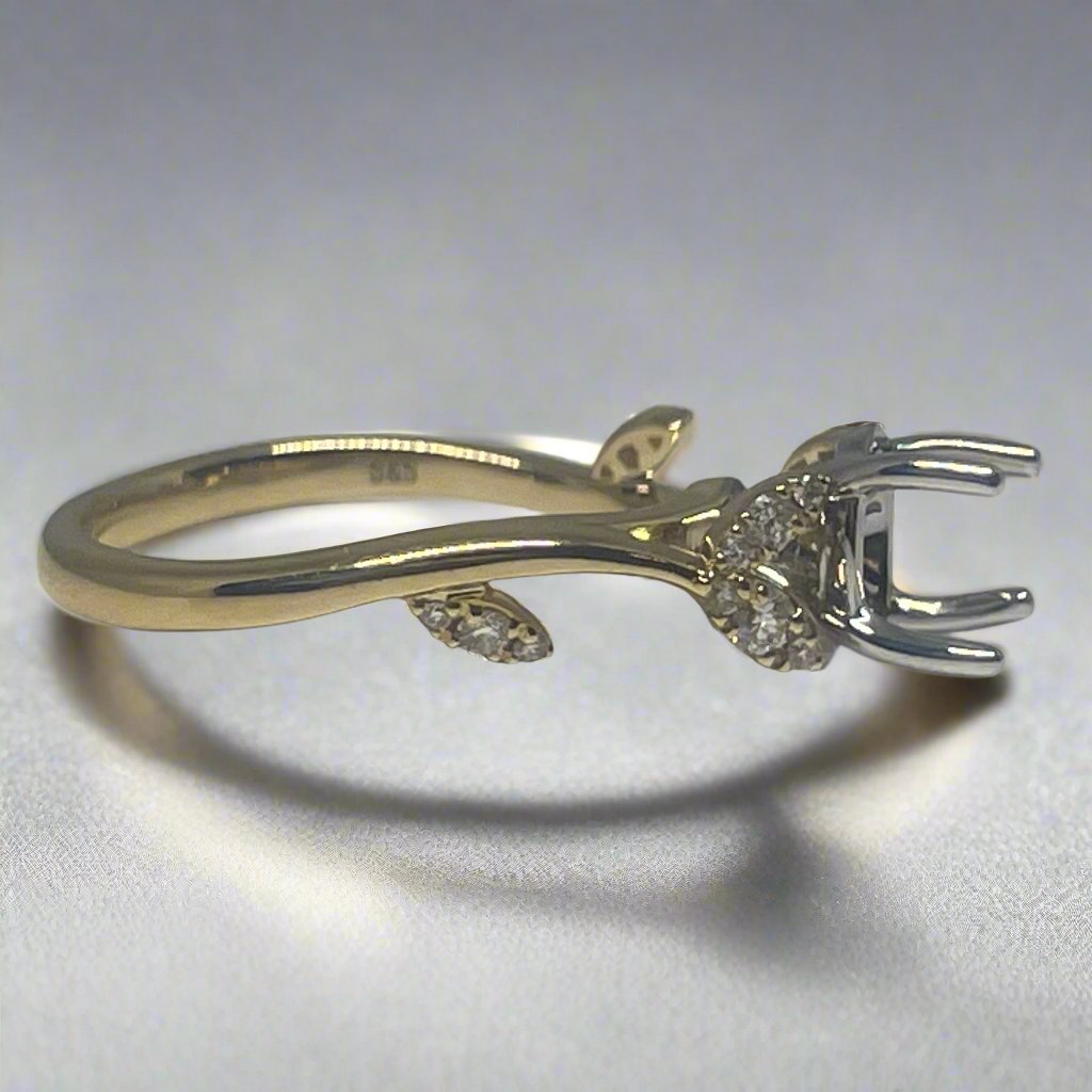 Celebrate your love with this enchanting leaf and vine diamond engagement ring mounting, a perfect blend of nature-inspired beauty and timeless elegance. Crafted in polished 14kt gold, the band gracefully curves with delicate leaf and vine motifs, symbolizing growth and everlasting love.