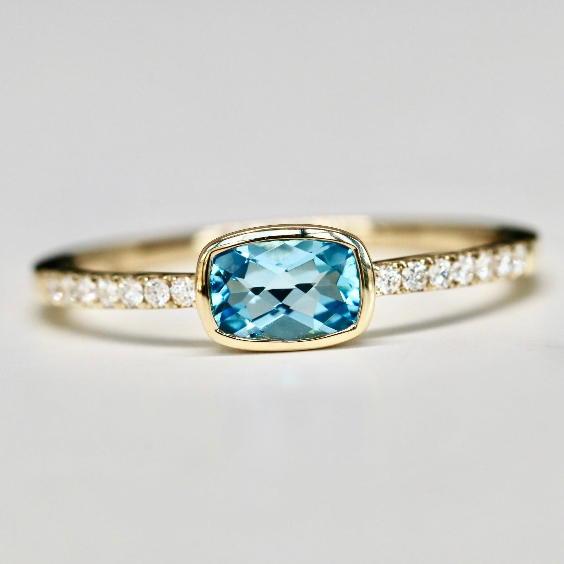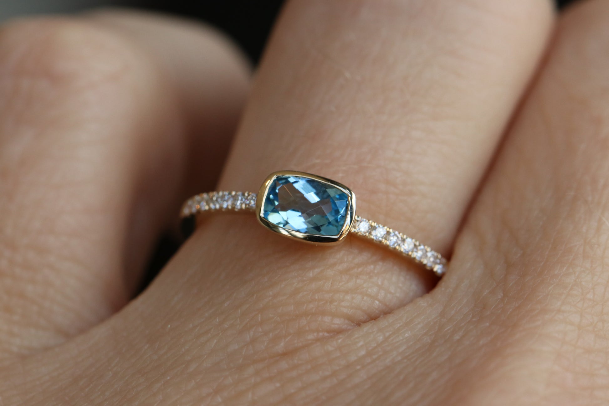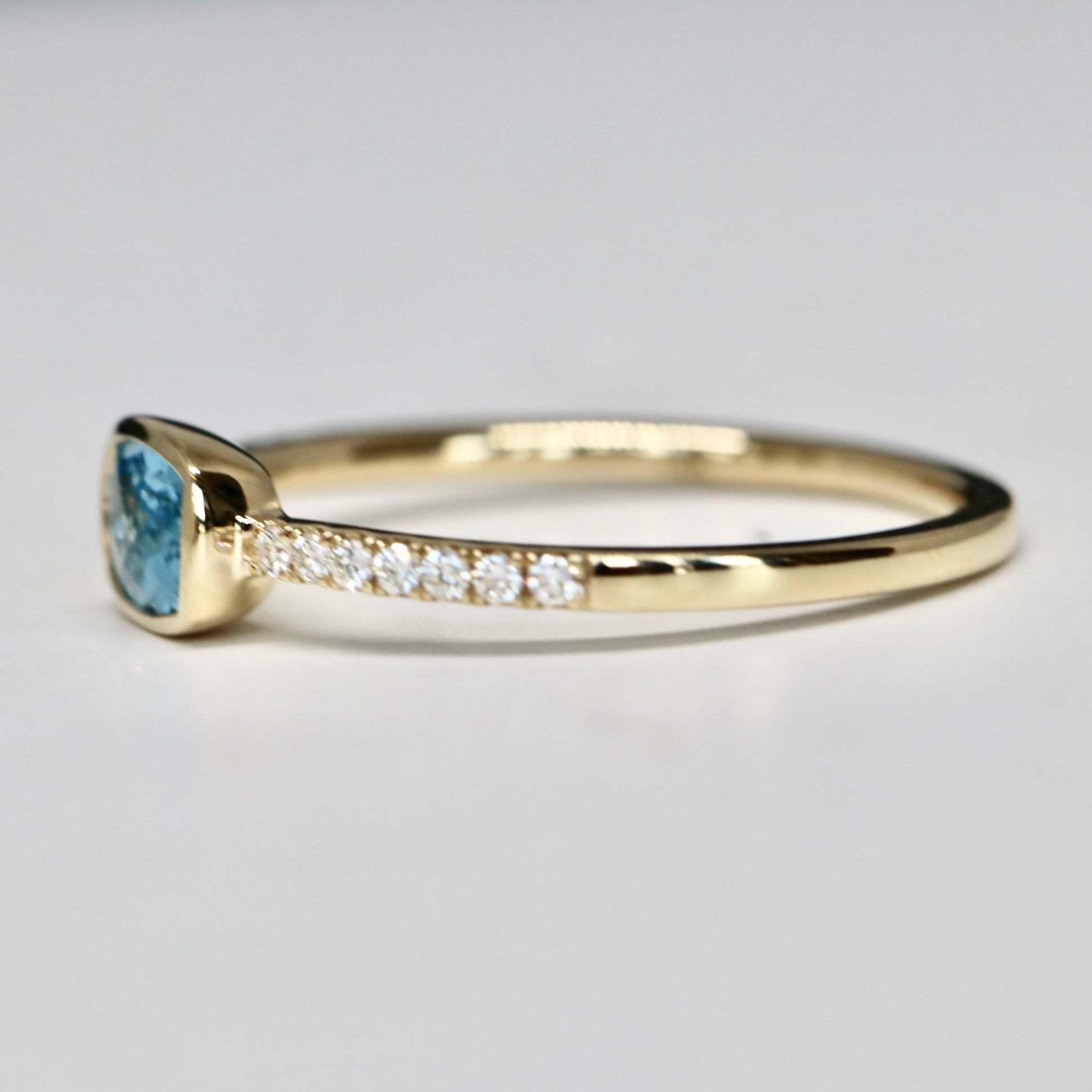 Bezel Set Blue Zircon Checkerboard Cushion Cut and Diamond ring in Solid 14k Gold