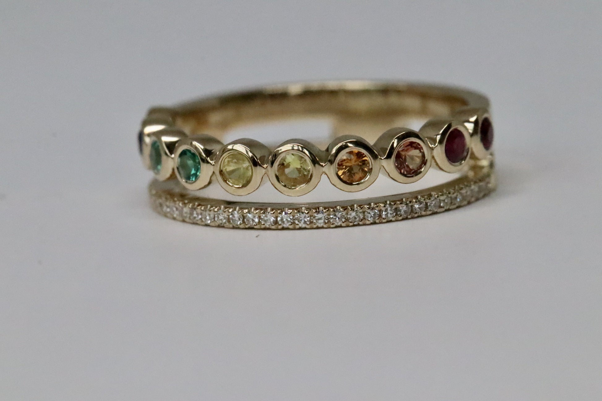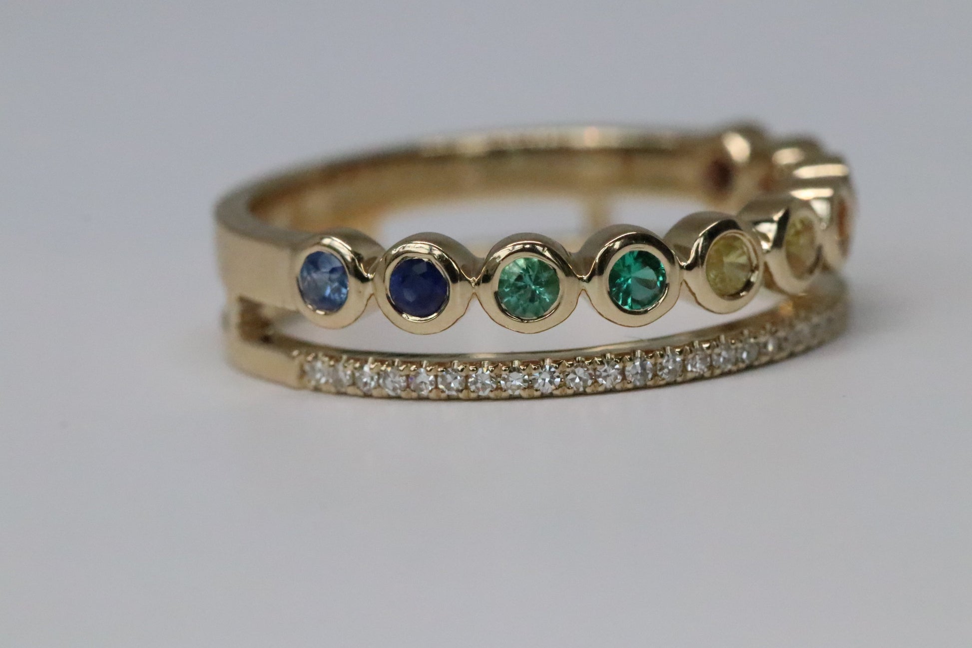 This ring is super fun, comfortable, and VERY unique. It has one row of 30 round brilliant cut diamonds that equal 0.10tcw shared prong set. Then it has a second row of 10 multi-color round-cut sapphires bezel set that equals 0.40tcw.