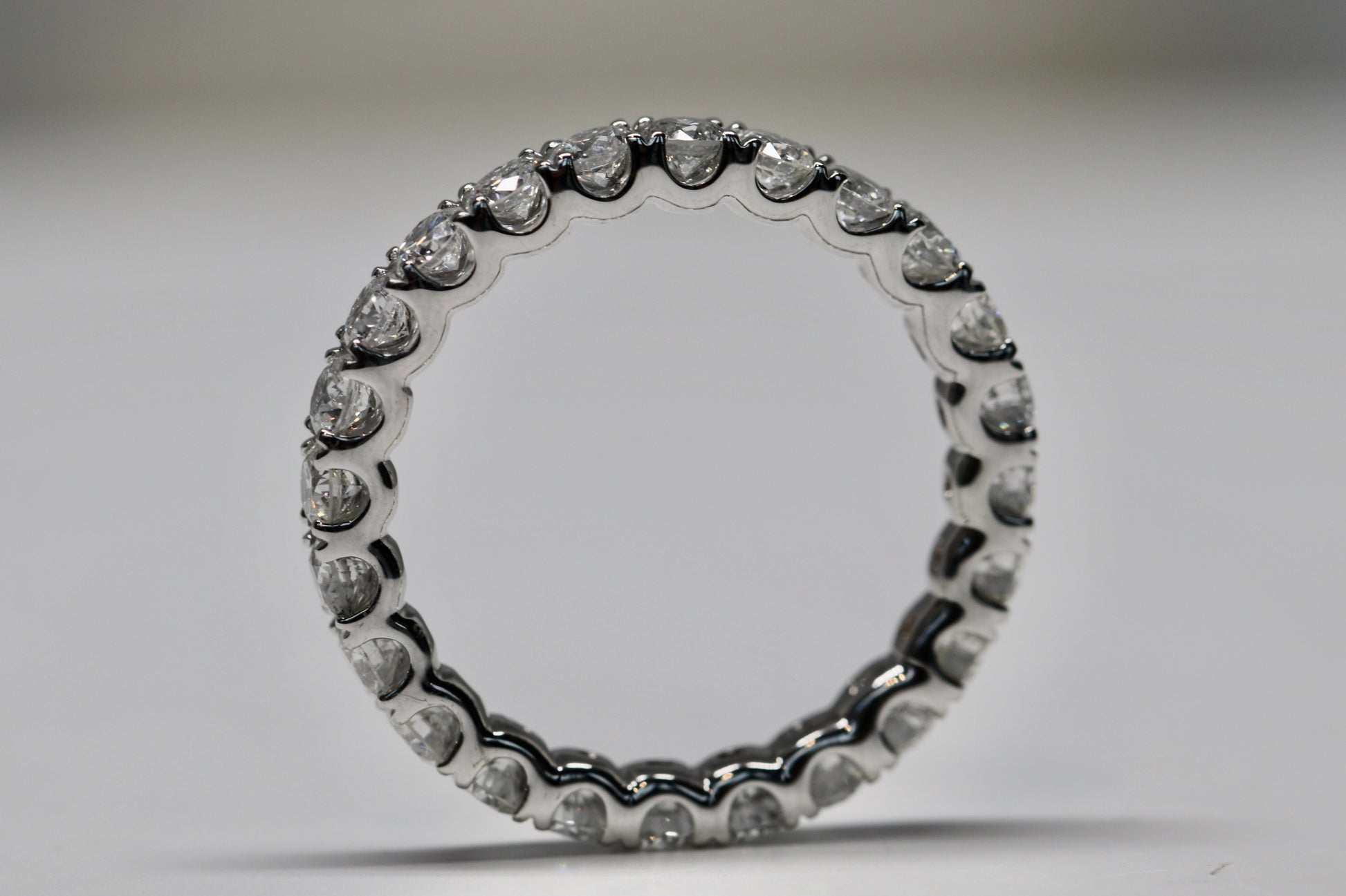 This eternity diamond wedding band has a low profile and sparkles like crazy. Each diamond is u-shaped shared prong set, meaning lots of light comes in through the sides and helps the 24 round brilliant cut diamonds sparkle even more.