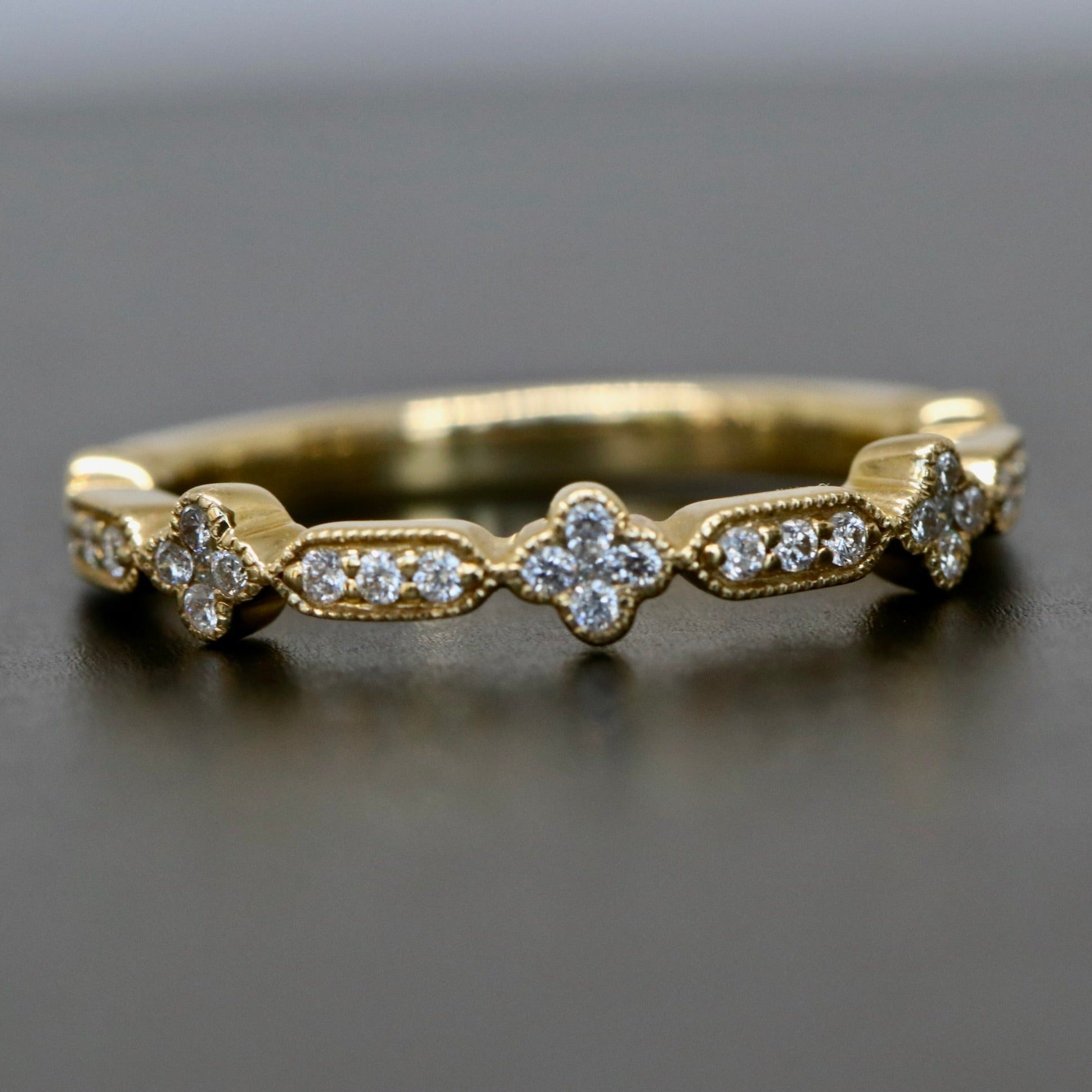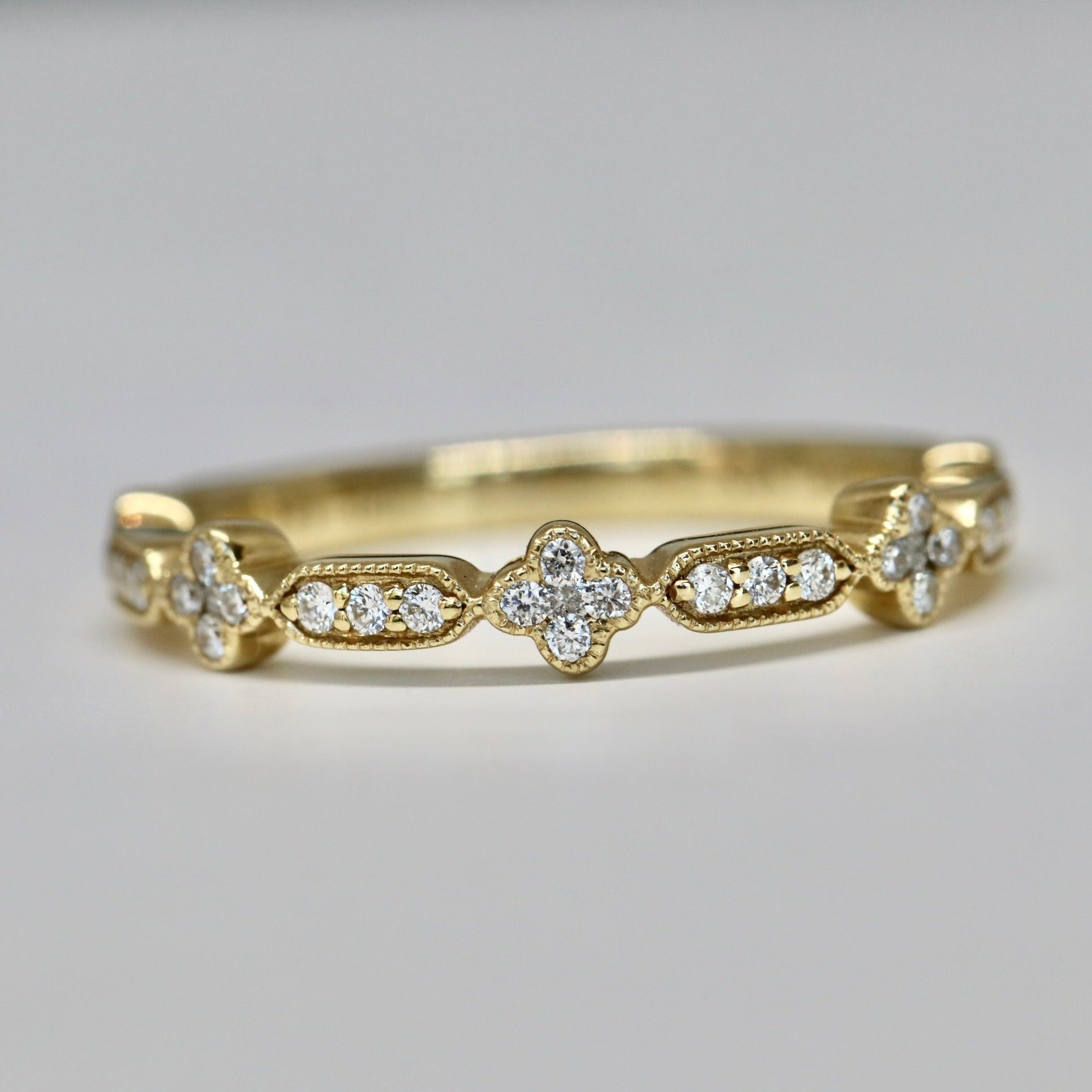 This stackable ring has 3 clover designs alternating with a straight row of diamonds. It is a very pretty and unique style that can also be worn as a wedding band with certain style engagement rings.