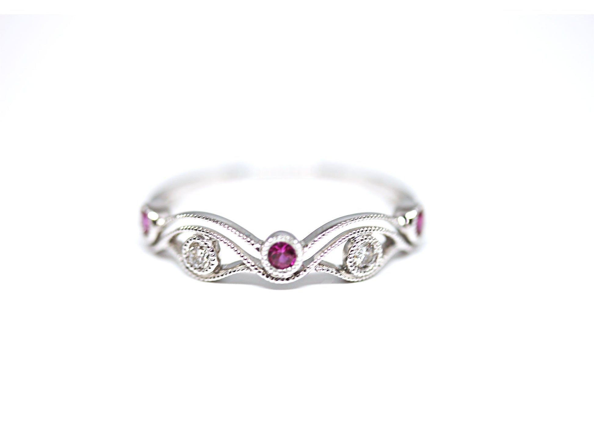 This stackable has 2 round brilliant cut diamonds alternating with 3 Round Rubies. Each stone is bezel set with a mil-grain surrounding them with a unique wavy design.