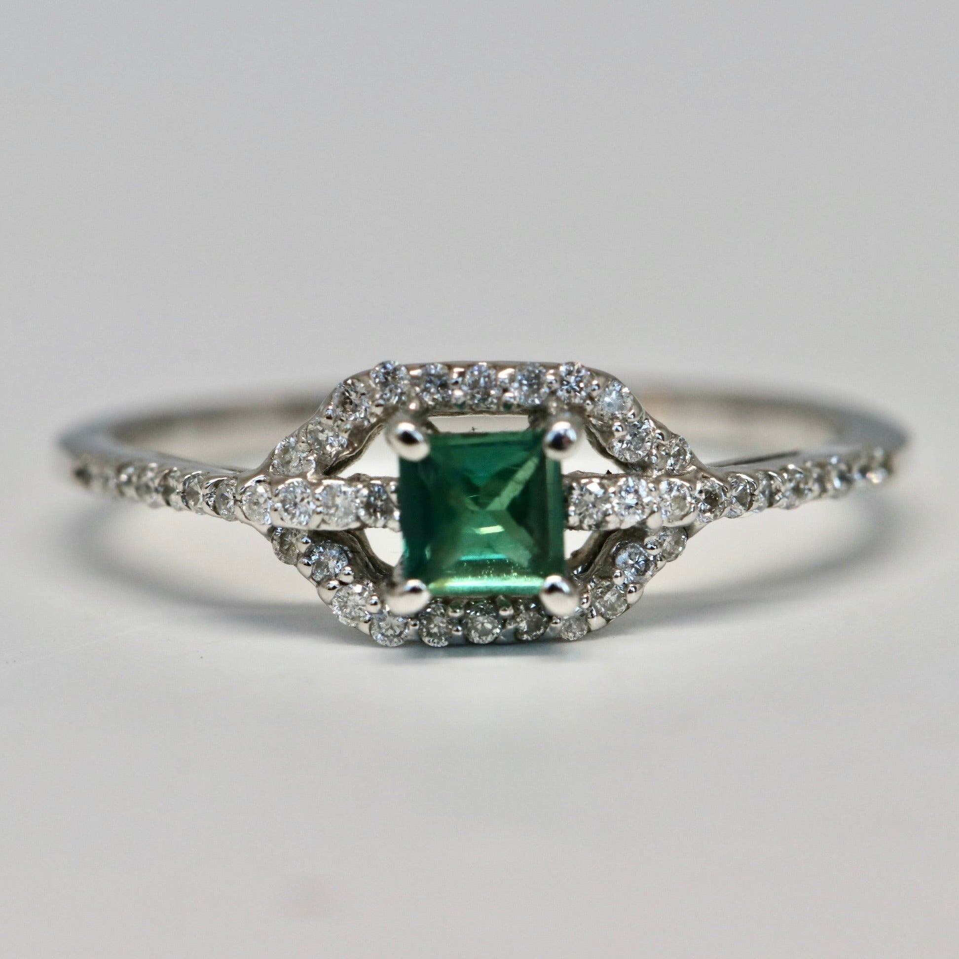 This ring has a princess cut Alexandrite center surrounded by a diamond geometric halo style.