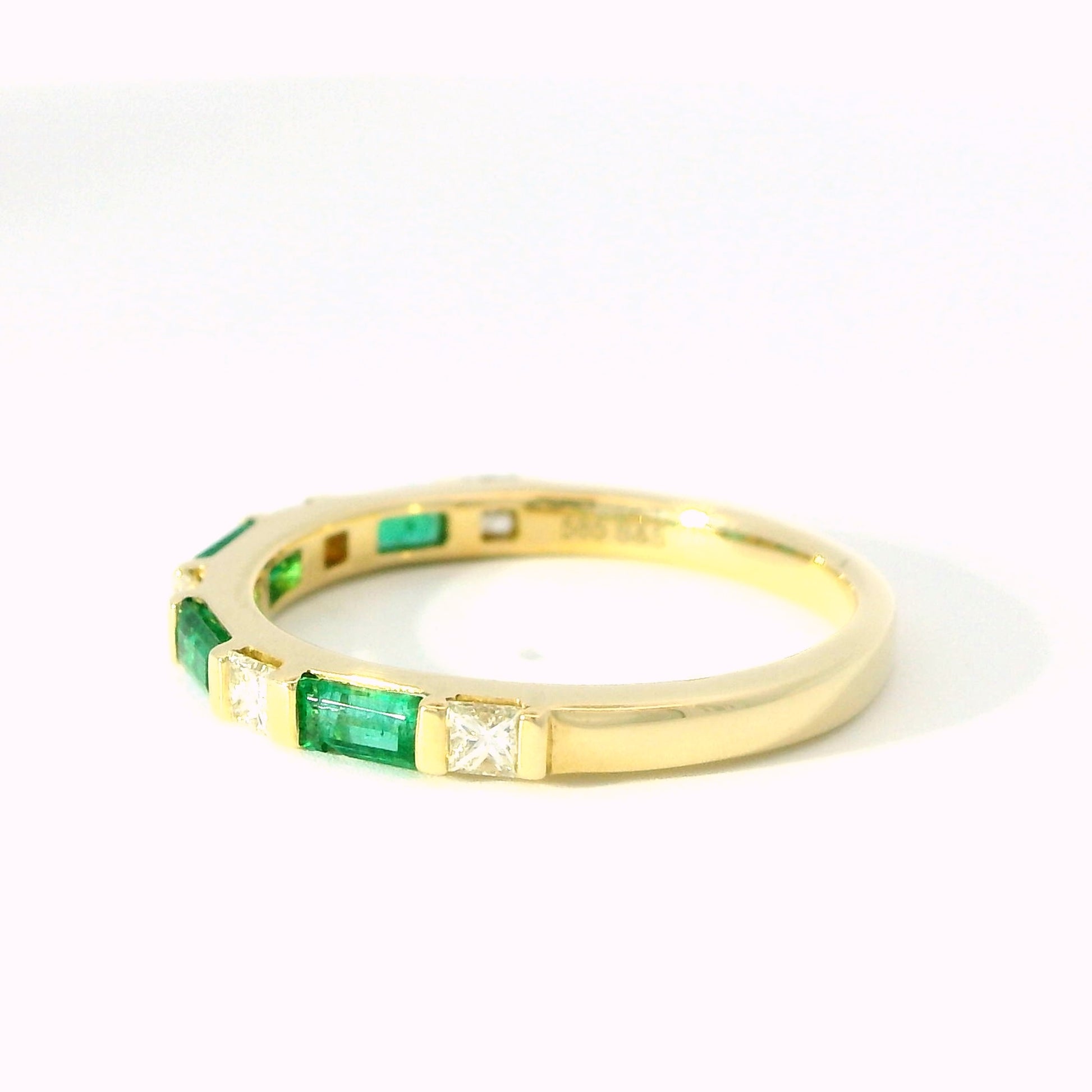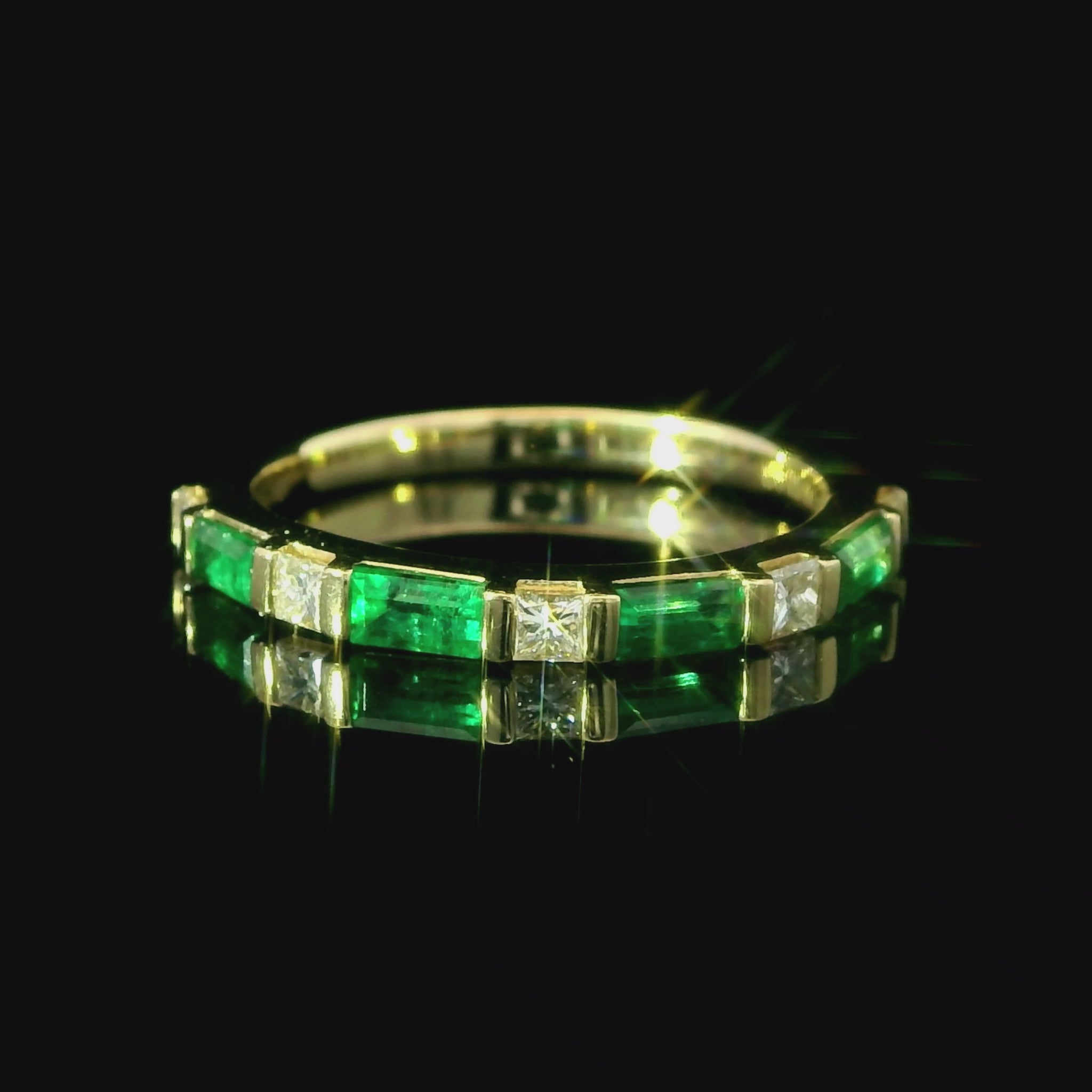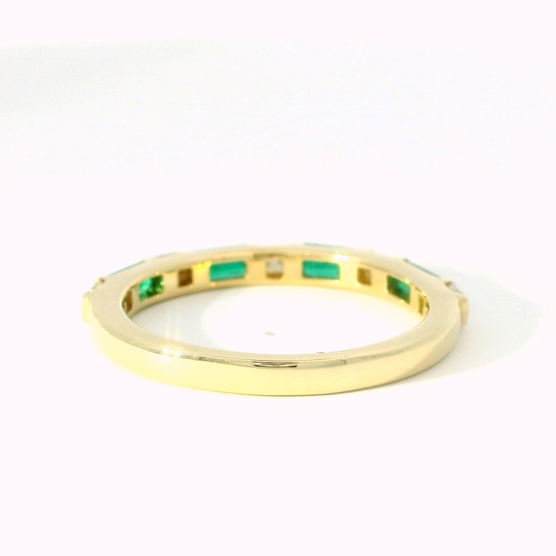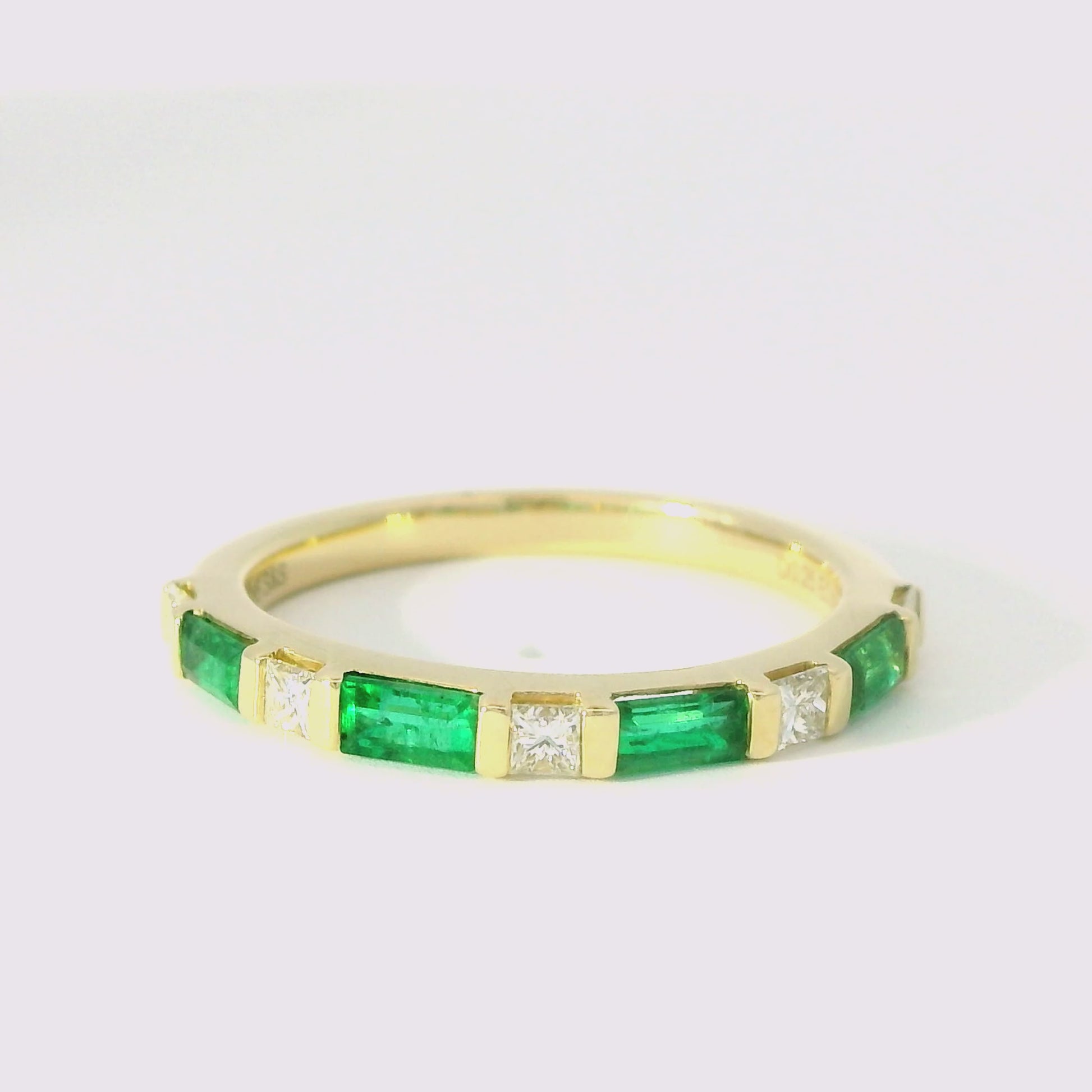 This ring is bar set and alternates straight bagguette emeralds and round diamonds. At the heart of the design is a vibrant, richly hued natural emerald—prized for its lush green color and symbolic association with renewal and love. This ring is smoothe and comfortable on. It is 2.3mm in width.
