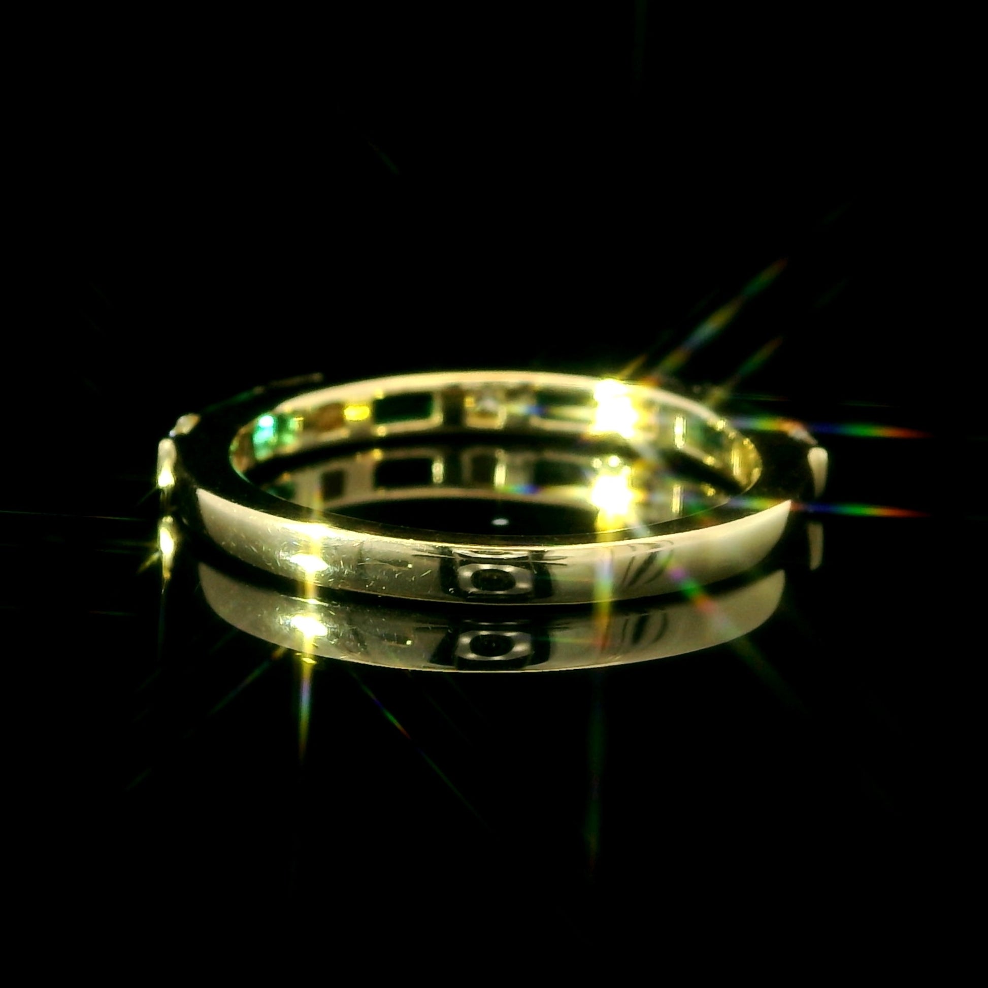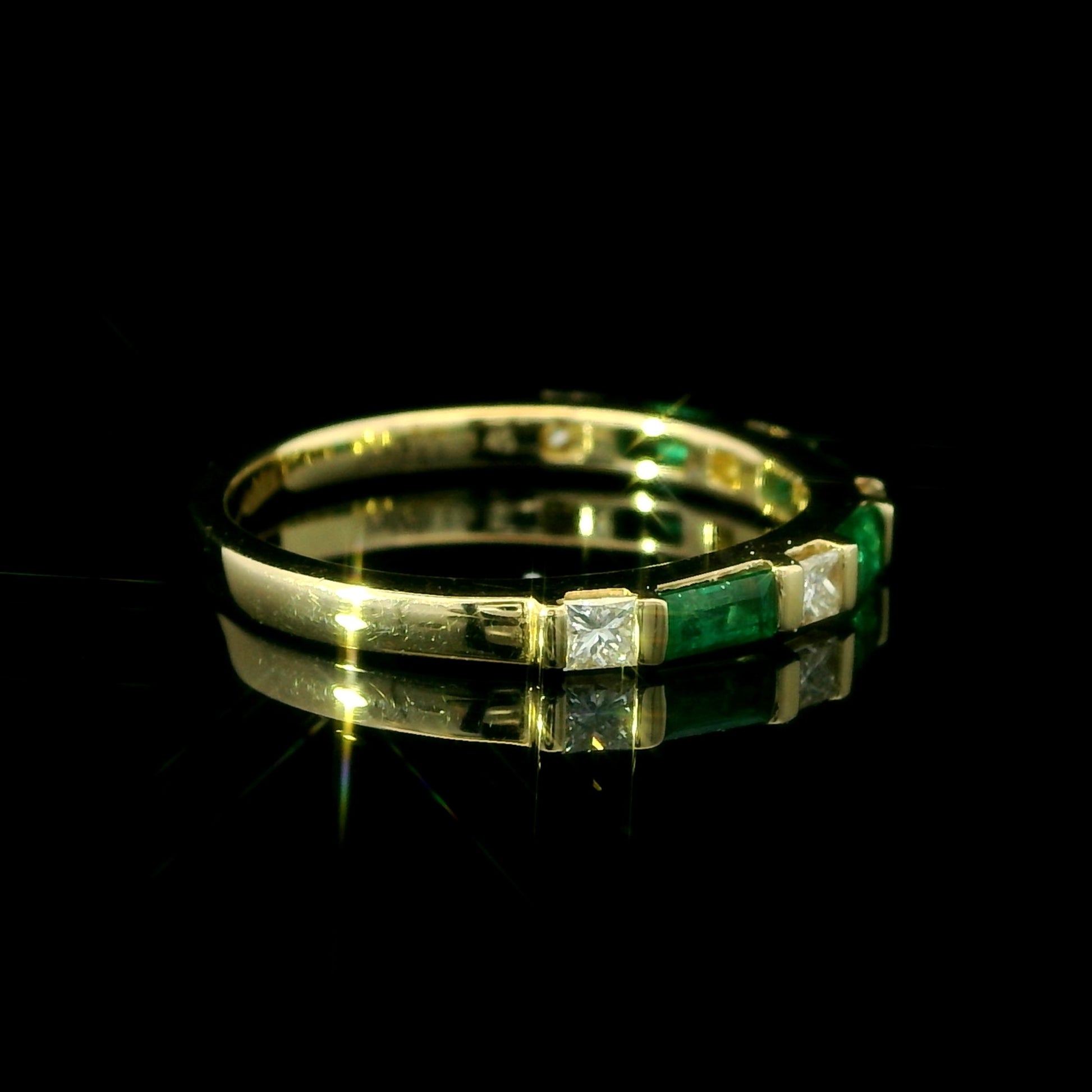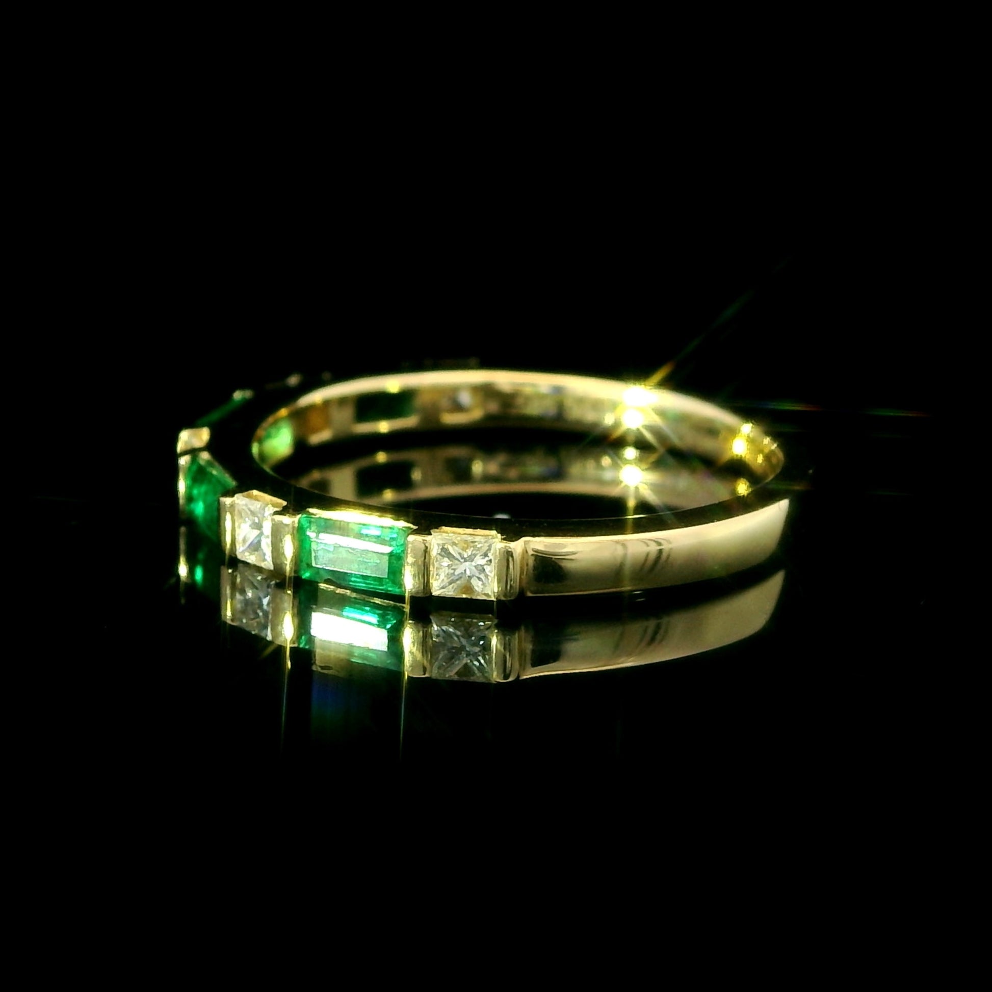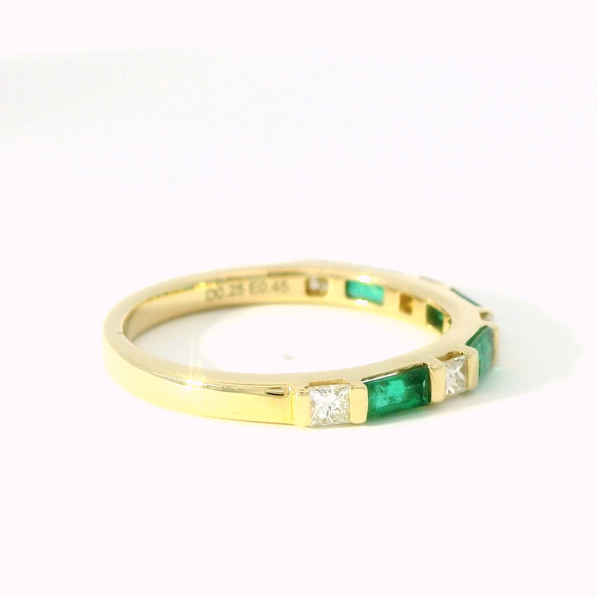 This ring is bar set and alternates straight bagguette emeralds and round diamonds. At the heart of the design is a vibrant, richly hued natural emerald—prized for its lush green color and symbolic association with renewal and love. This ring is smoothe and comfortable on. It is 2.3mm in width.