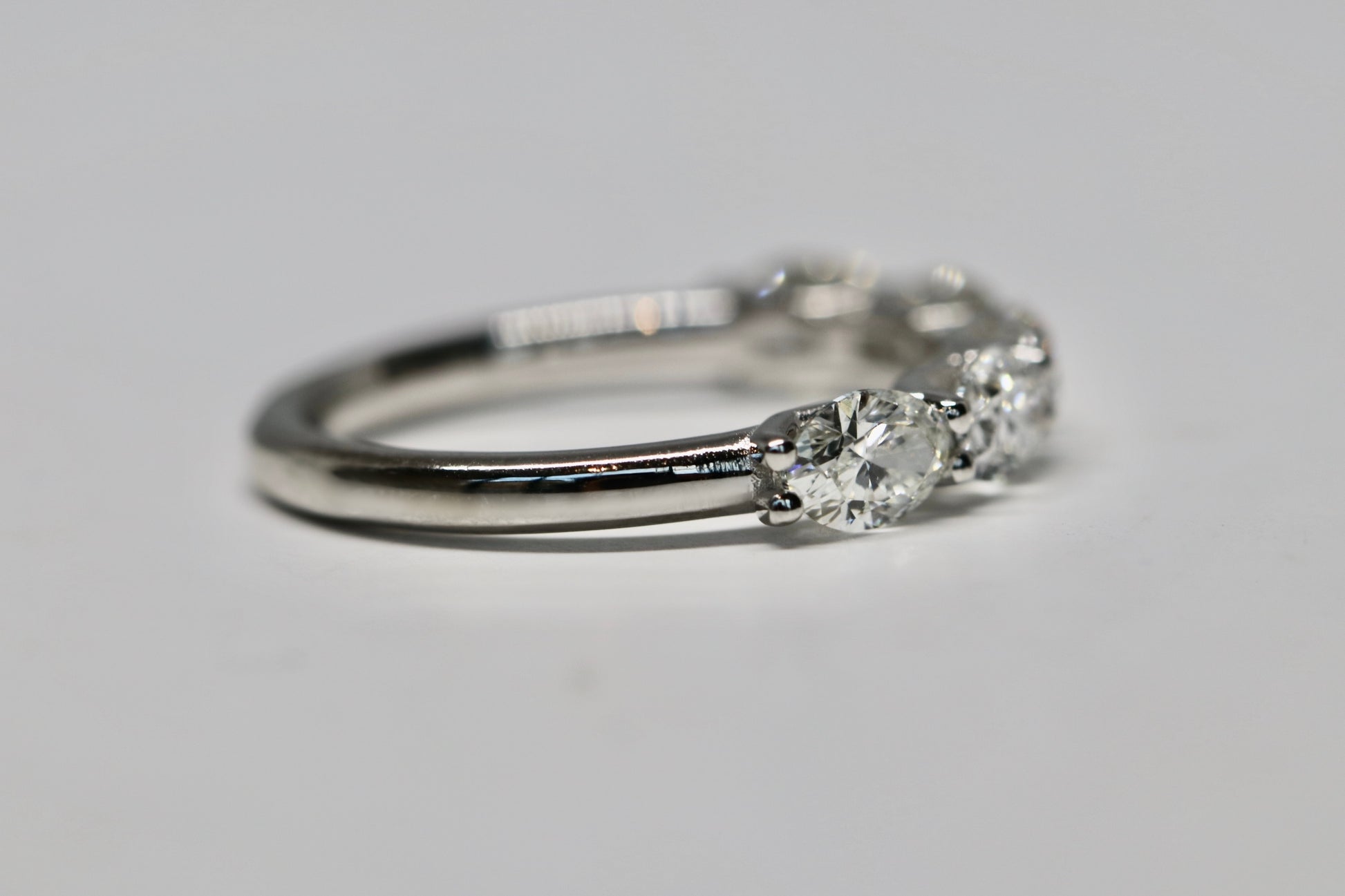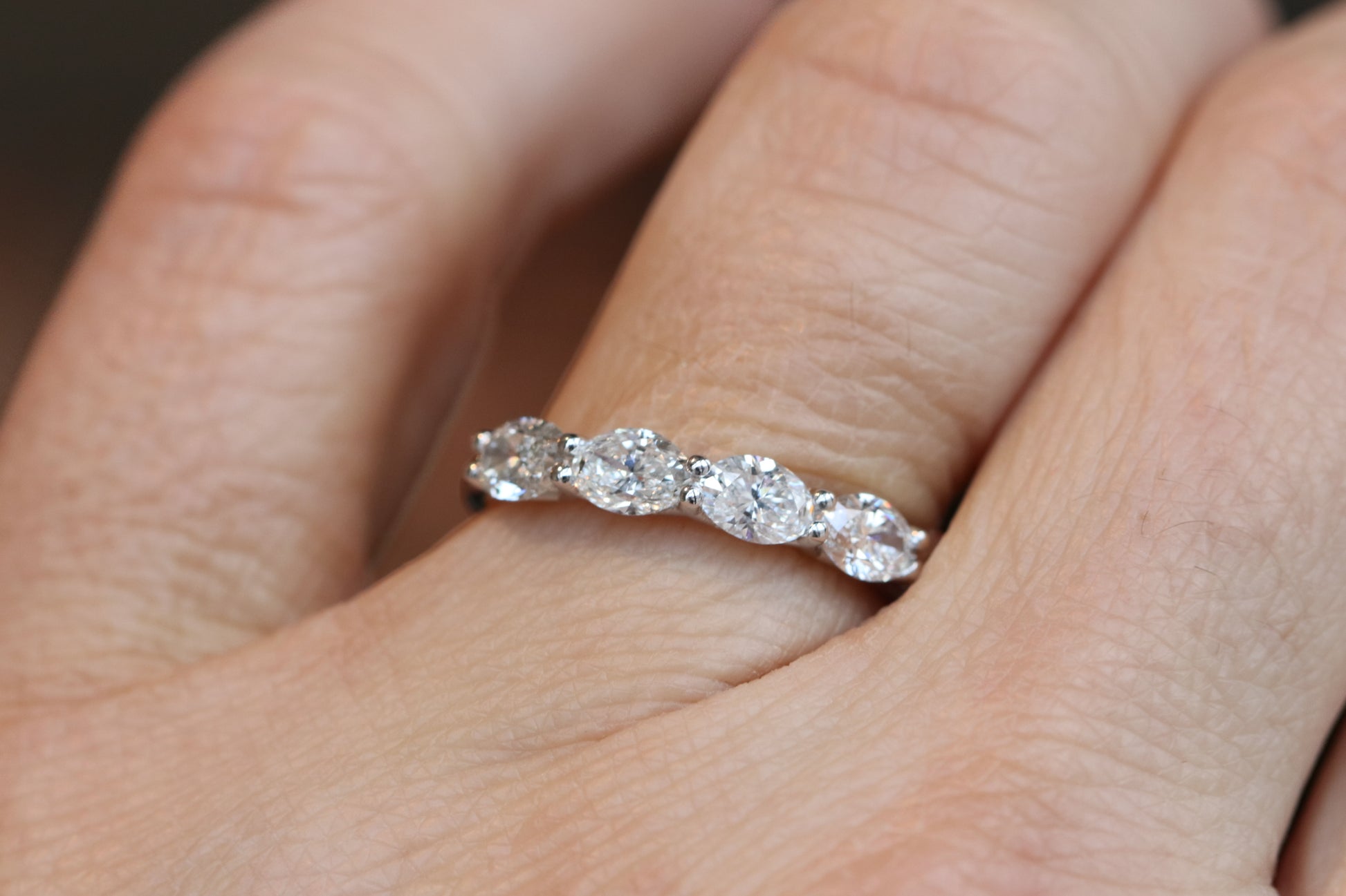 This wedding band has 5 hand-matched oval cut diamonds shared prong set Horizontally. This gives it a unique look and can be worn with an engagement ring or alone. Very Sparkly and part of our fancy shape diamond wedding band collection.