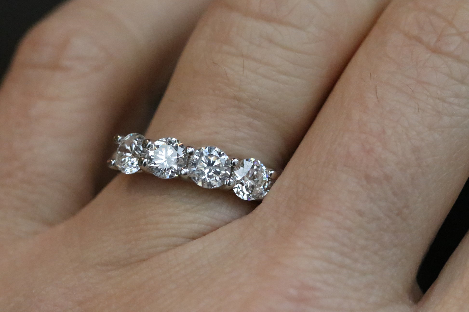 There are 5 round brilliant cut diamonds in each weighing .50cts. For a toral carat weight of 2.50. We set each diamond in a U-shaped shared prong style. This means that more light can come in from the sides and allow the high-quality diamonds to sparkle even more.