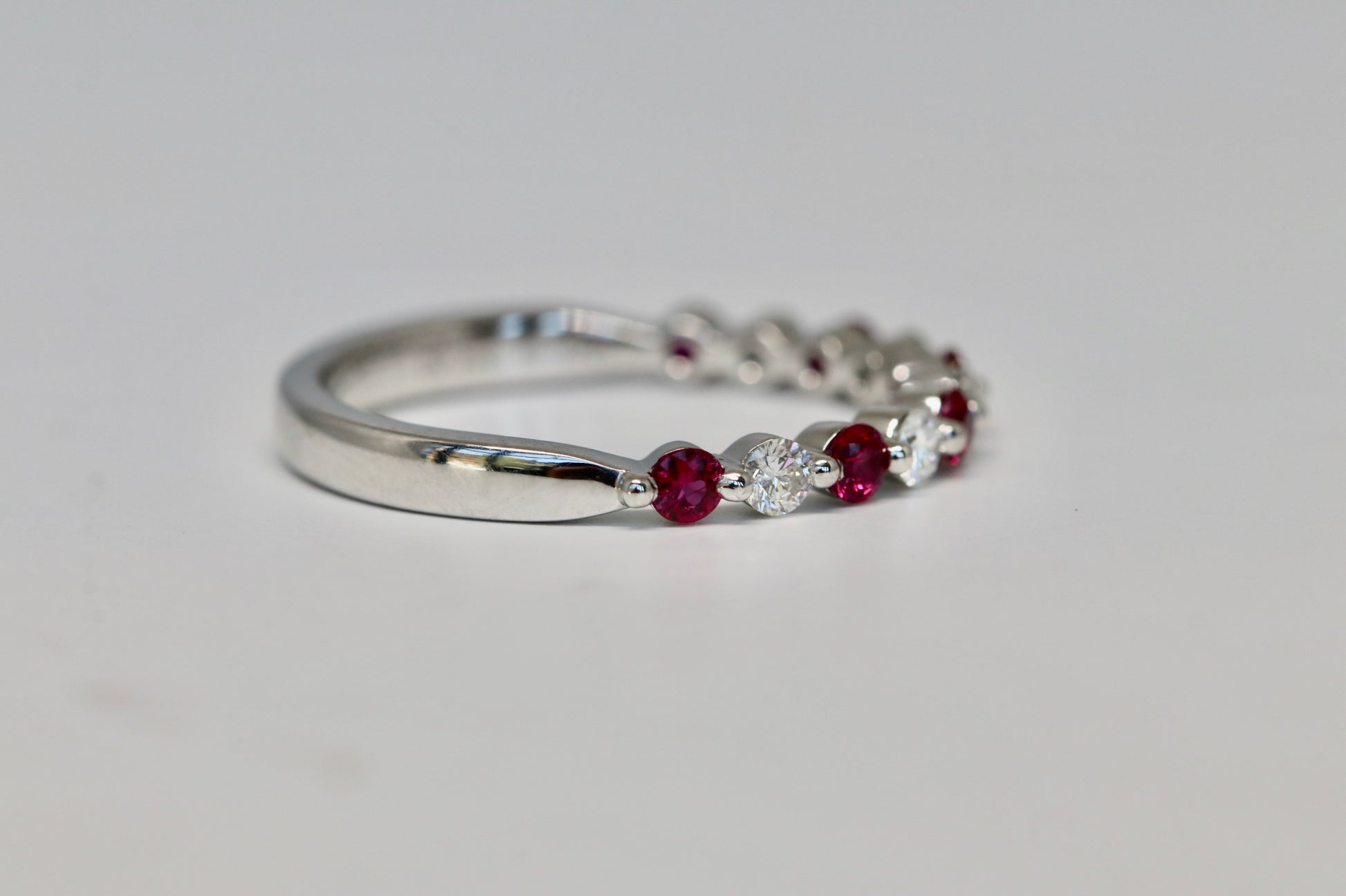 This ring as 5 natural round brilliant cut diamonds alternating with 6 genuine round rubies ALL single shared prong set.