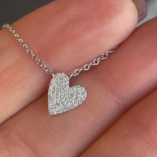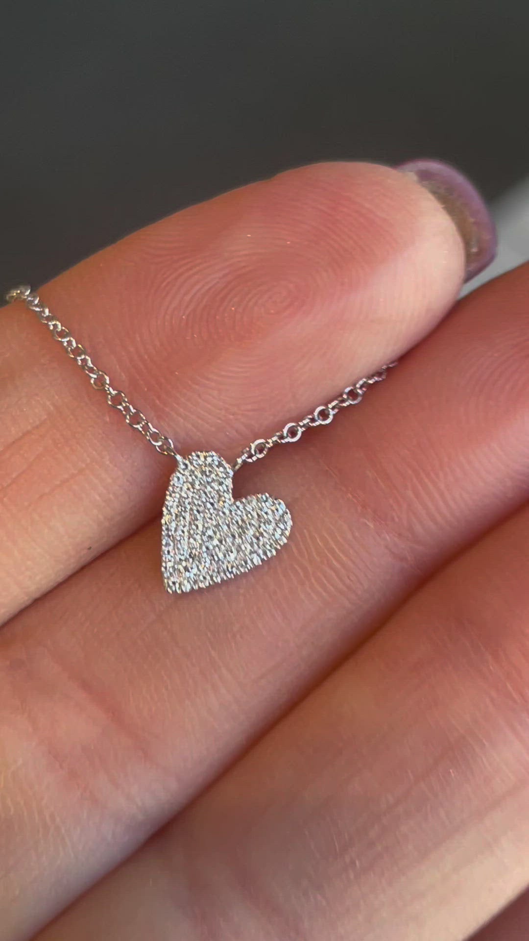 This is a heart-shaped diamond pendant made with 60 round brilliant cut diamond pave set. We place this on a 16-18" adjustable diamond cut link chain with a sturdy lobster clasp. Currently, this setting is available for next-day delivery in 14K White but if you would like it in another metal please give us 5 days to make it. Also please call/text us at (630)355-7464 if you would like the chain in a different metal or length.
