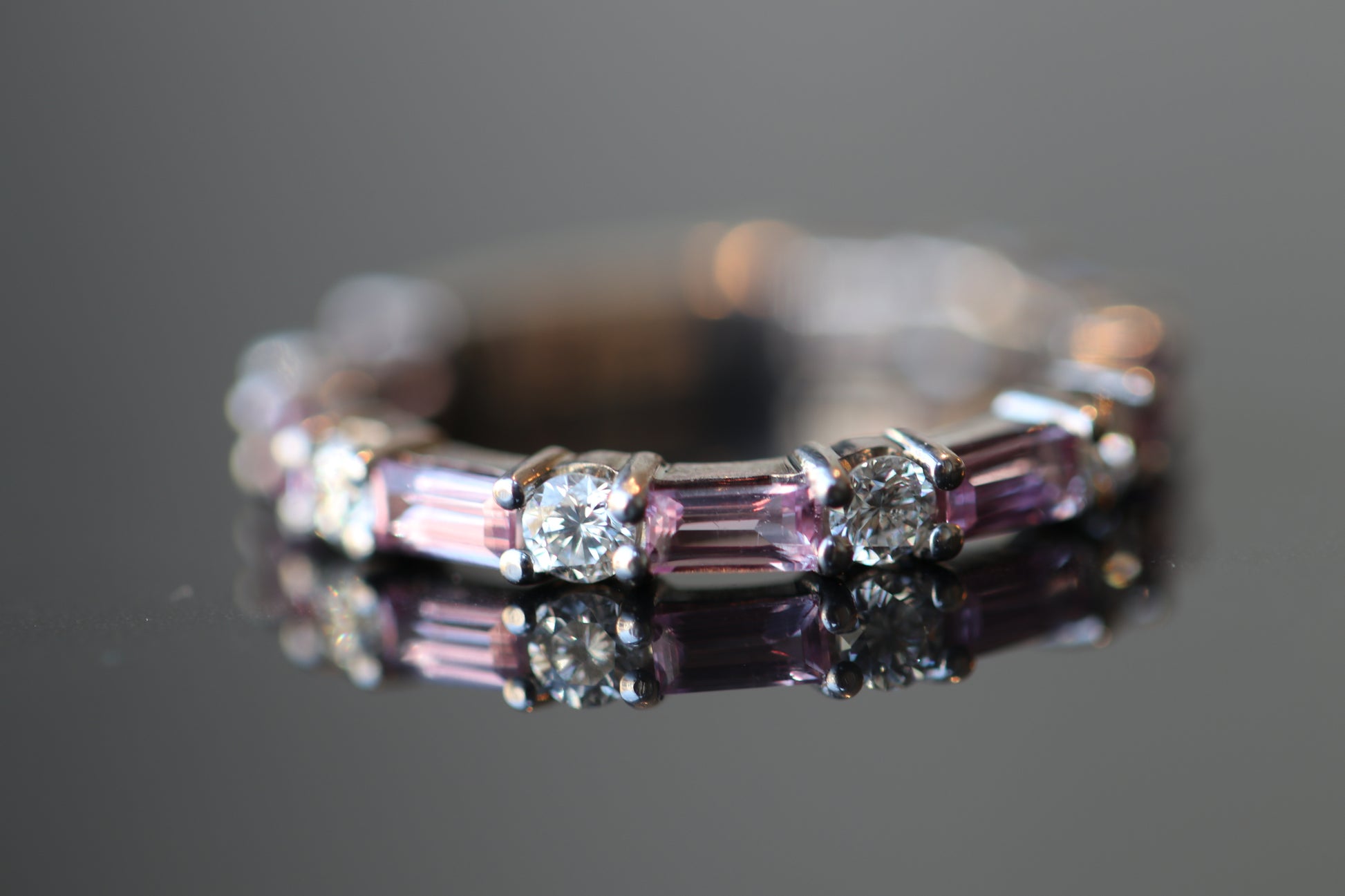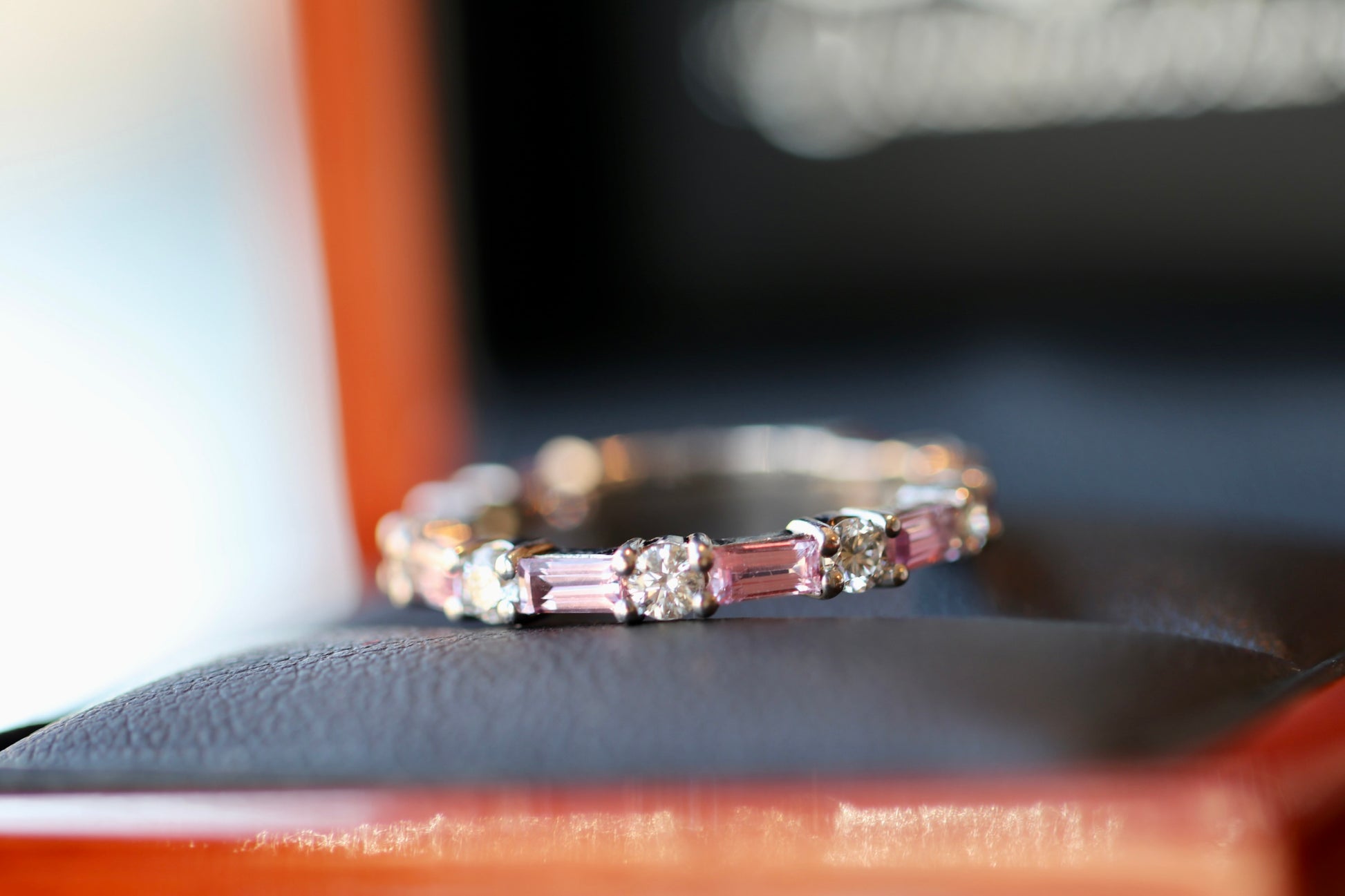 This stunning ring showcases an elegant combination of pink tourmalines and sparkling diamonds, creating a vibrant and sophisticated look. The design alternates between the warm blush tones of baguette-cut pink tourmalines and the brilliance of round-cut diamonds, each held securely in a sleek prong setting. The band, made from polished white gold, but can be made in rose, yellow, or platinum. This ring is perfect as an anniversary band, a stackable piece, or a statement accessory for special occasions, offering a beautiful blend of romantic hues and classic sparkle. Tourmaline also happends to be one of the two Birthstones for the month of October.