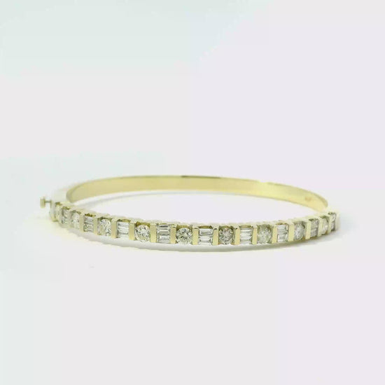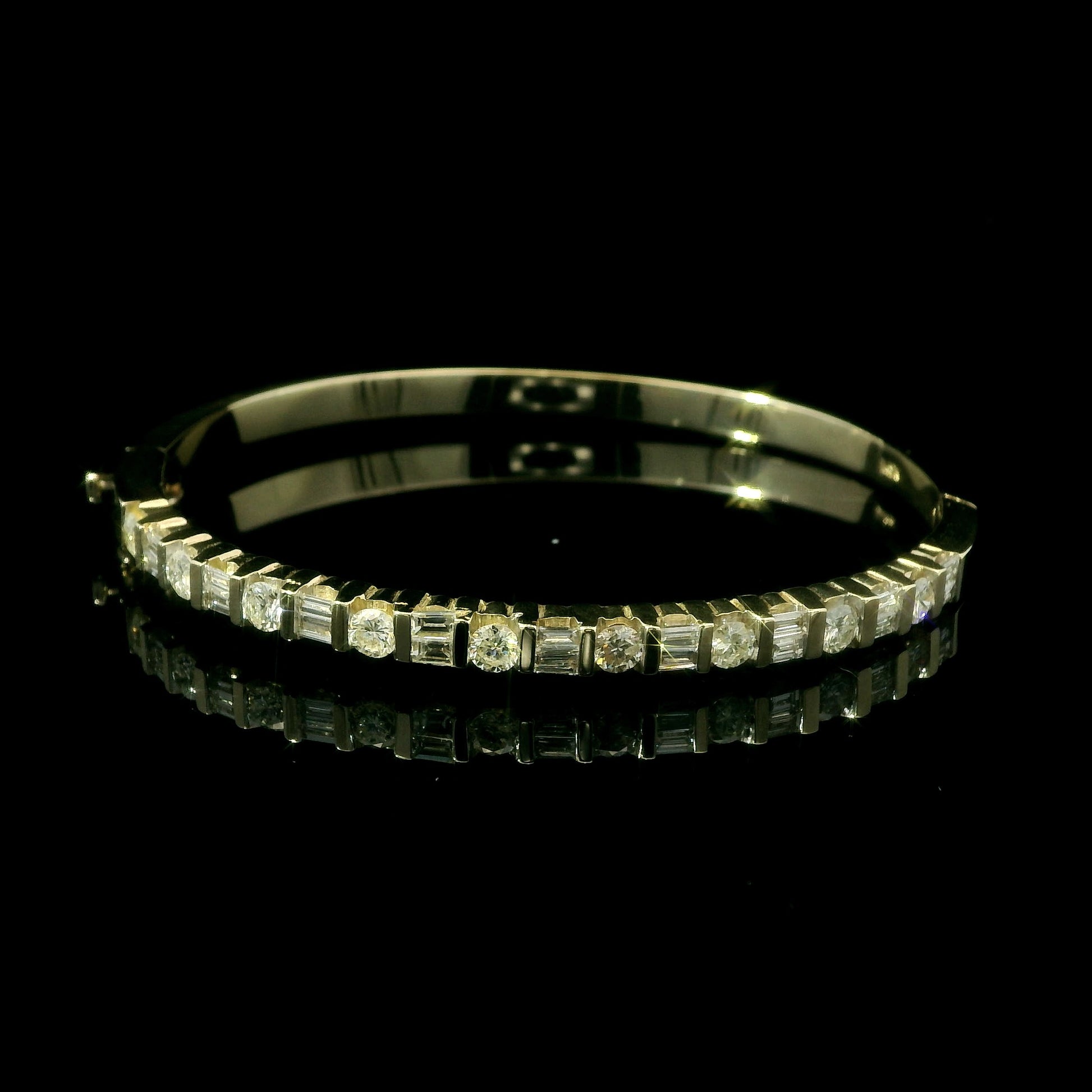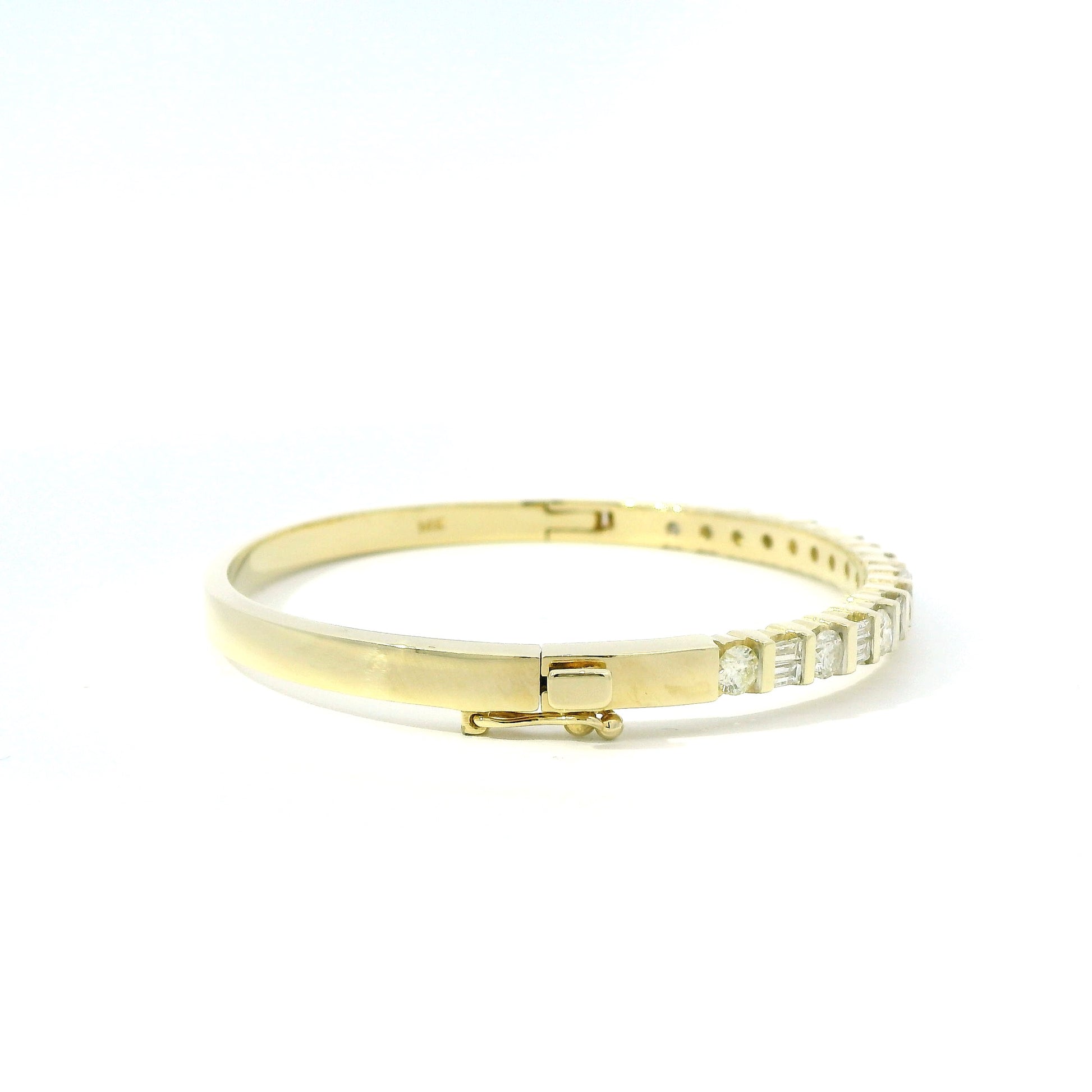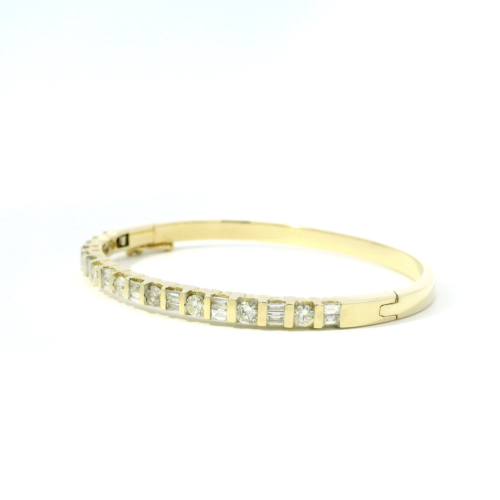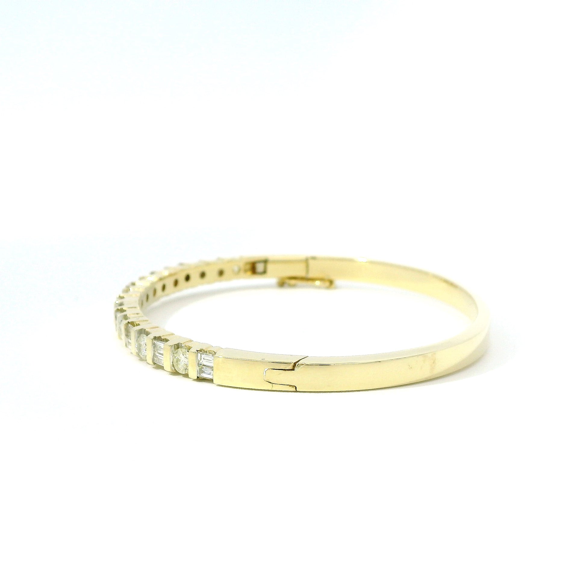 Elevate your jewelry collection with this stunning solid 14kt yellow gold natural diamond bangle. Crafted with timeless elegance, this bangle features a sophisticated bar-set design showcasing alternating brilliant round diamonds and sleek baguette diamonds. The mix of cuts creates an eye-catching sparkle that transitions effortlessly from day to night.