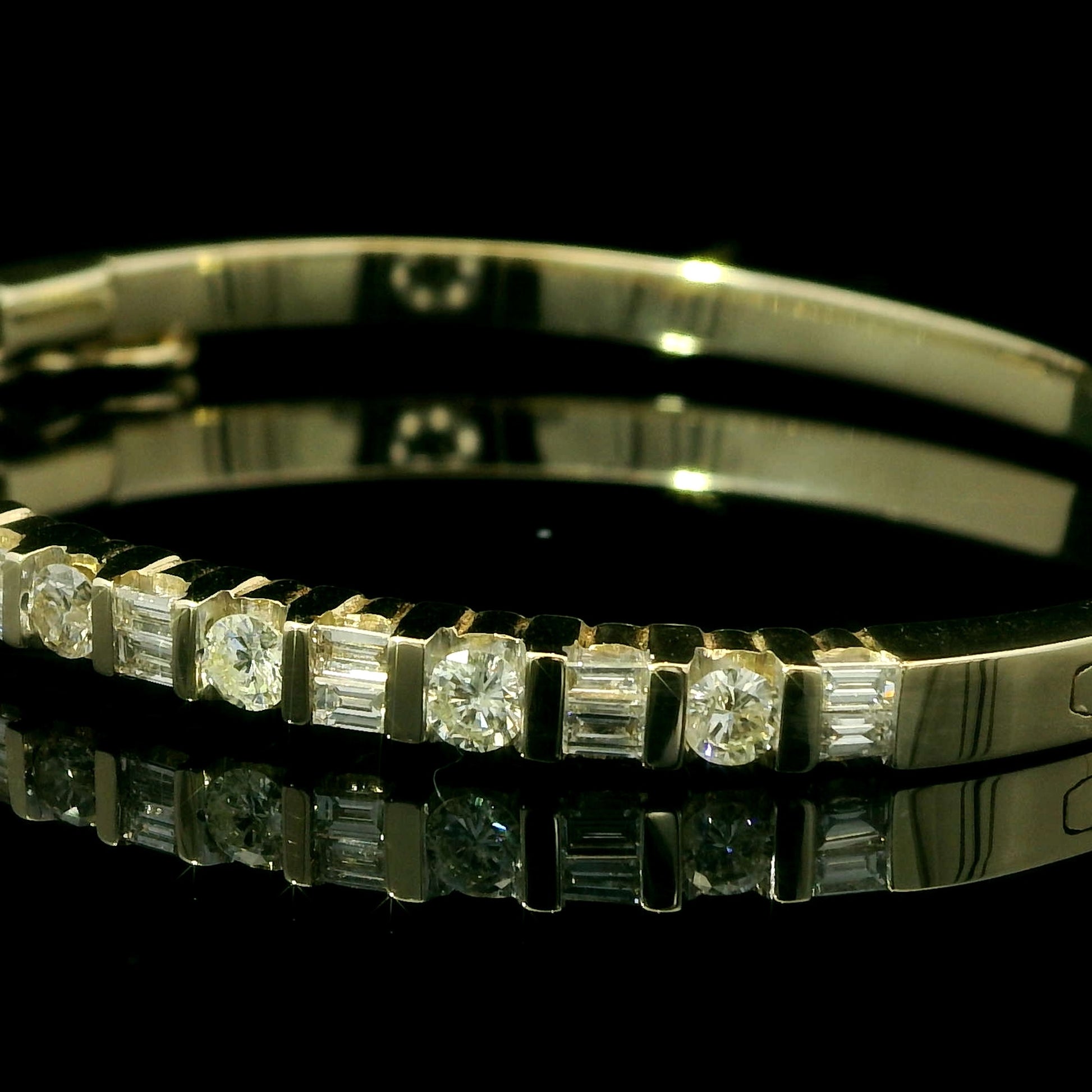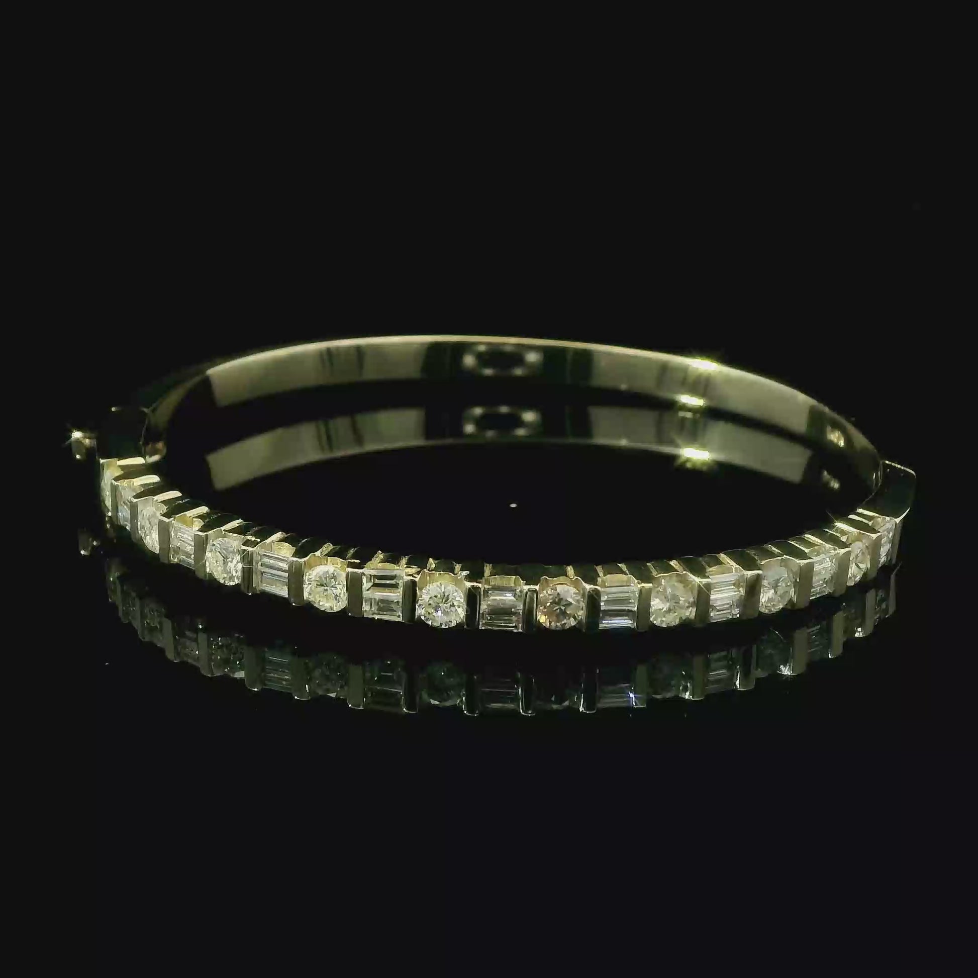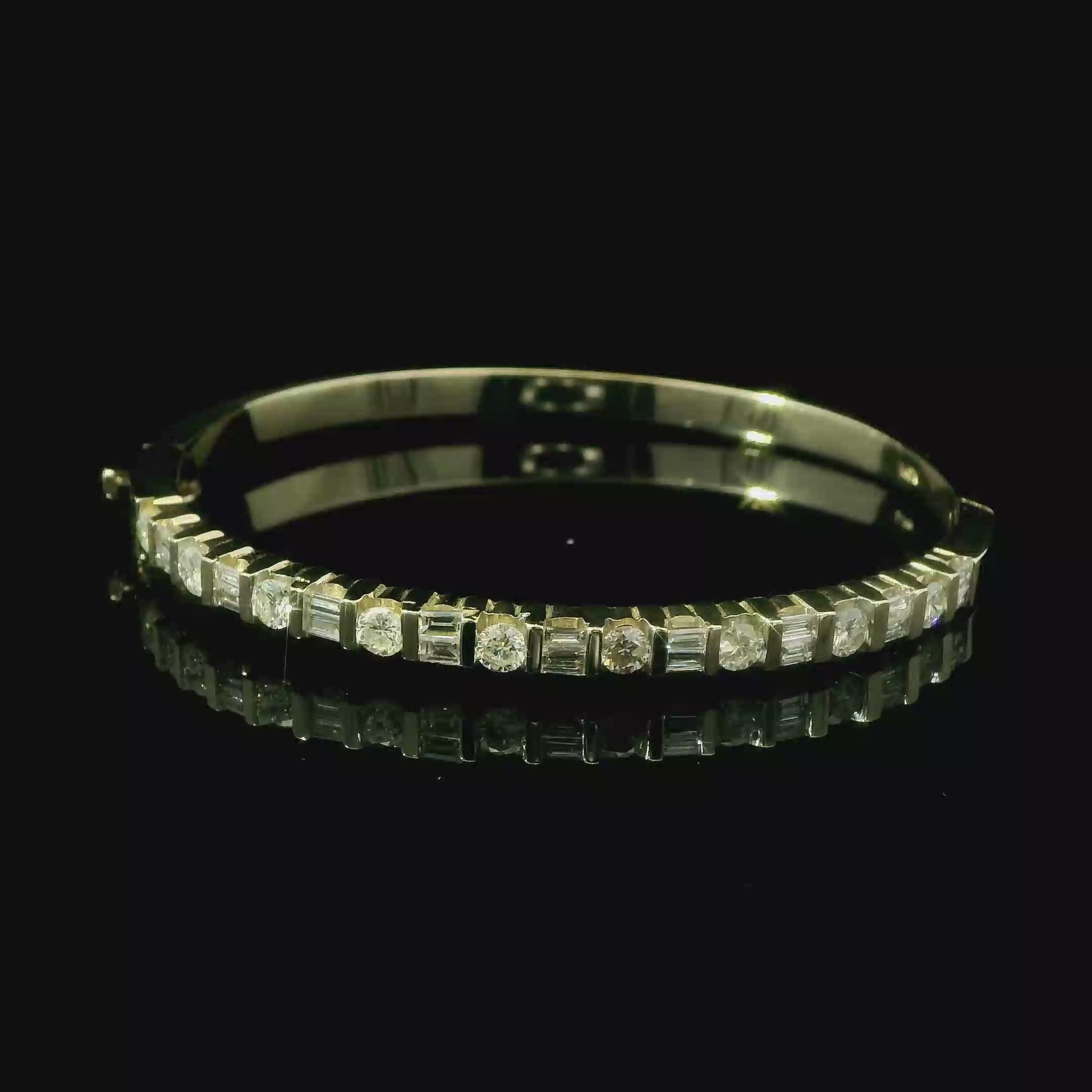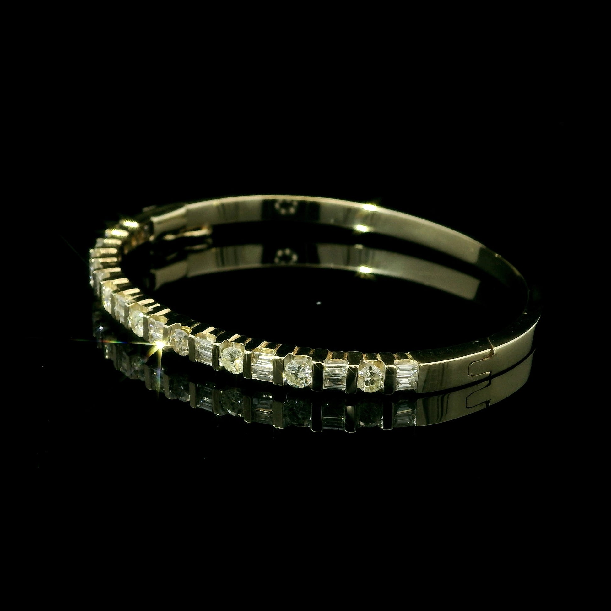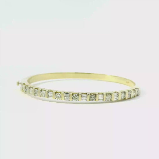 Elevate your jewelry collection with this stunning solid 14kt yellow gold natural diamond bangle. Crafted with timeless elegance, this bangle features a sophisticated bar-set design showcasing alternating brilliant round diamonds and sleek baguette diamonds. The mix of cuts creates an eye-catching sparkle that transitions effortlessly from day to night.