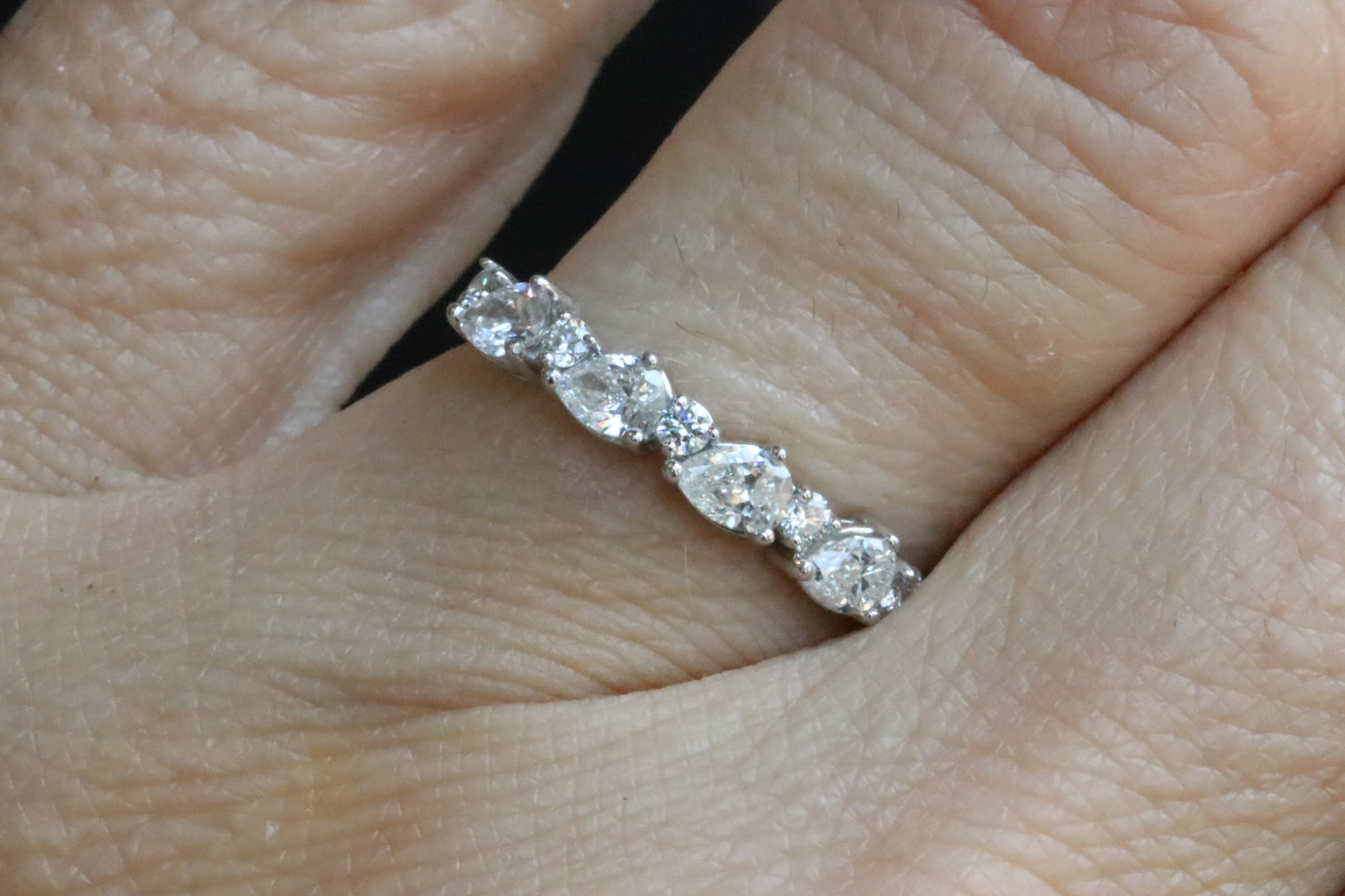 This band is 4.2mm in width. It alternates pear and round diamond shared prong set throughout. The picture features 14kt white gold but we make this in 14kt yellow, rose gold, and platinum as well. We can also change the diamonds out with gemstones or the diamond quality. Call/text us at (630)355-7464 with price/time frame/questions.