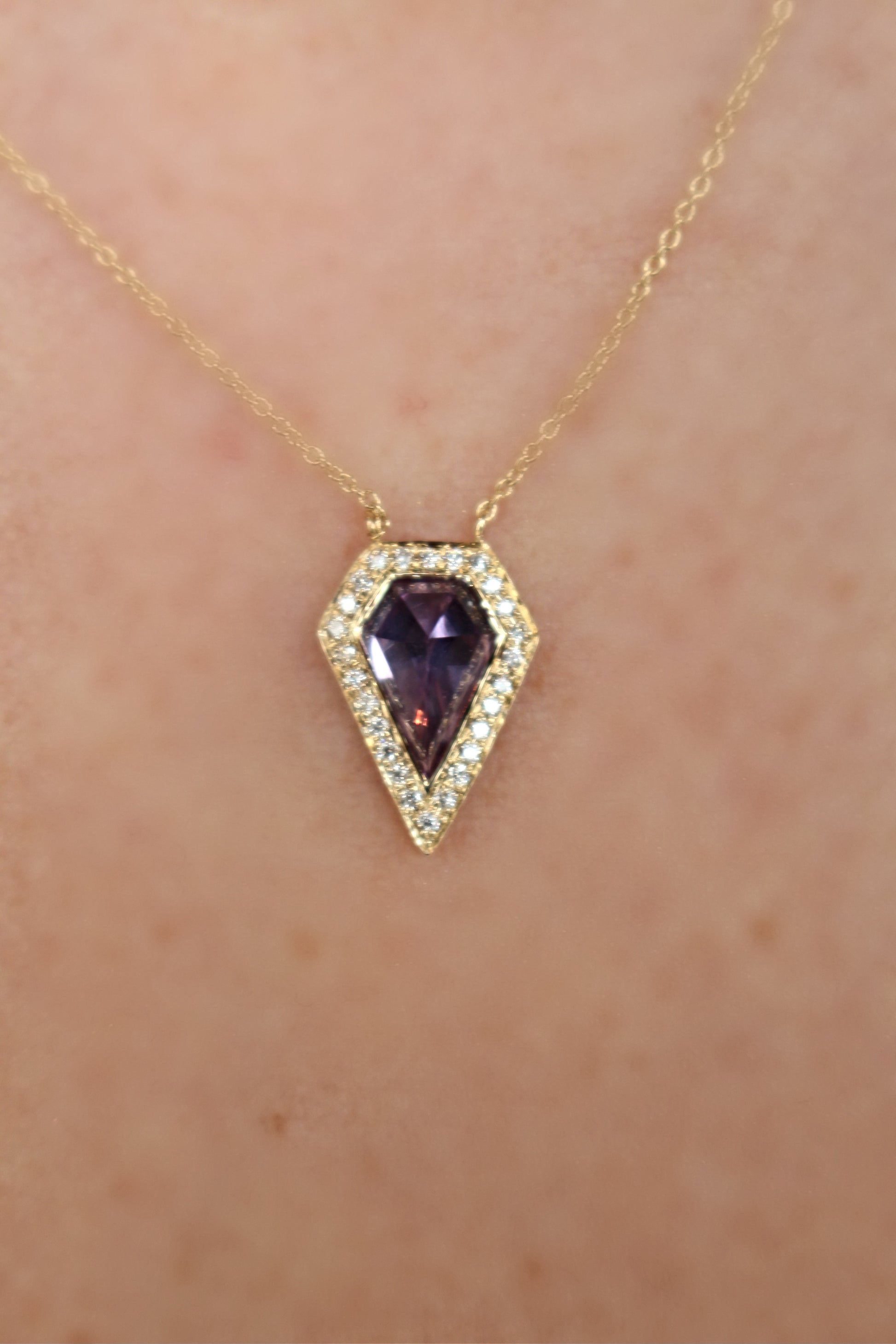 This geometric pendant has a 0.82ct Sheild Cut Genuine Amethyst in the center that is surrounded by a Halo of 26 Round Brilliant Cut Diamonds. It is also connected to a gold link adjustable chain. Currently, this pendant is available for next day delivery in 14kt yellow gold but if you would like it in white or rose gold, please give 10 days to make. Also call/text at (630)355-RING with custom ideas.