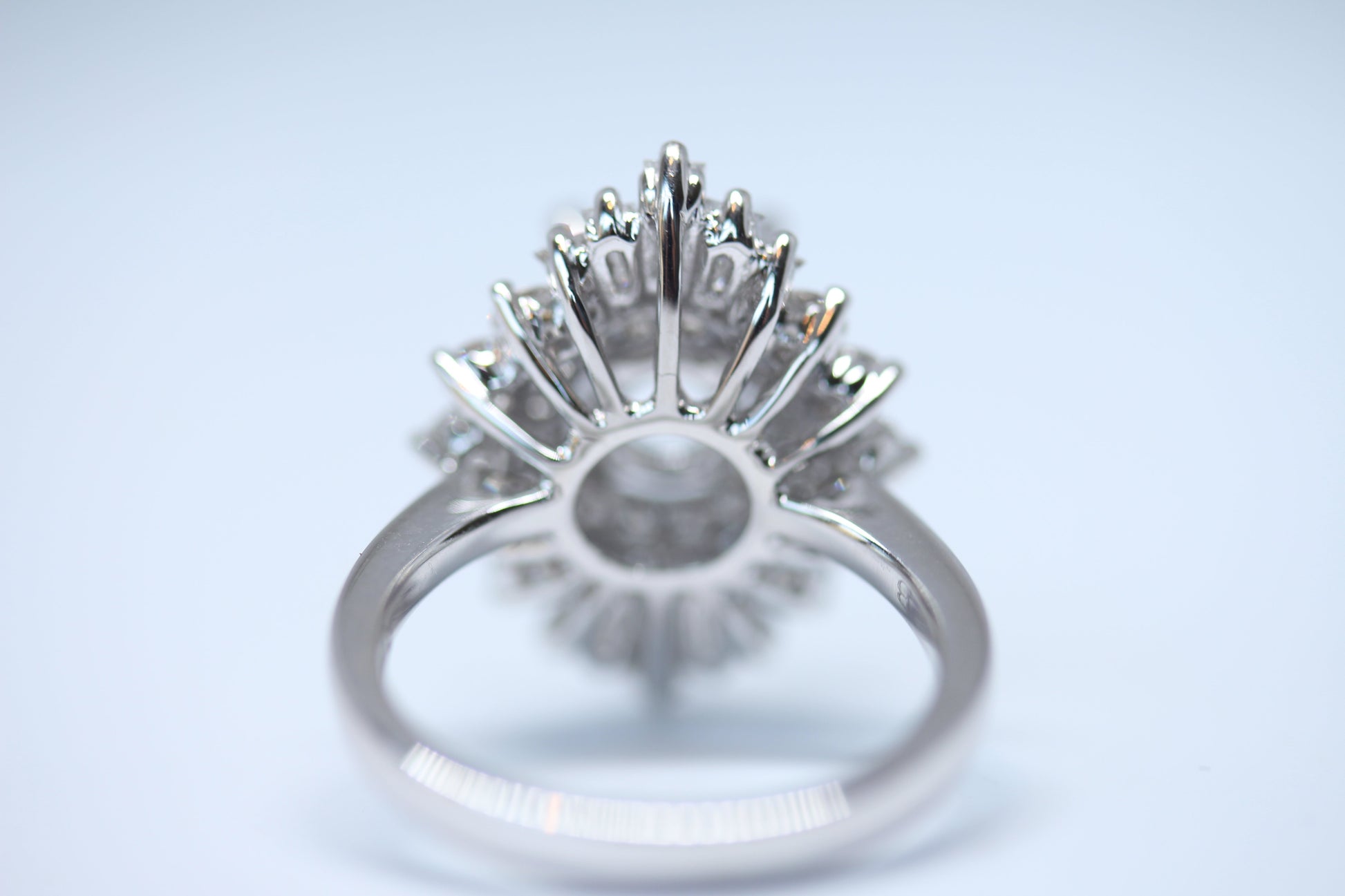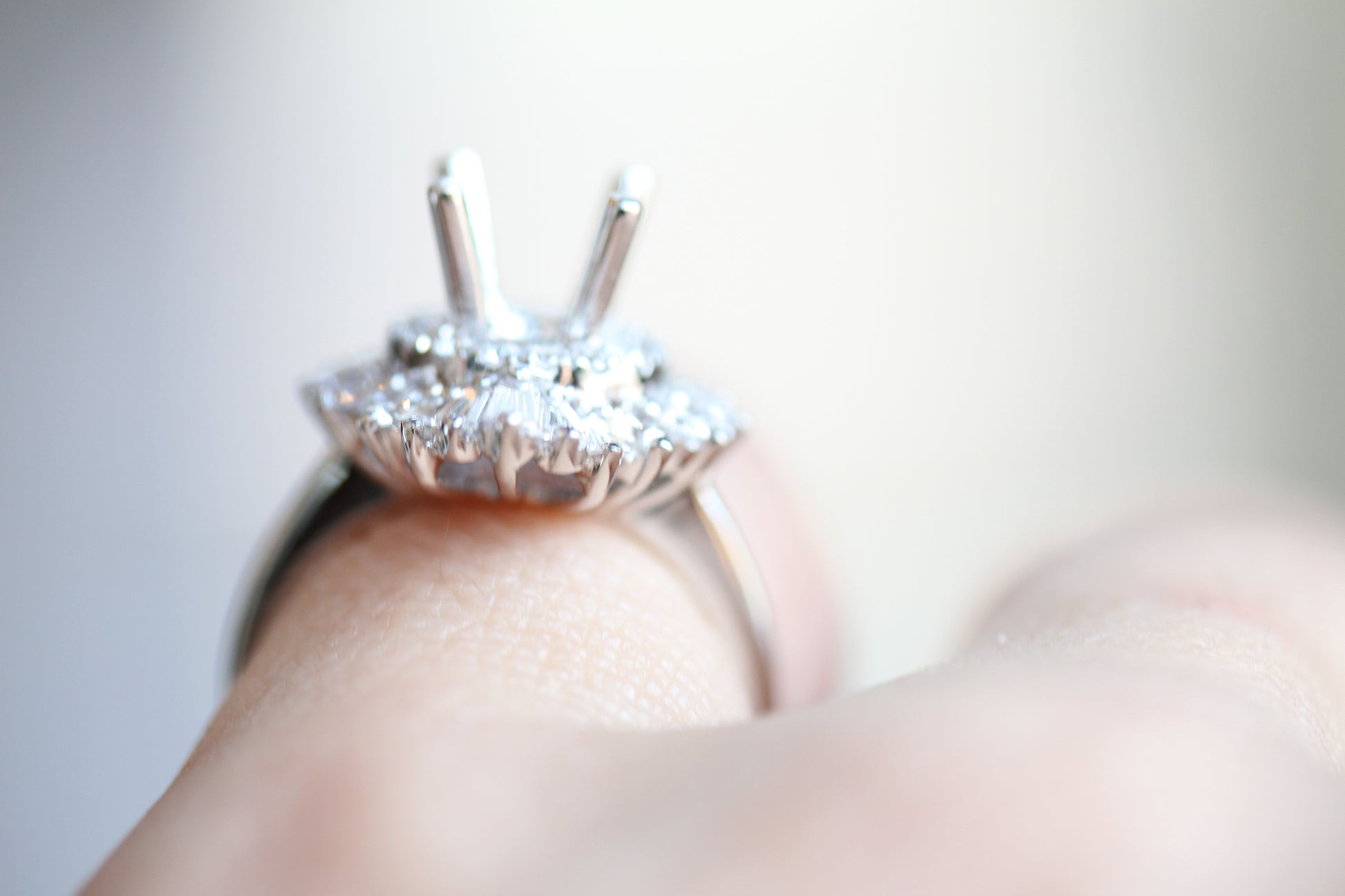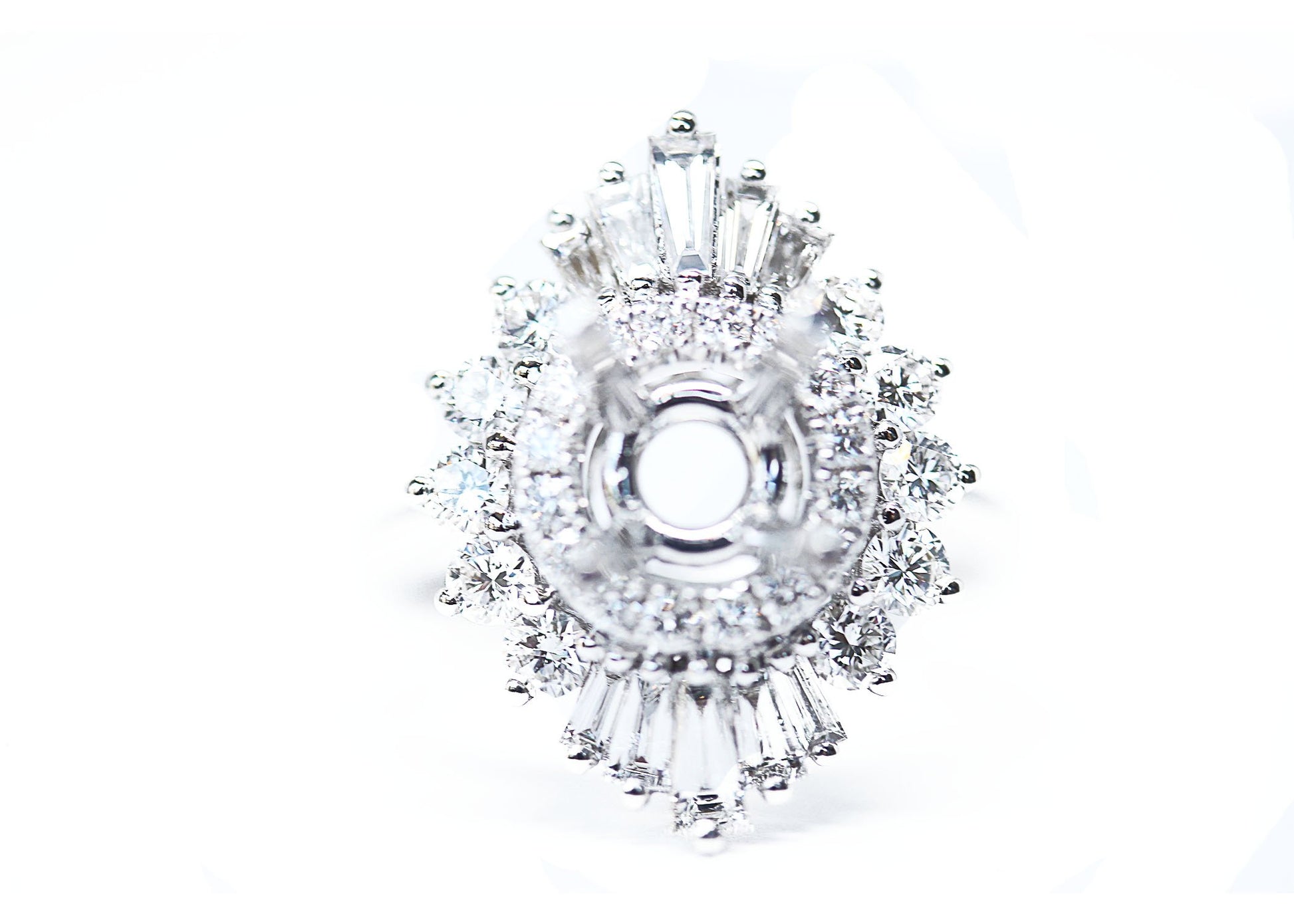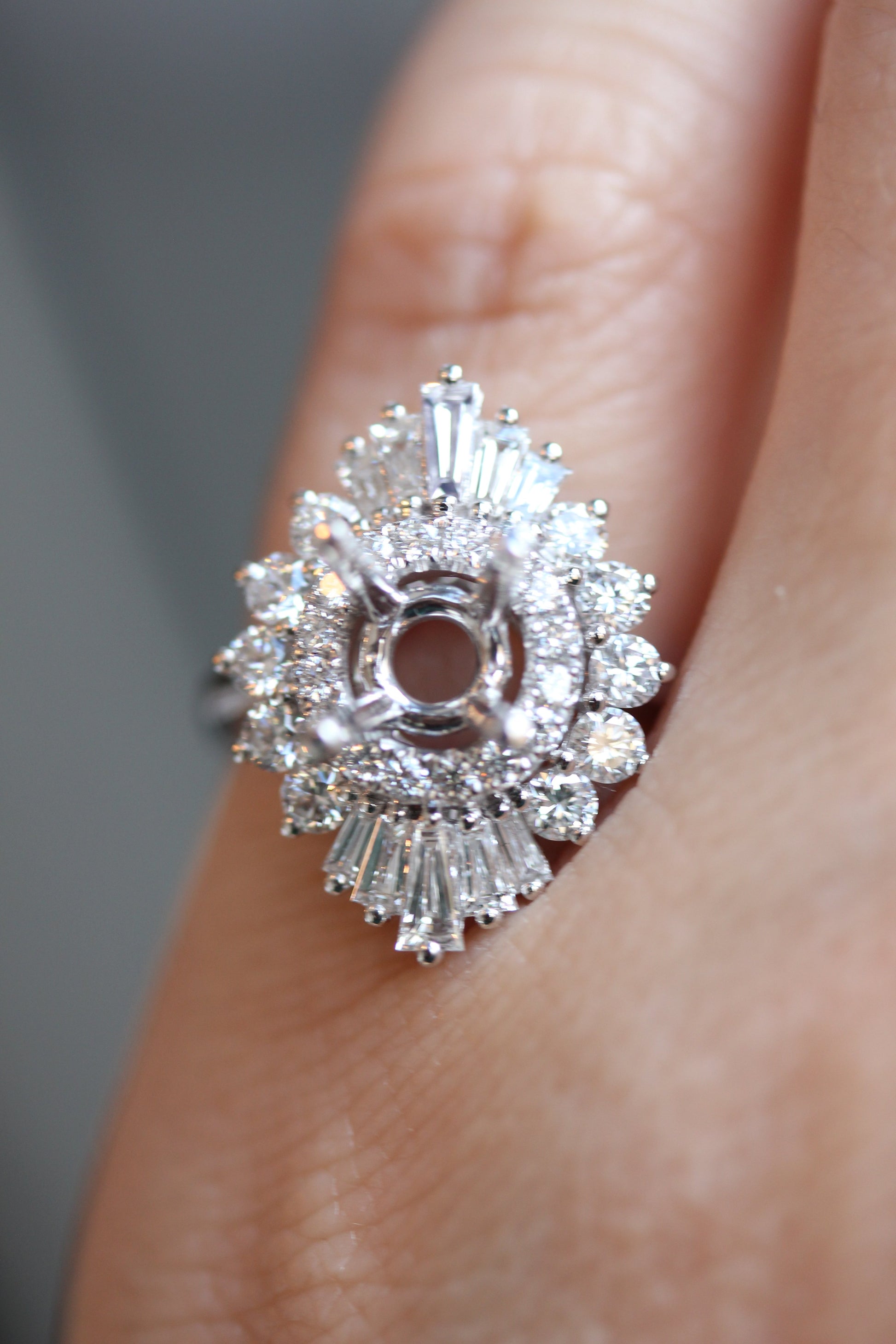 This art deco-style engagement ring features a halo of mixed cut diamonds all around. There are Baguette and Round Brilliant Cut Diamonds that point out on the top and bottom of the engagement ring that gives it a little extra sparkle as opposed to your traditional halo. The center can fit a round diamond or gemstone from 1ct-2.50ct.