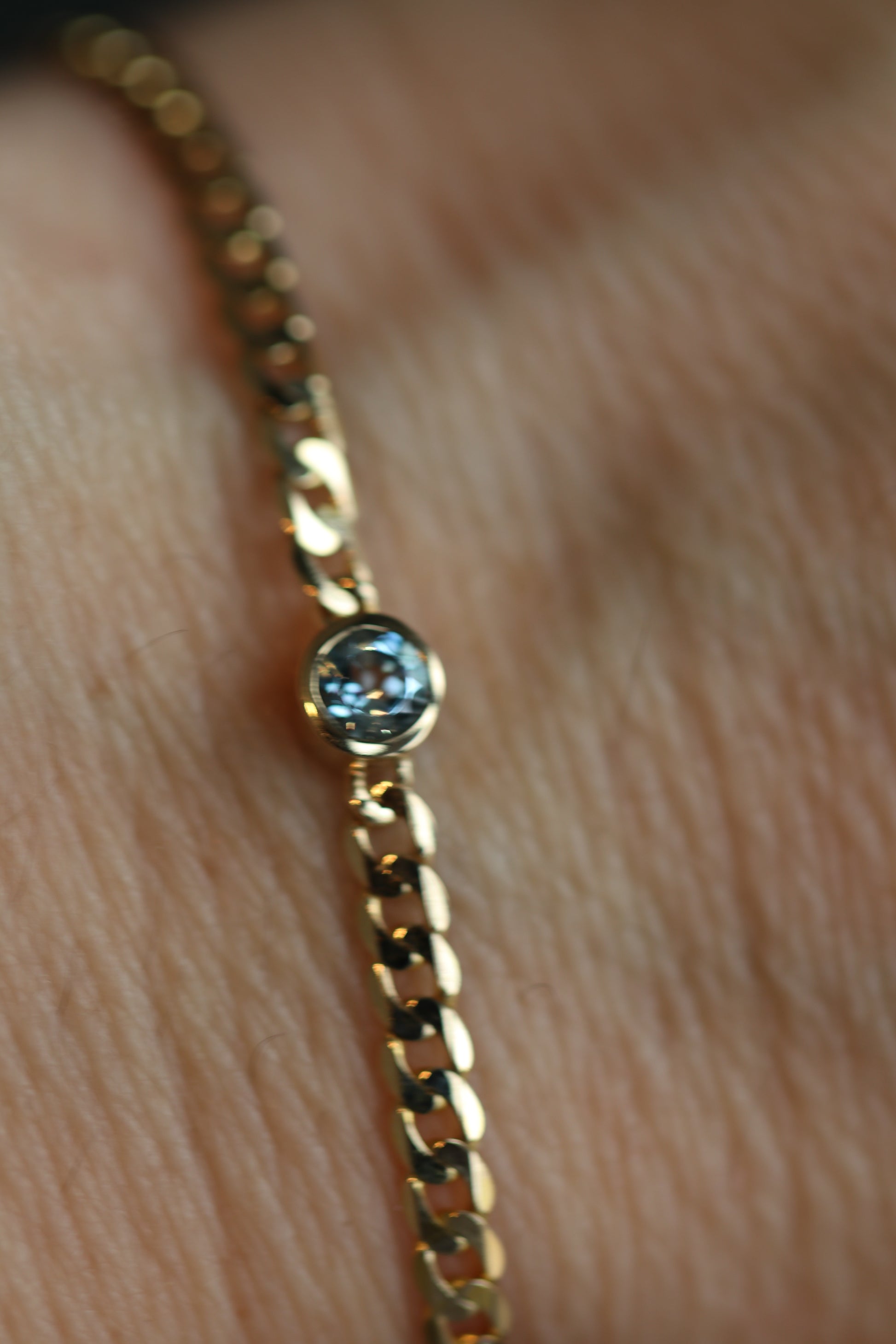 This 3mm curb Bracelet is made with 14kt Solid Gold and has a 4mm bezel set gemstone in the center. I feature this one with a genuine Aquamarine but we can make with any gemstone or a diamond...OF COURSE. We also make with a strong lobster clasp.