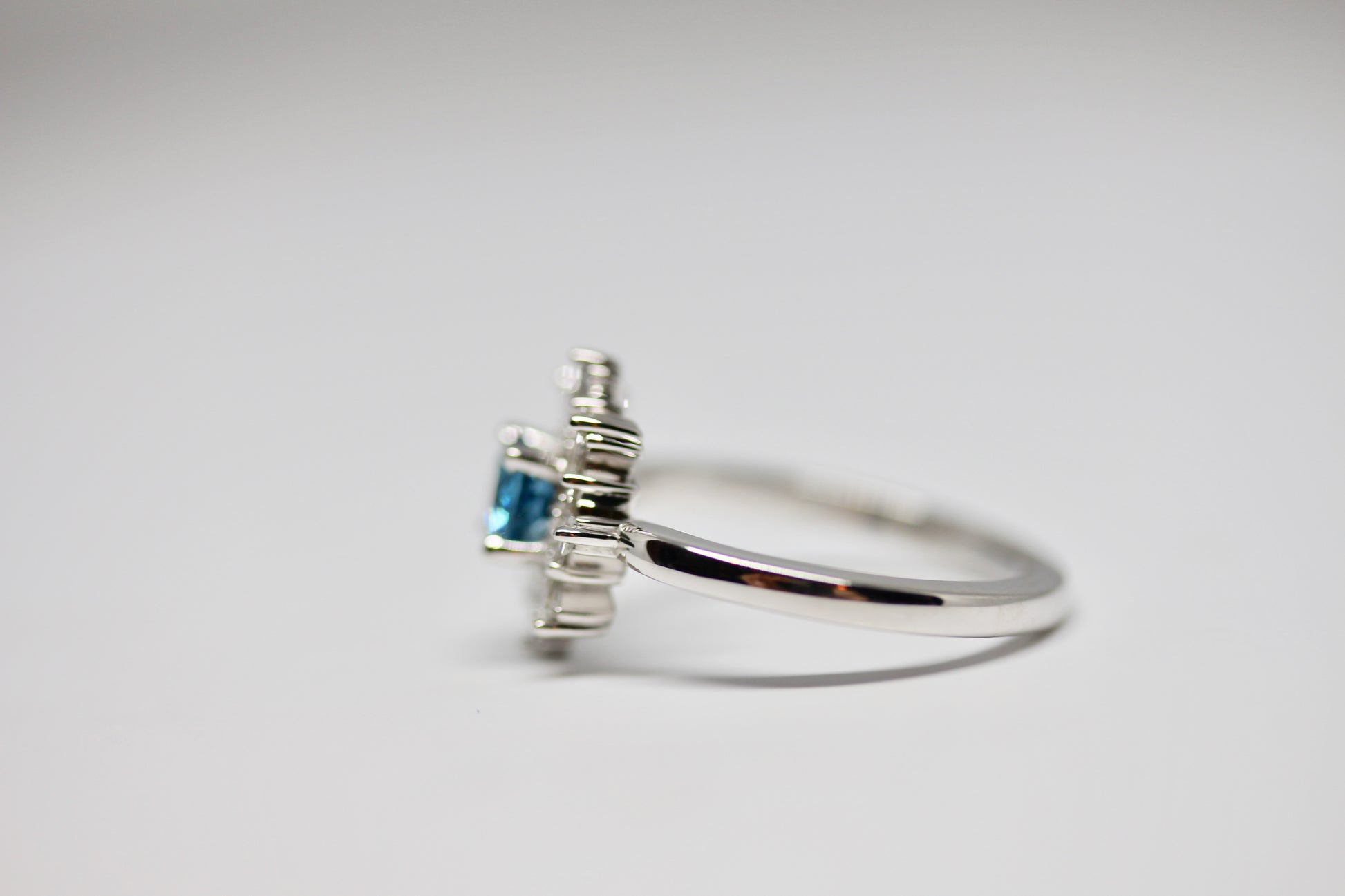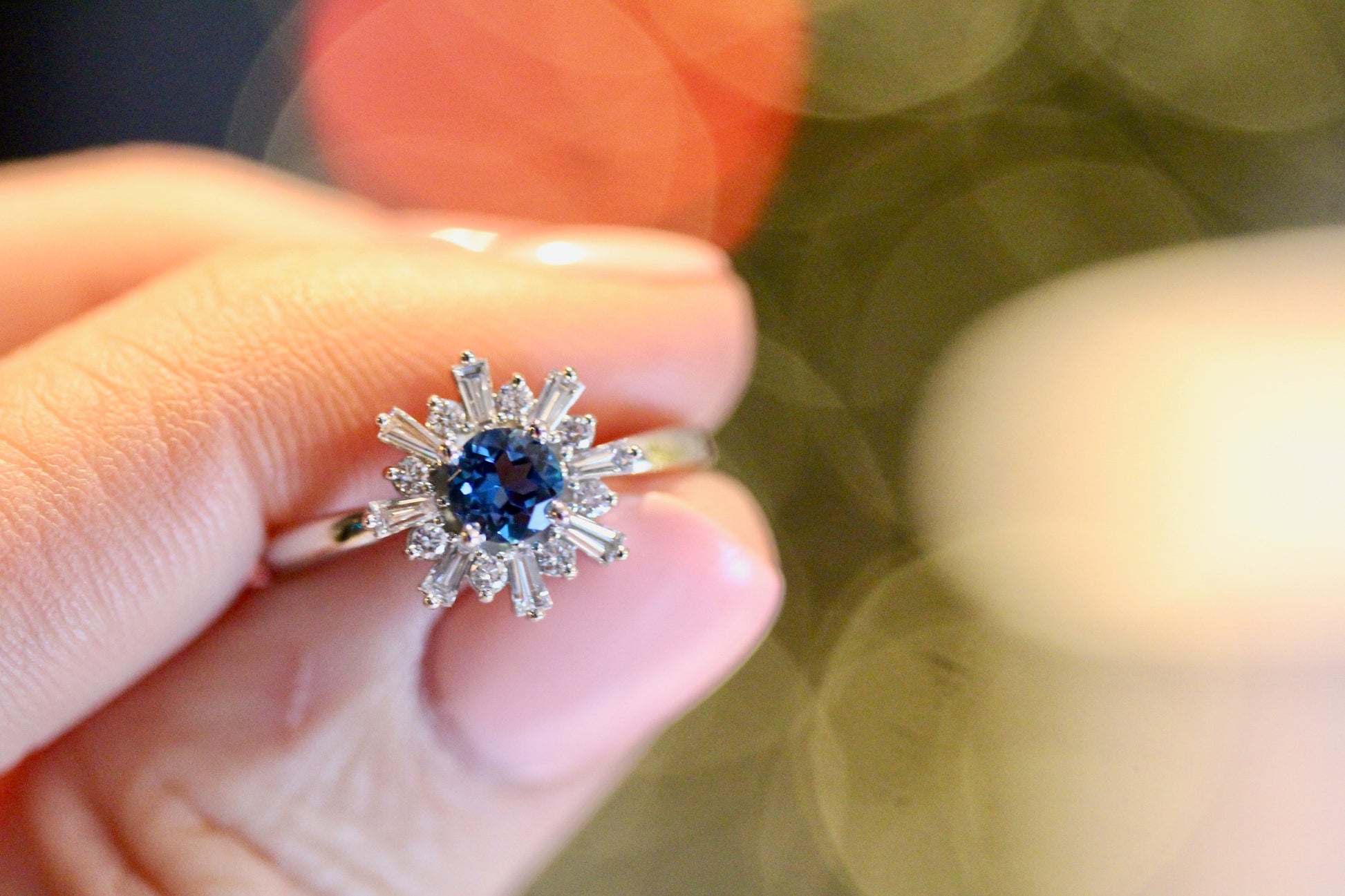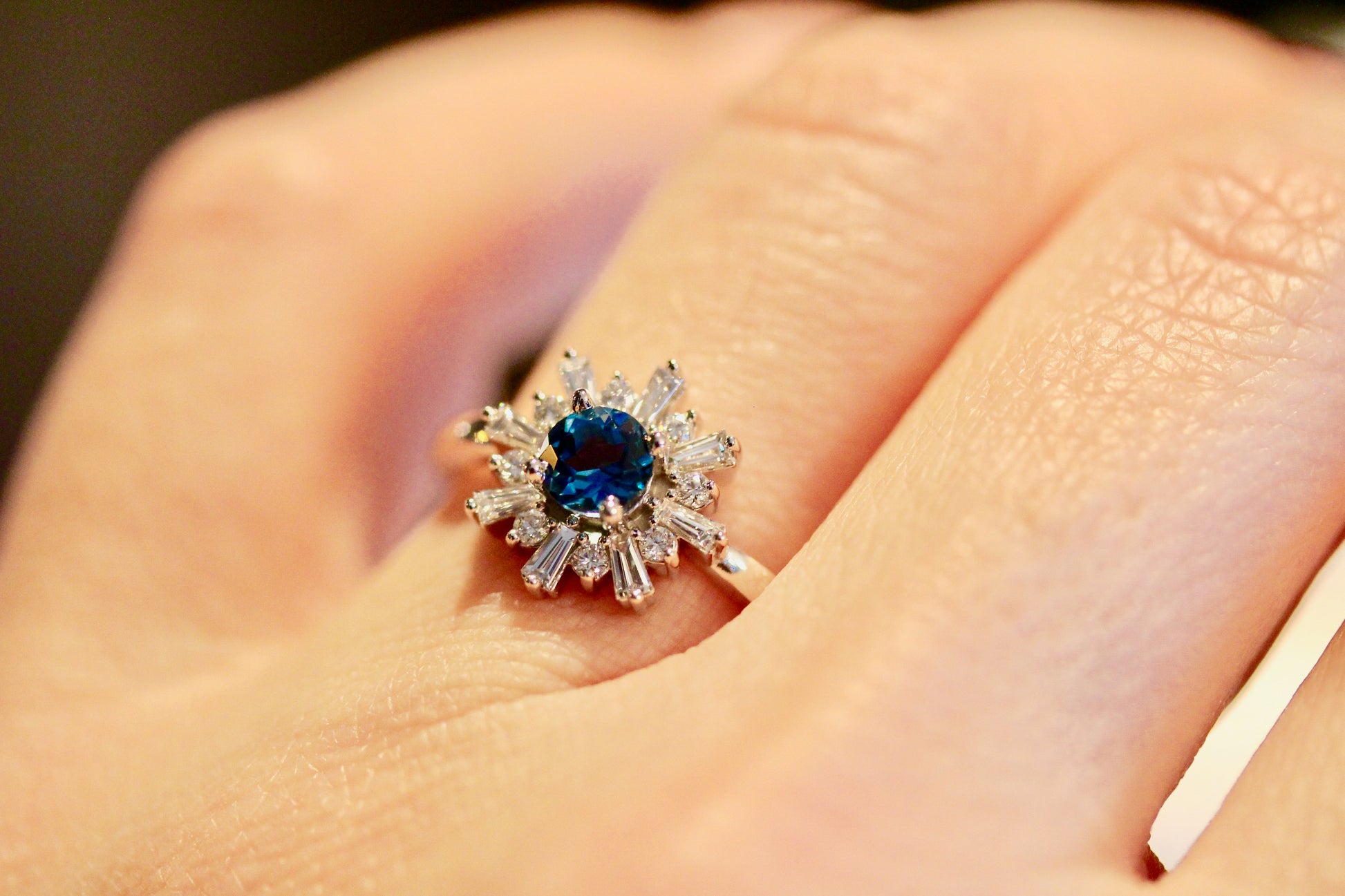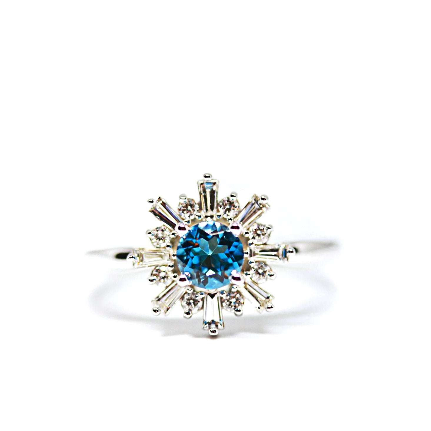 This ring has a natural London Blue Topaz in the center with 8 tapered Baguettes and 8 Round Brilliant cut Diamonds that give it an art deco style.