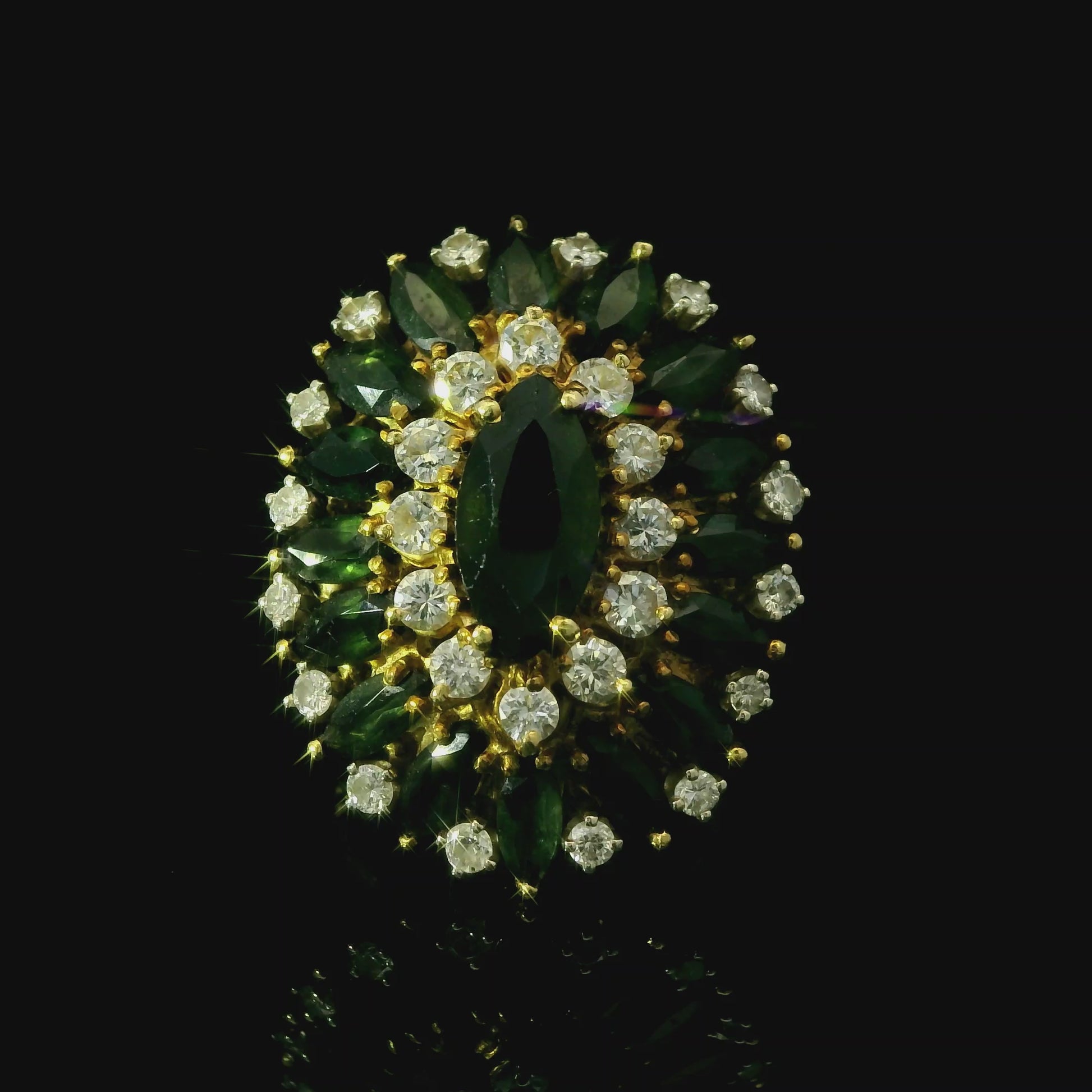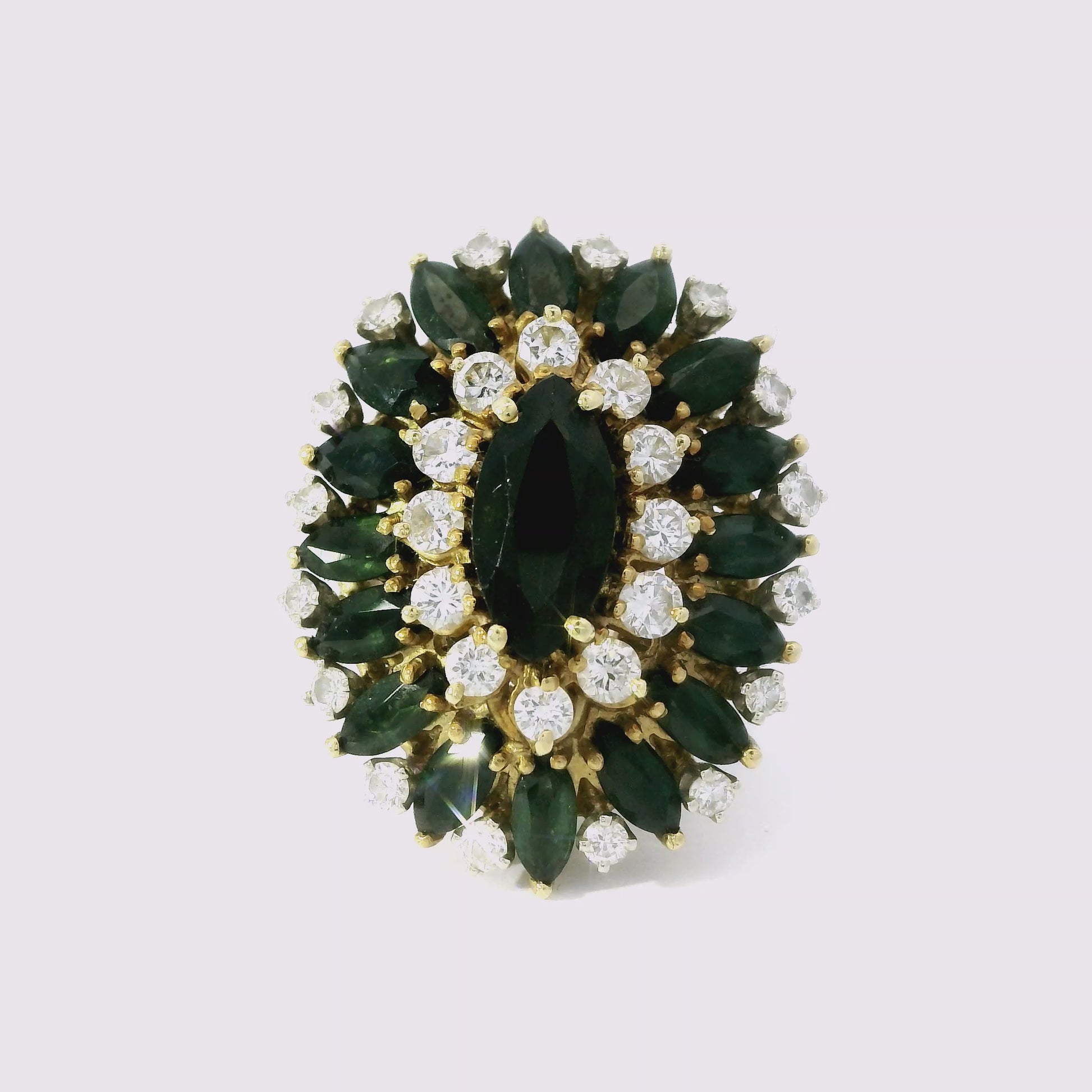 This breathtaking Cindy Royce statement ring is crafted in rich 18K yellow gold and set with vivid green tourmaline and brilliant white diamonds in a bold, architectural cluster design. At the center, a dramatic marquise-cut green tourmaline anchors the piece, surrounded by layers of shimmering round brilliant diamonds and additional marquise green tourmalines that create a luxurious, dimensional halo.