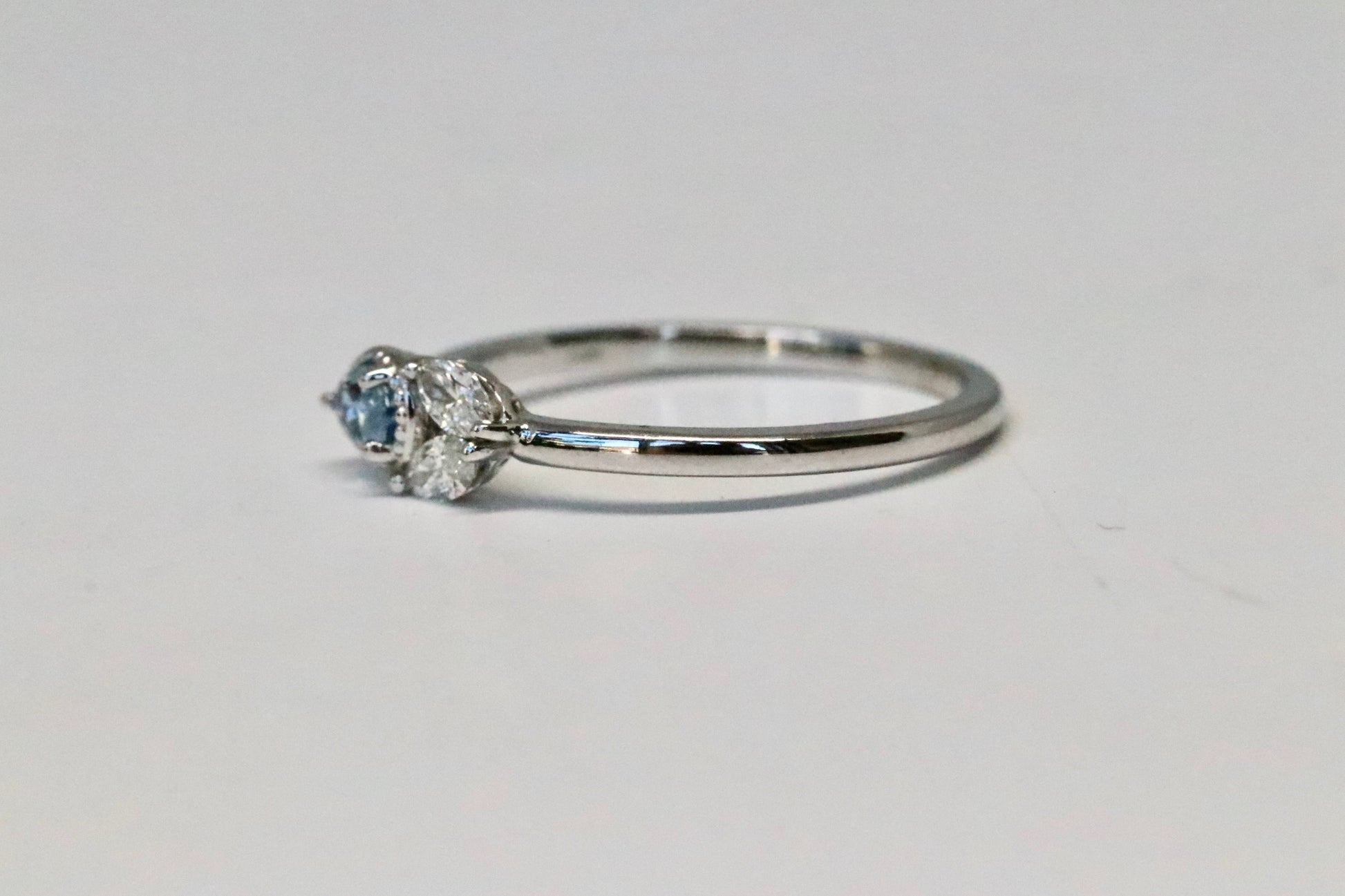 This band is slim and fun. It has a AA Natural Aquamarine Pear cut gemstone set with 2 natural marquises cut diamonds on the side. We offer this ring in 14kt Rose, Yellow, and White Gold for 2nd-day delivery.