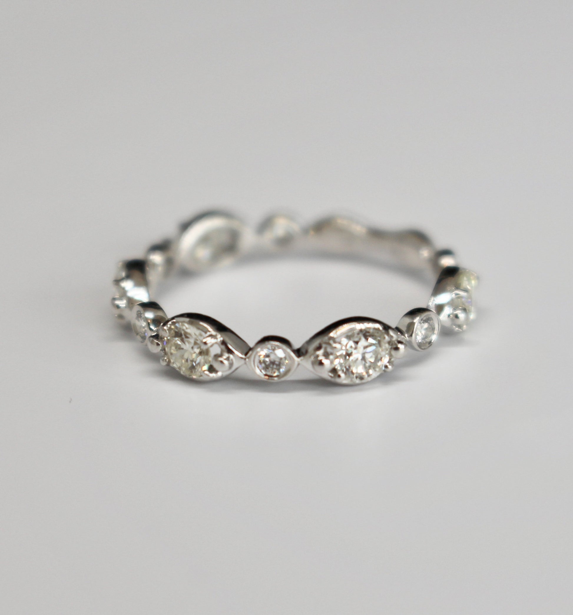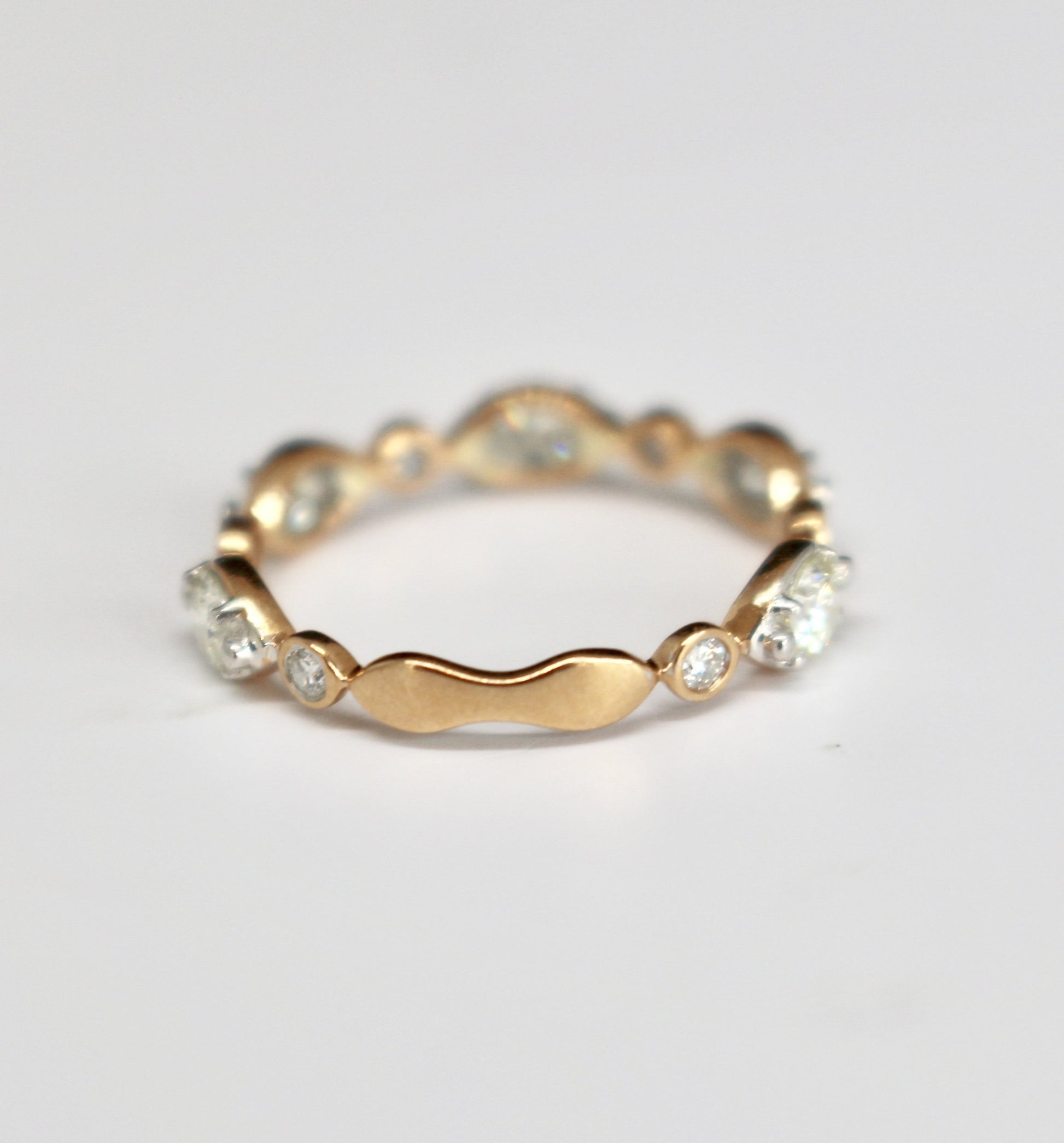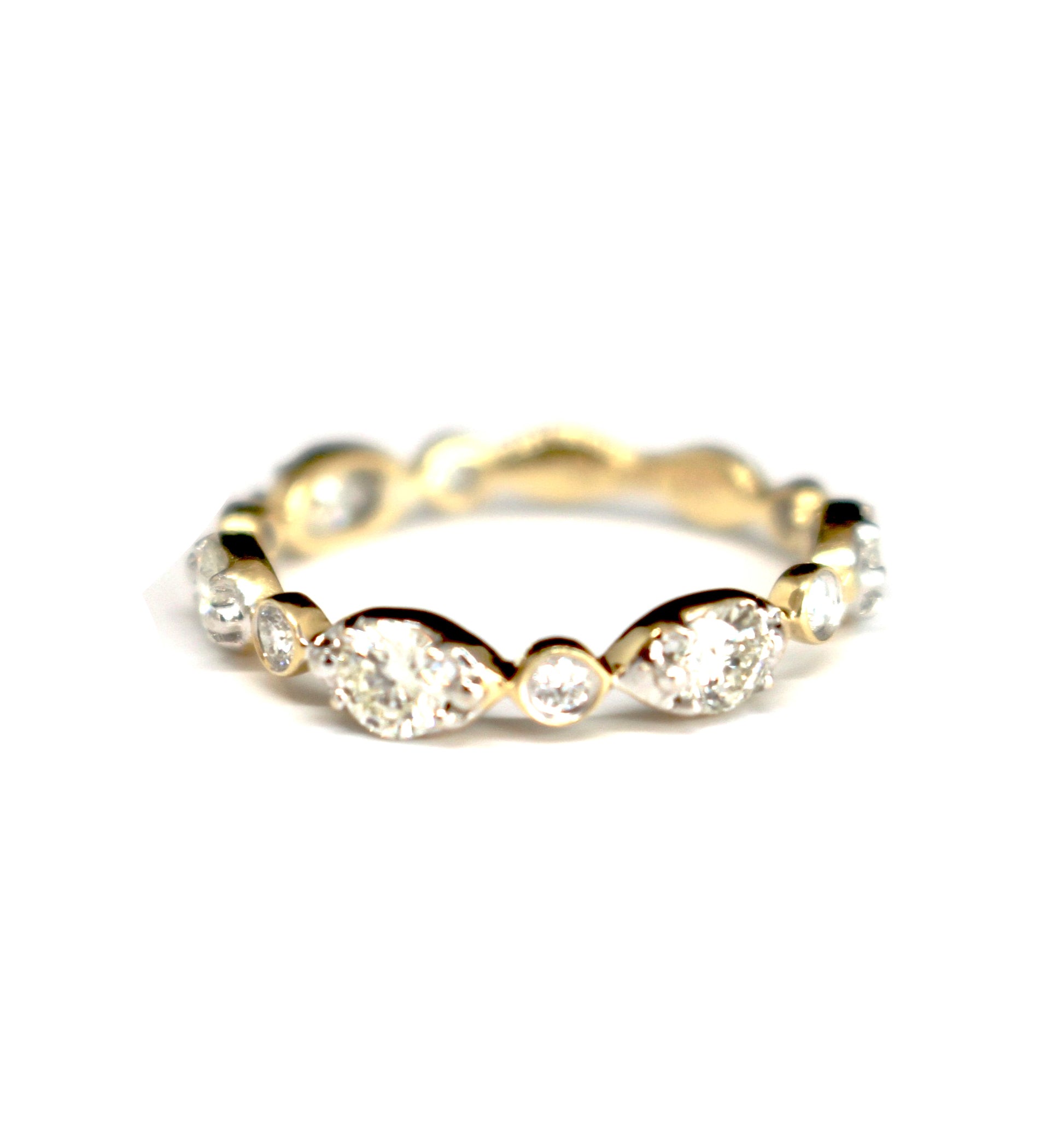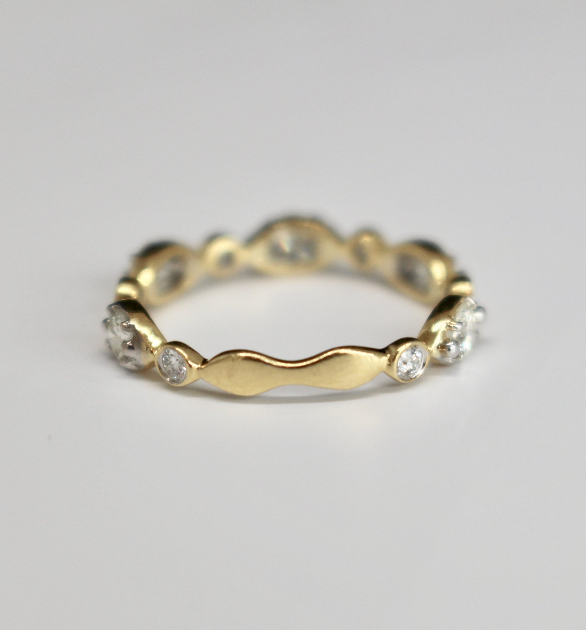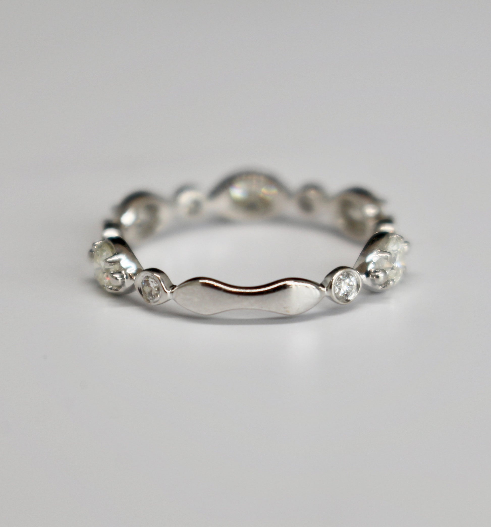 This stackable has 11 round brilliant cut diamonds set in alternating shared prong marquise and bezel set rounds. All three metal colors take 8 days to make.