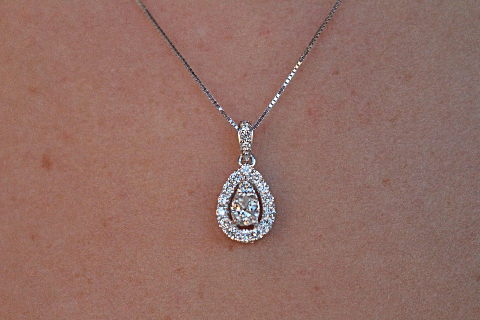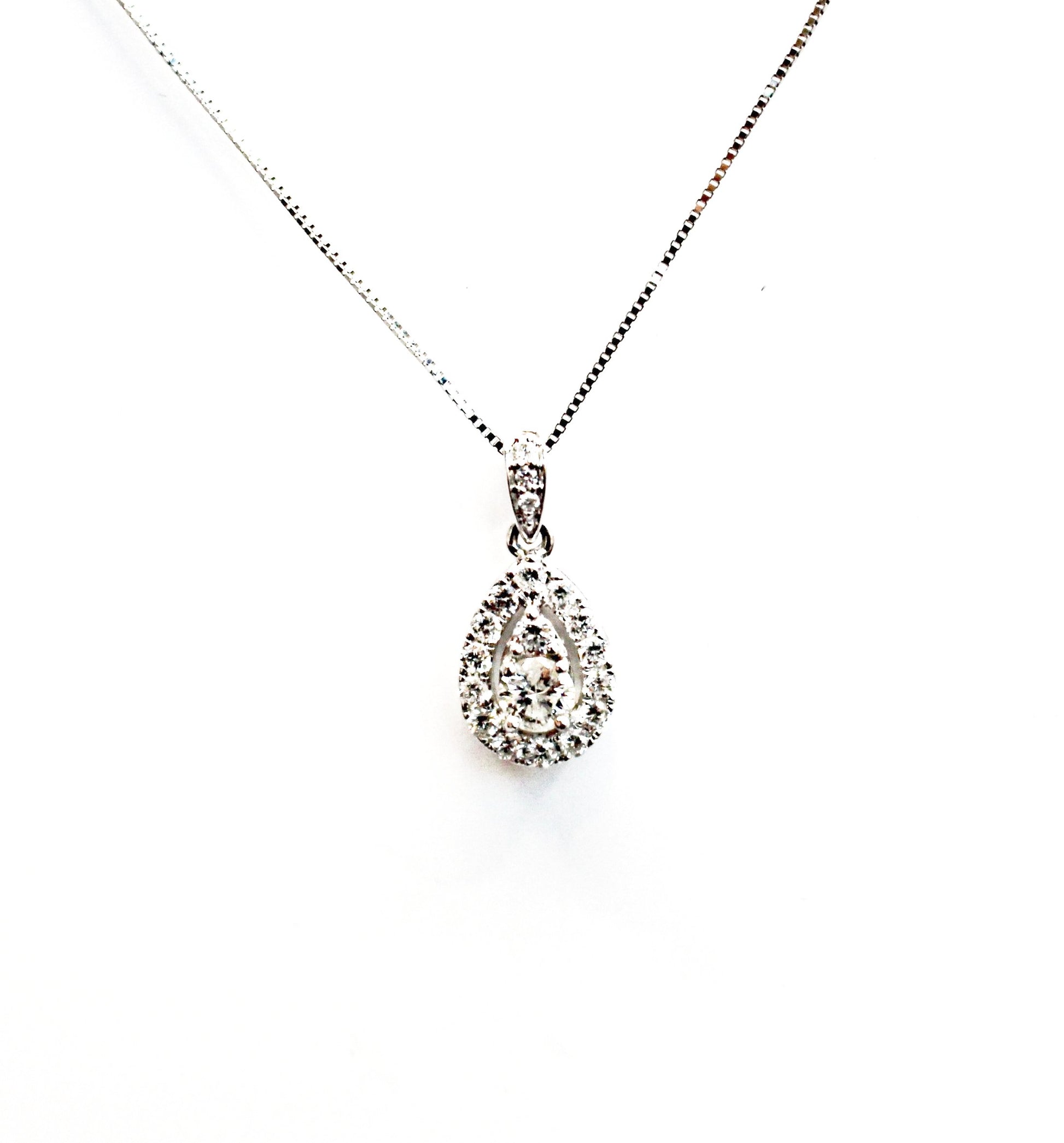 This pendant has 1 Pear Cut Diamond Surrounded by a Halo of Diamonds. It also hangs from a diamond-encrusted bail on an 18" box link chain. Currently, this pendant is available for next-day delivery in 14kt white gold but if you would like it in yellow or rose gold, please give us a call/text at (630)355-RING.