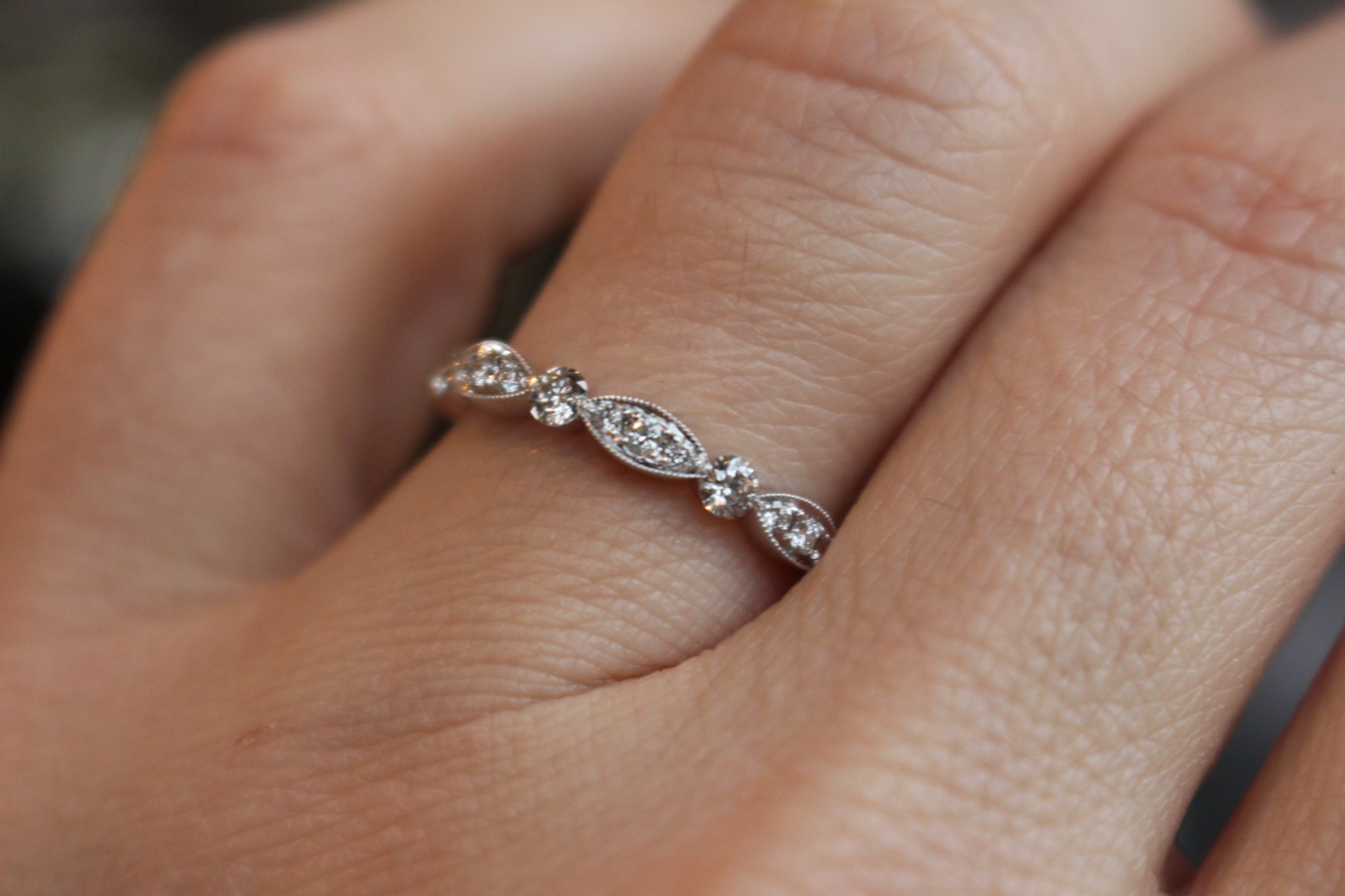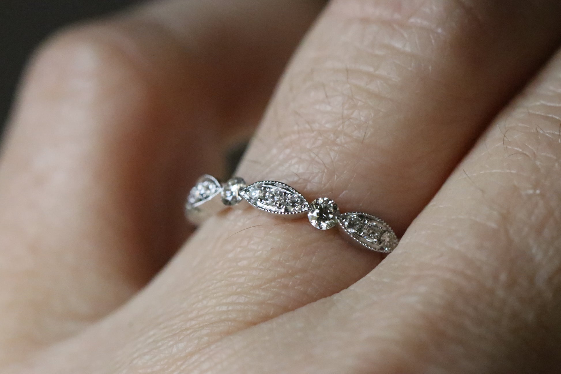 This band has 19 round brilliant cut diamonds throughout. 4 larger round diamonds alternating between 5 sets of 3 graduated diamonds shaped like marquise surrounded by mil-grain.
