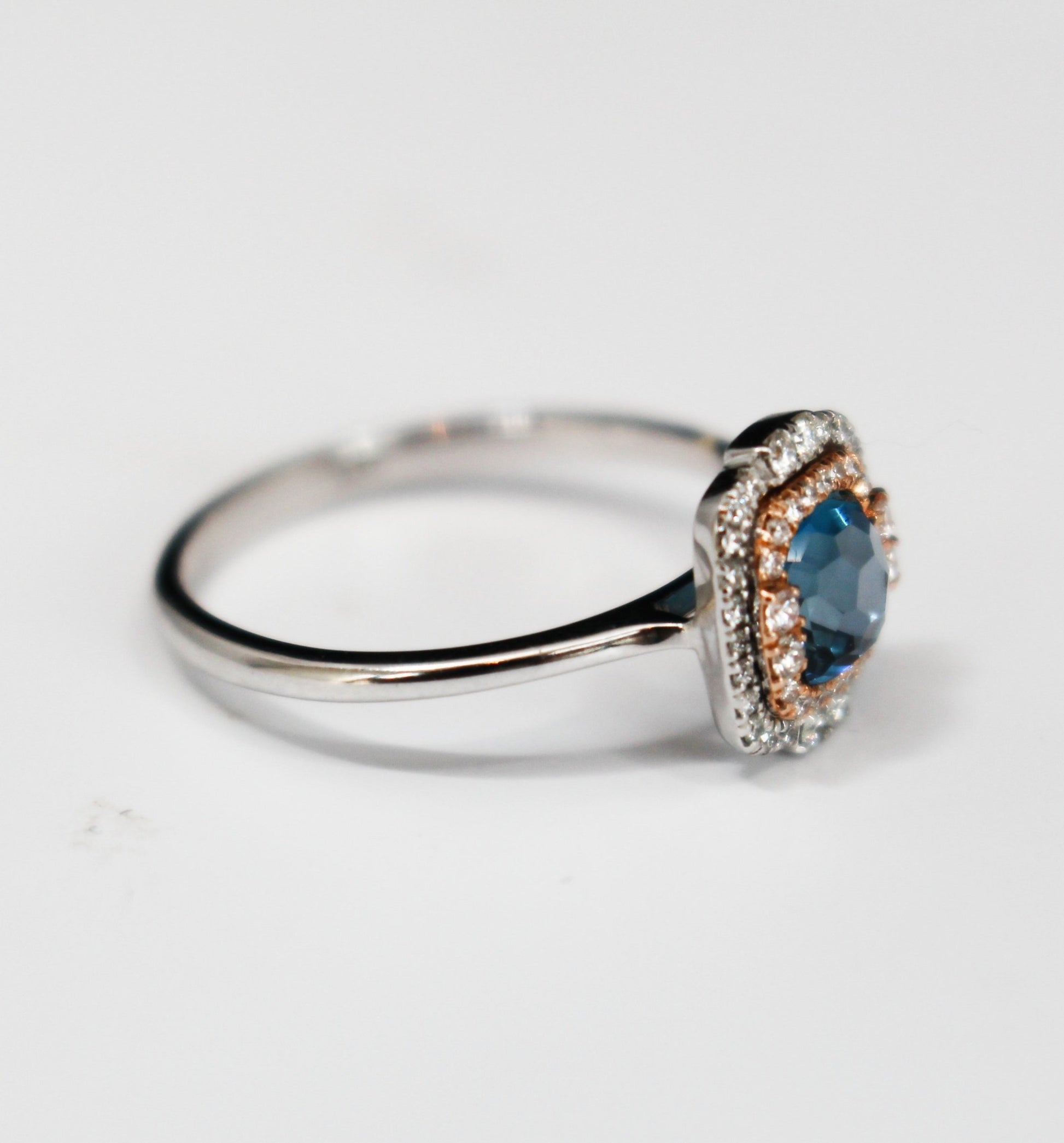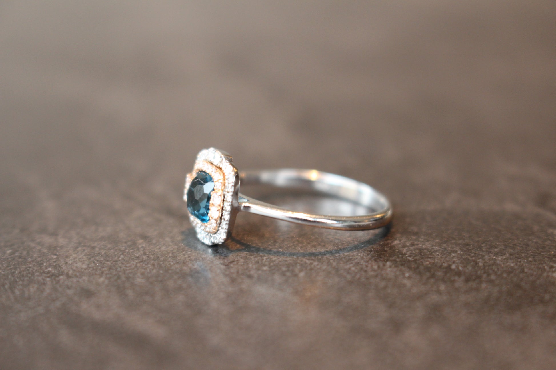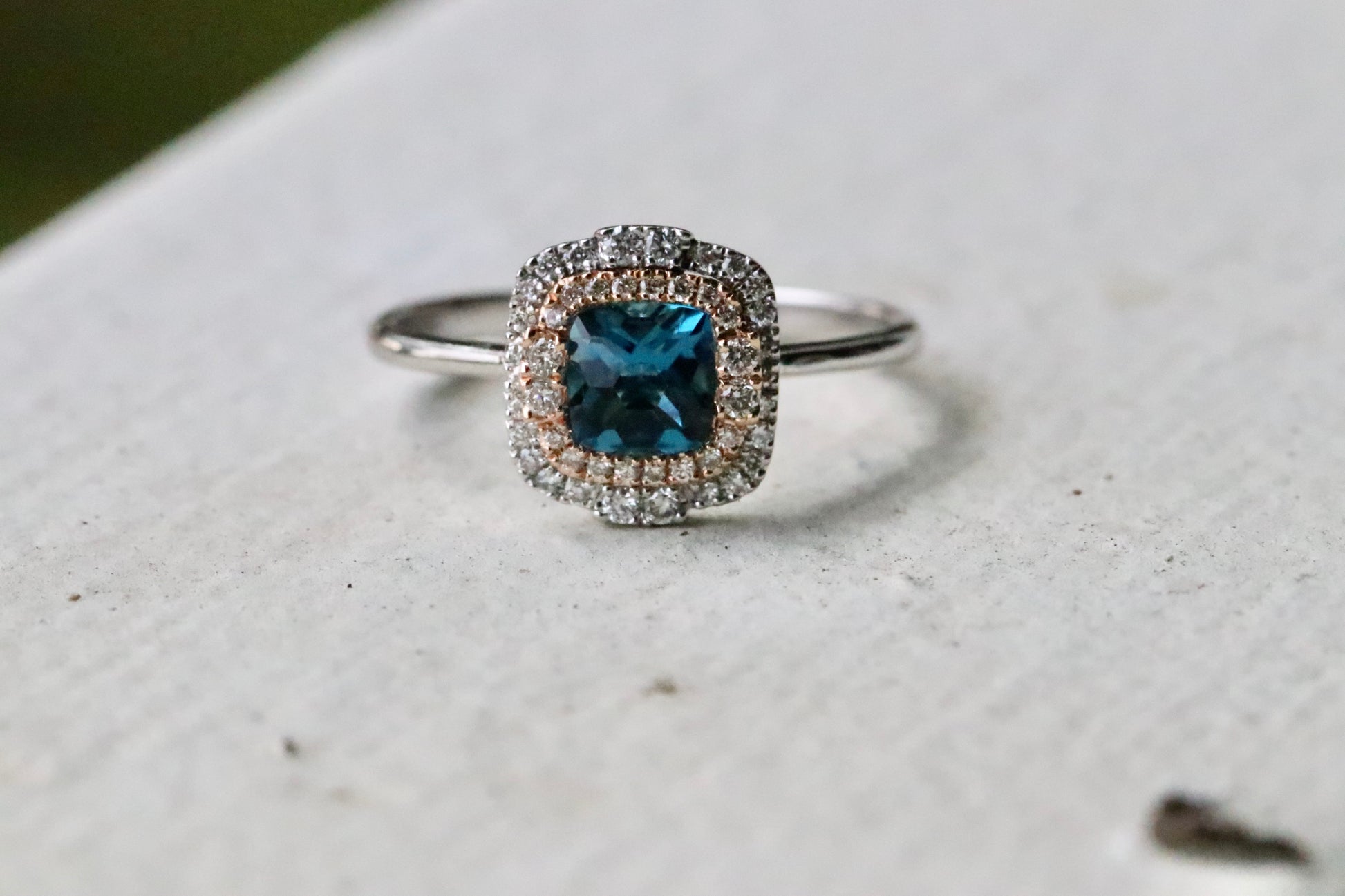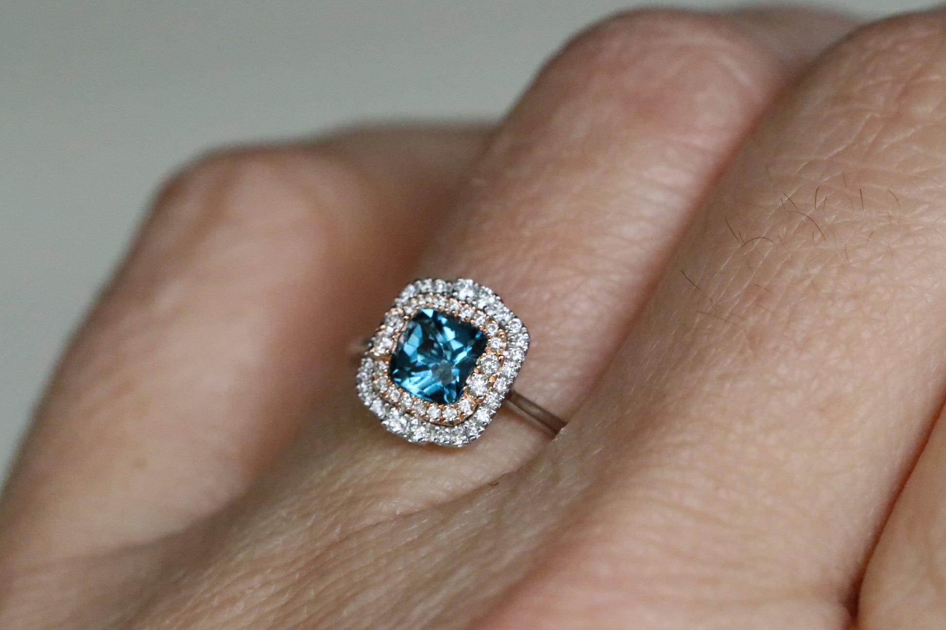 This is a double halo diamond and Checkerboard Cushion-Cut London Blue Topaz. The ring features a white gold halo on the outside and a rose gold halo on the inside around the gemstone. The haloes are cushion-shaped as well.