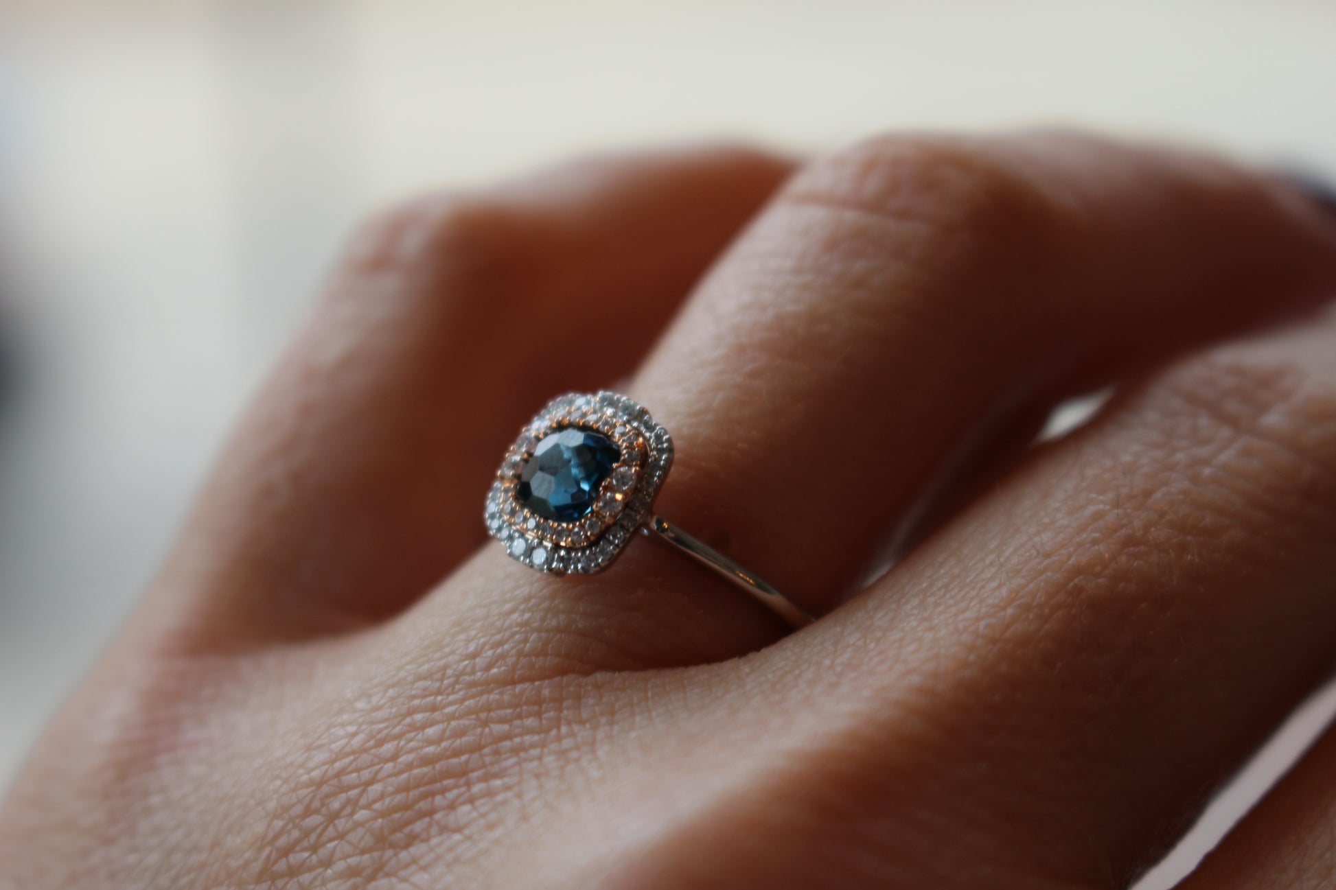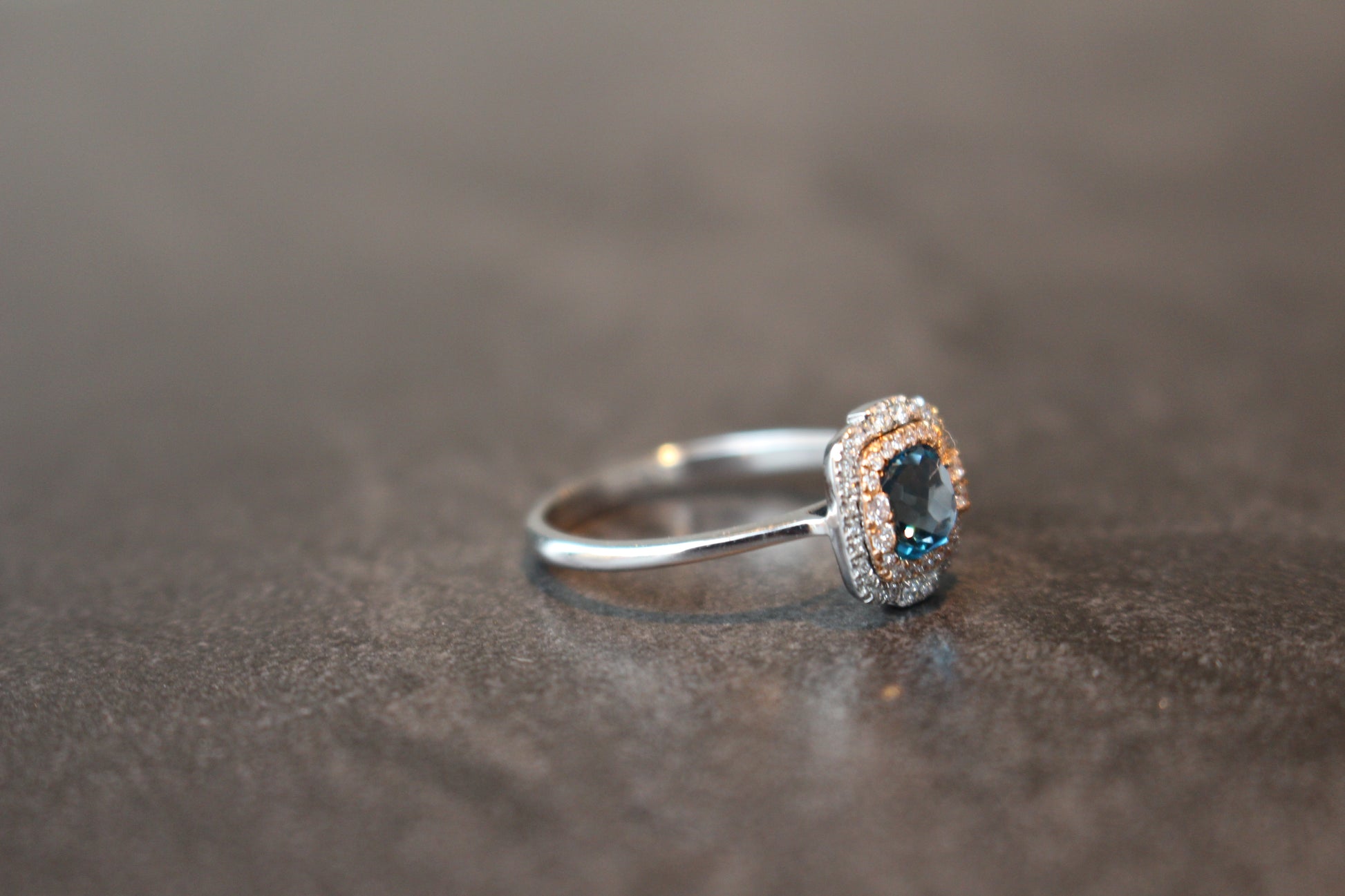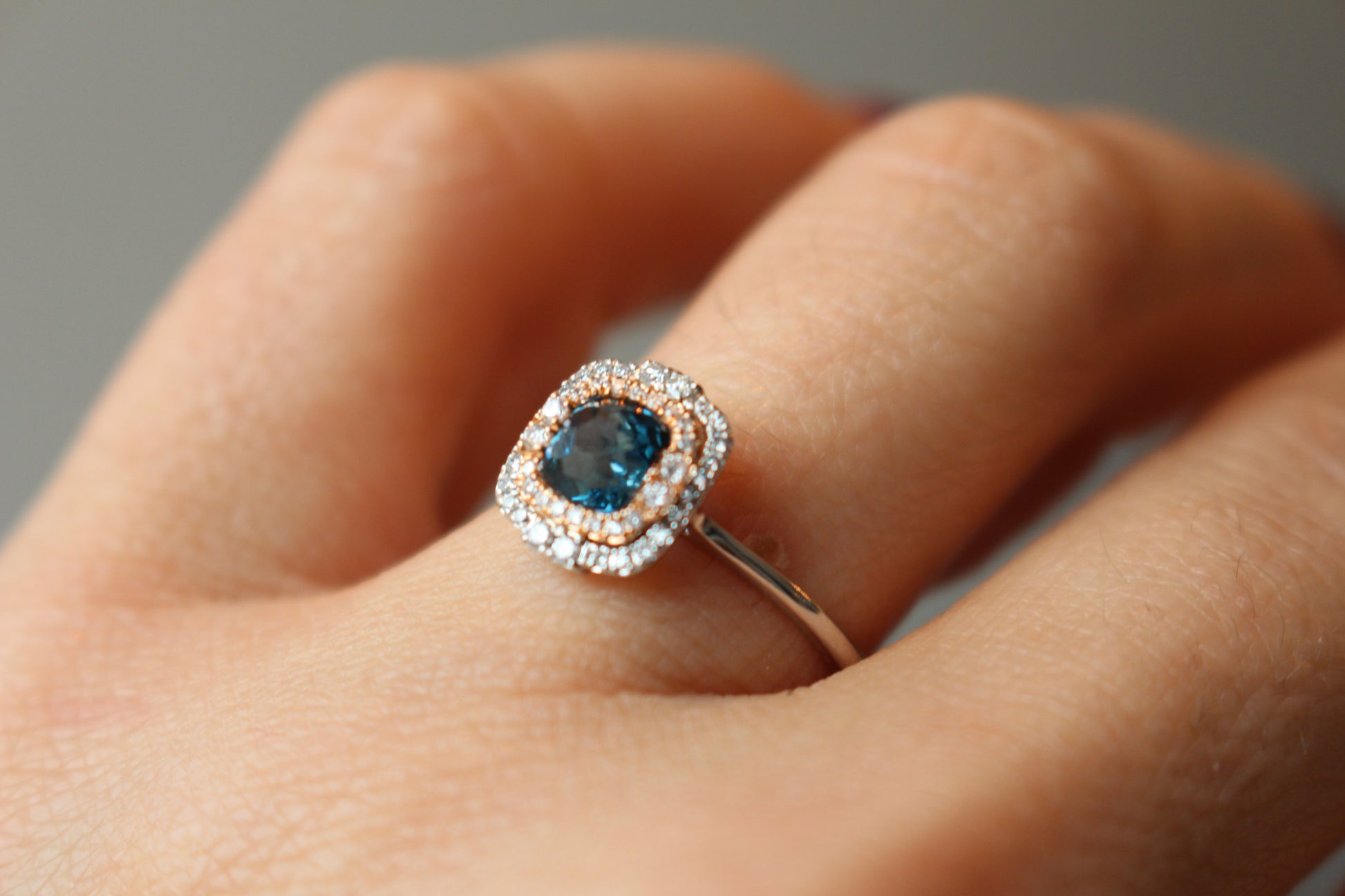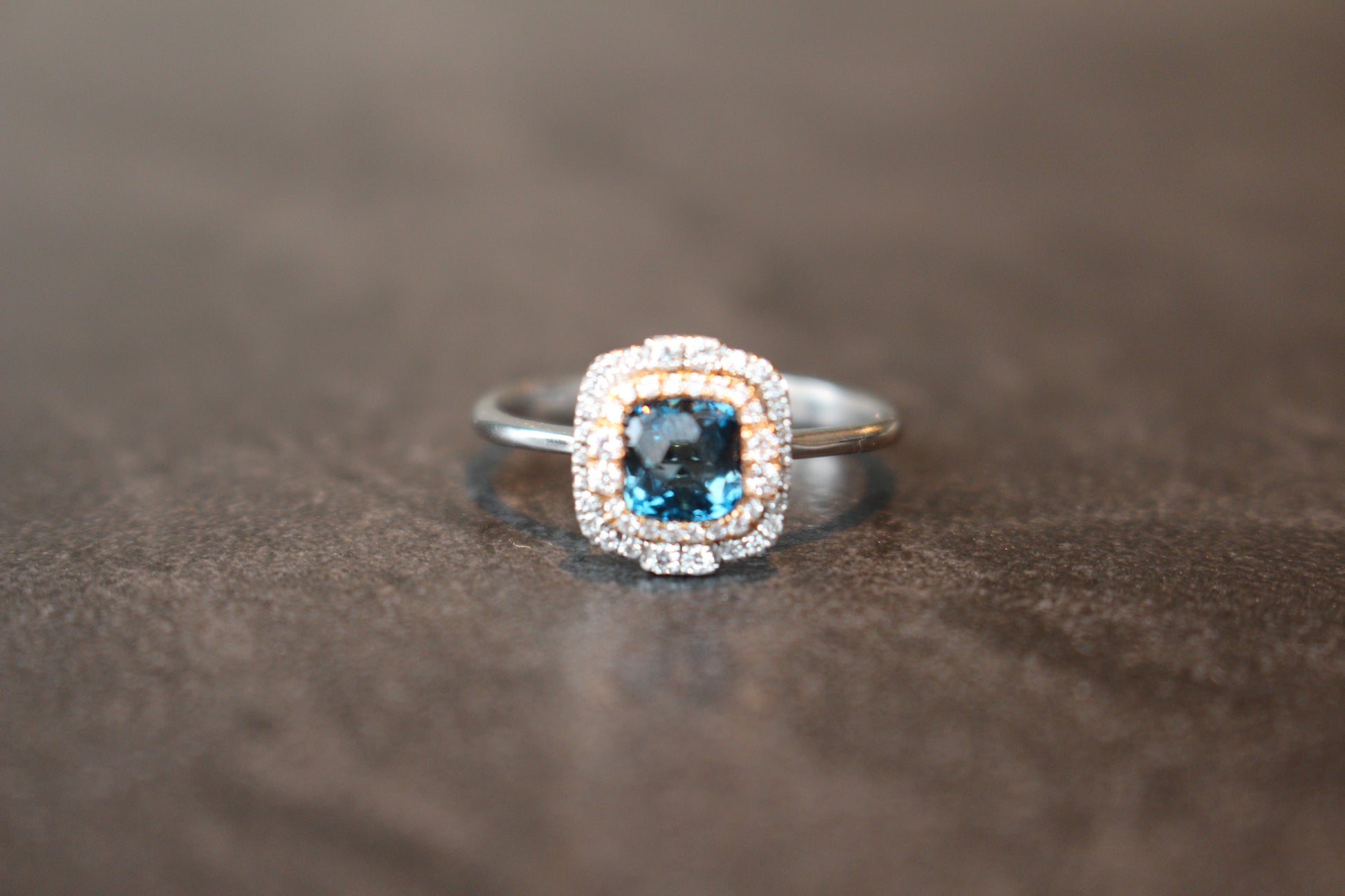 This is a double halo diamond and Checkerboard Cushion-Cut London Blue Topaz. The ring features a white gold halo on the outside and a rose gold halo on the inside around the gemstone. The haloes are cushion-shaped as well.