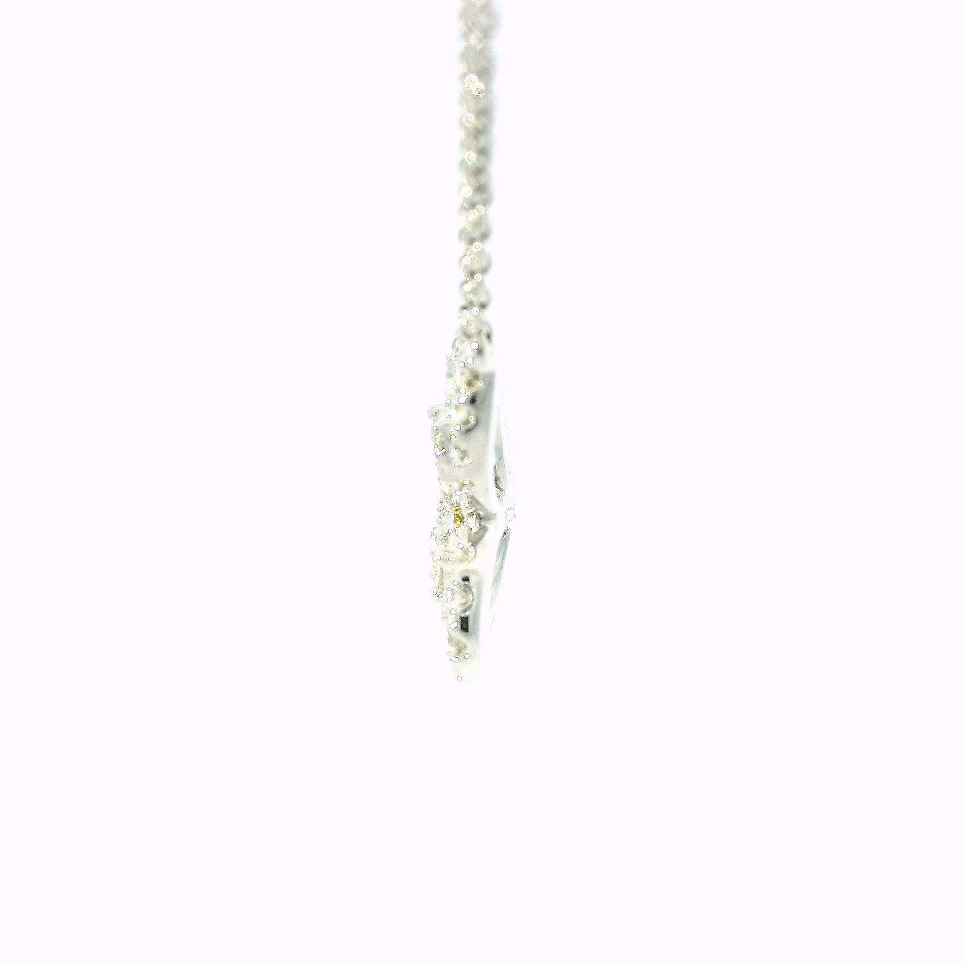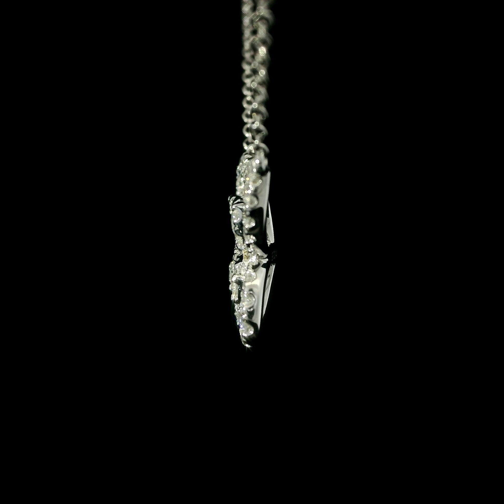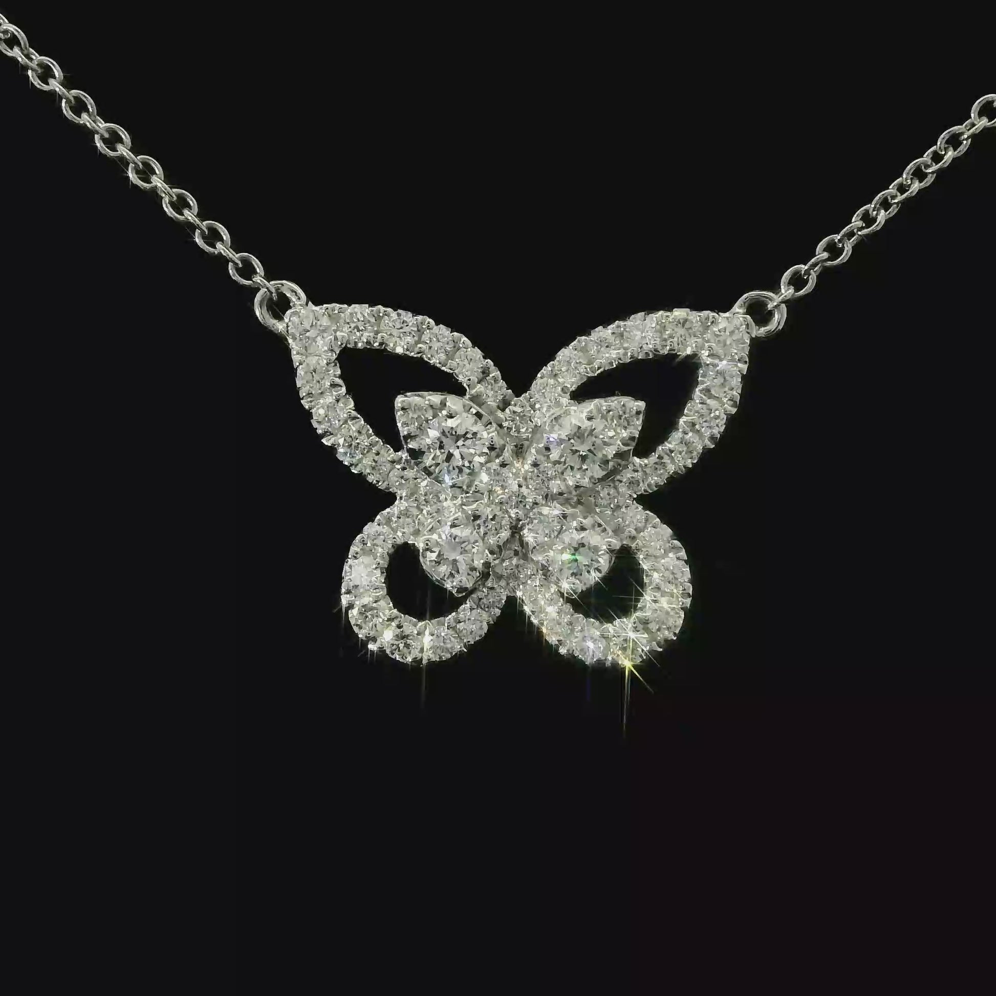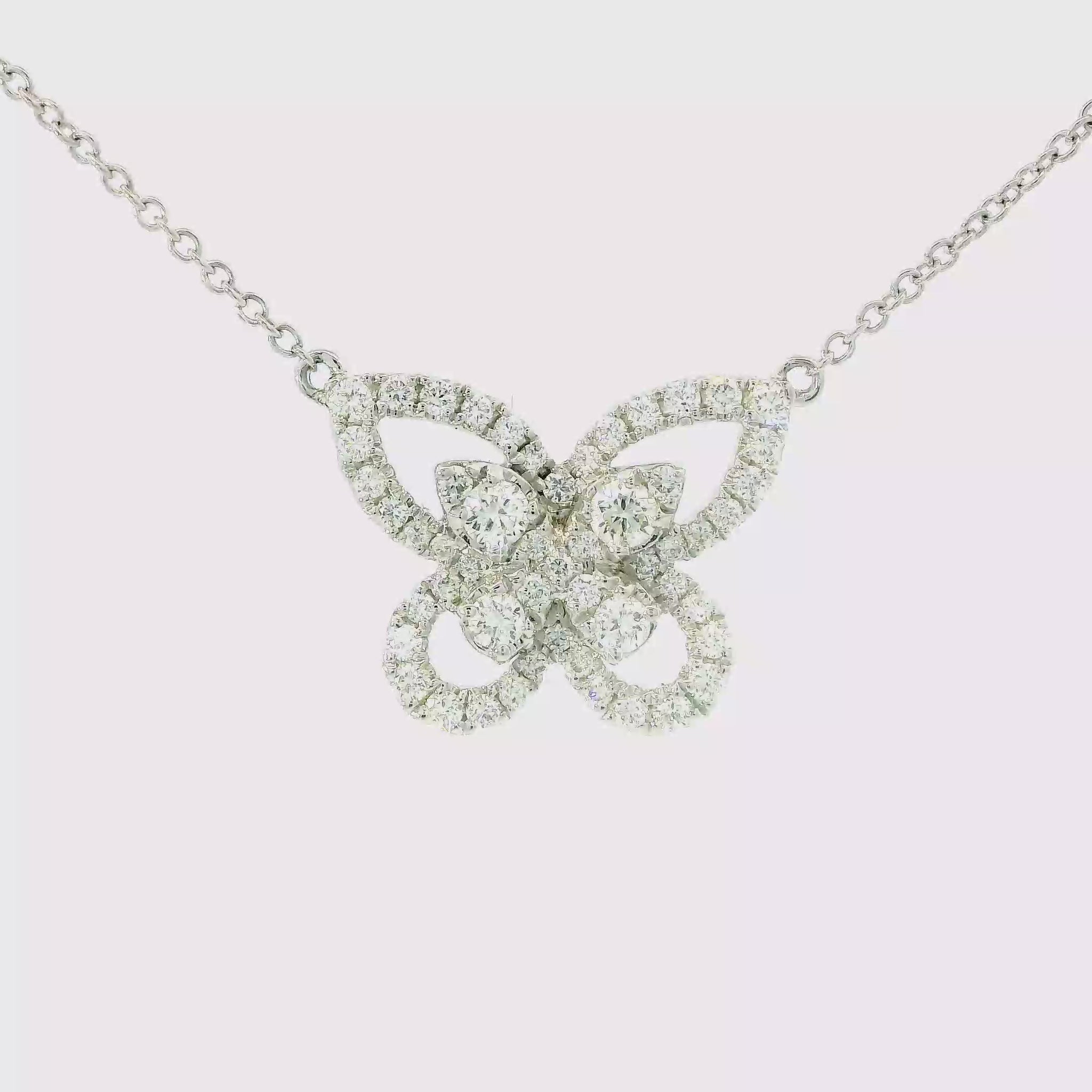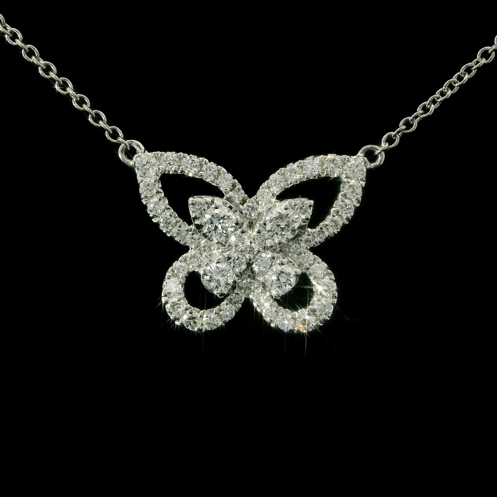 The sculpted butterfly design features intertwined diamond loops and a cluster of larger center stones, creating a luminous 3-D effect that radiates sophistication. Suspended from a sleek white-gold chain, this pendant glows effortlessly against the skin — perfect for day-to-night elegance.
