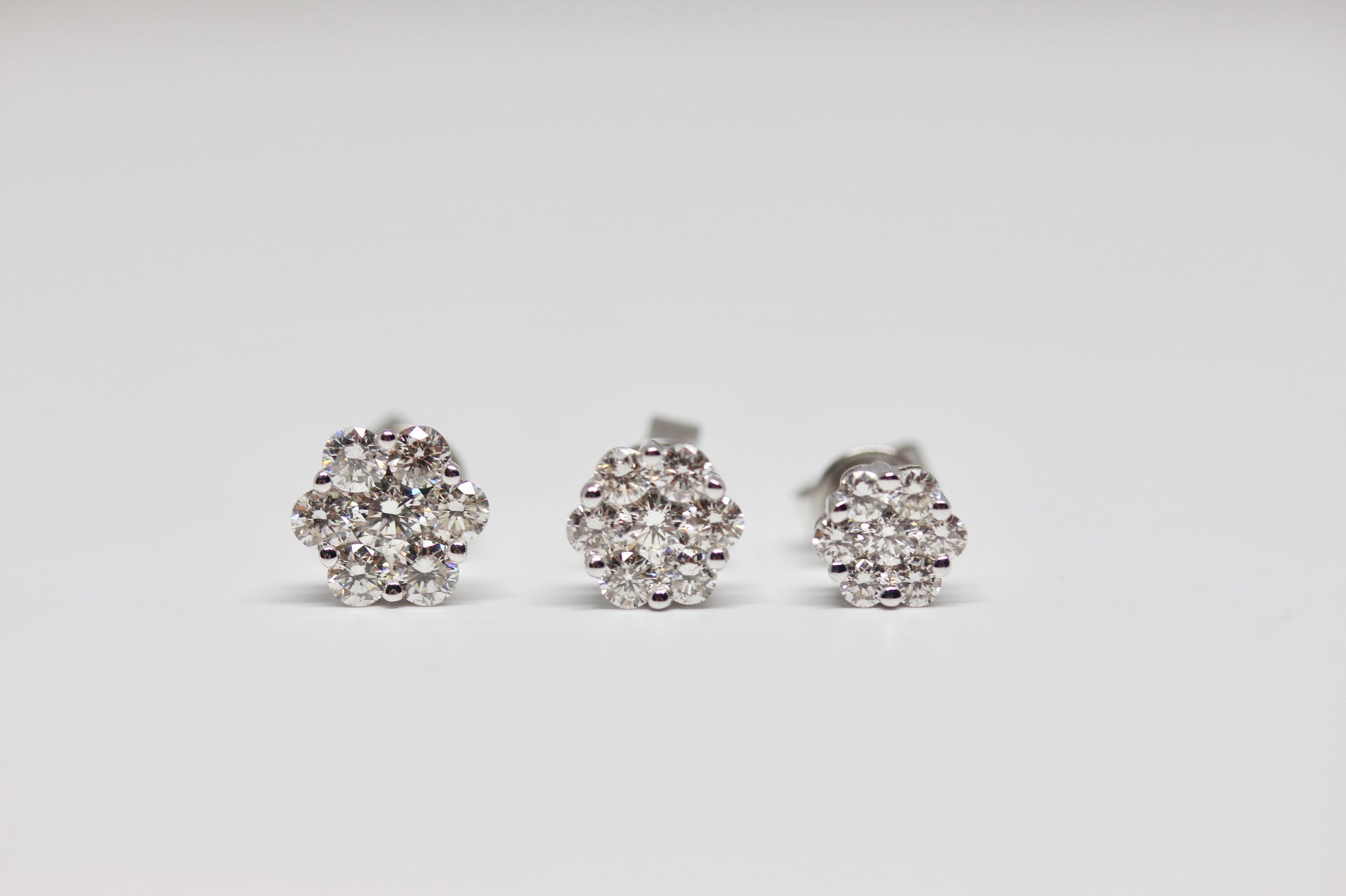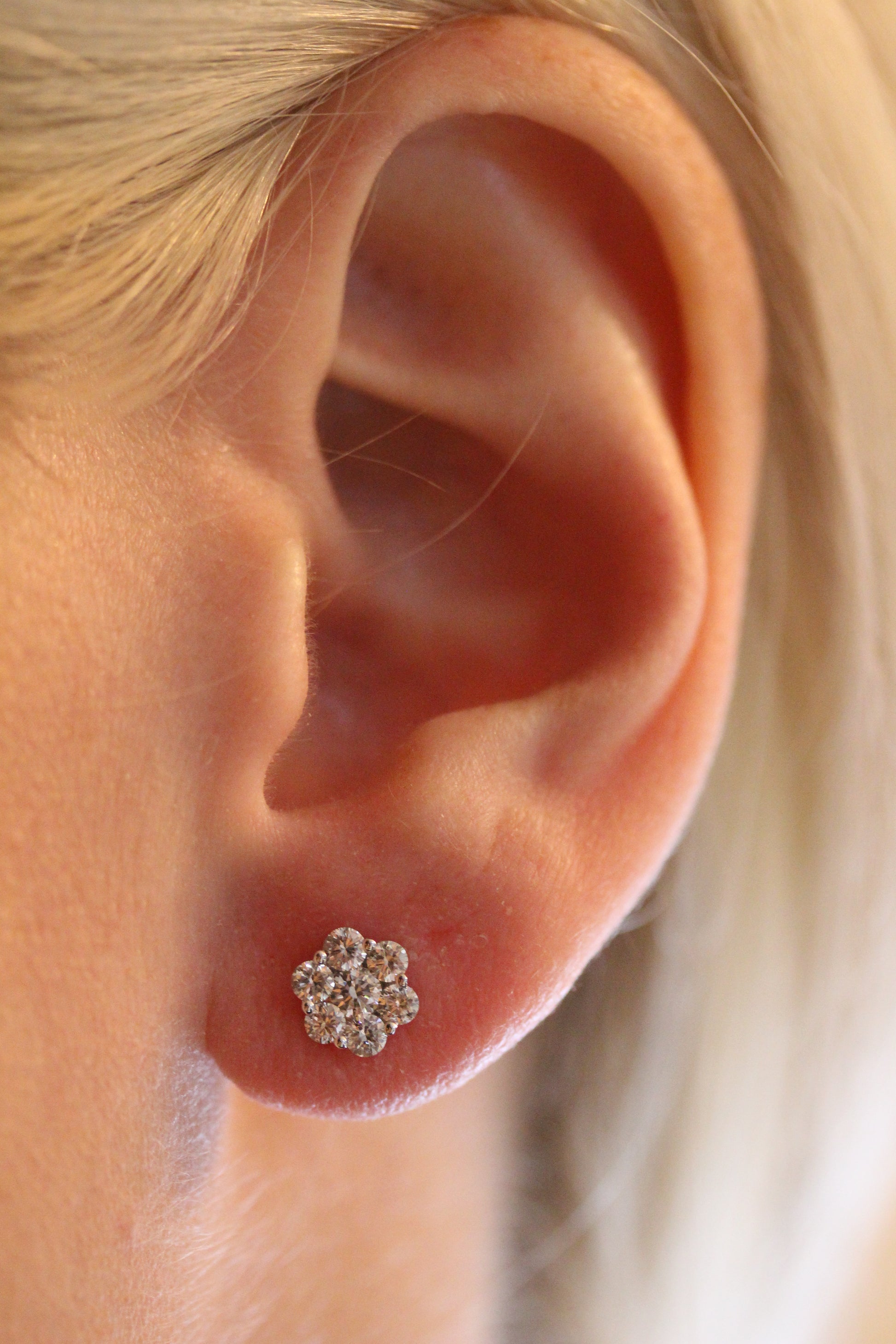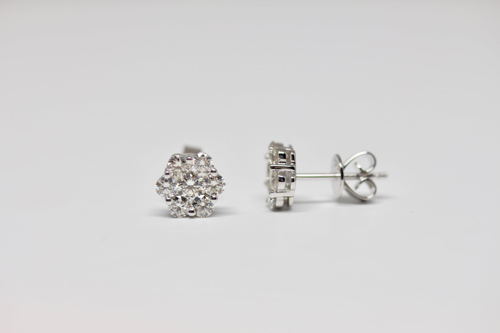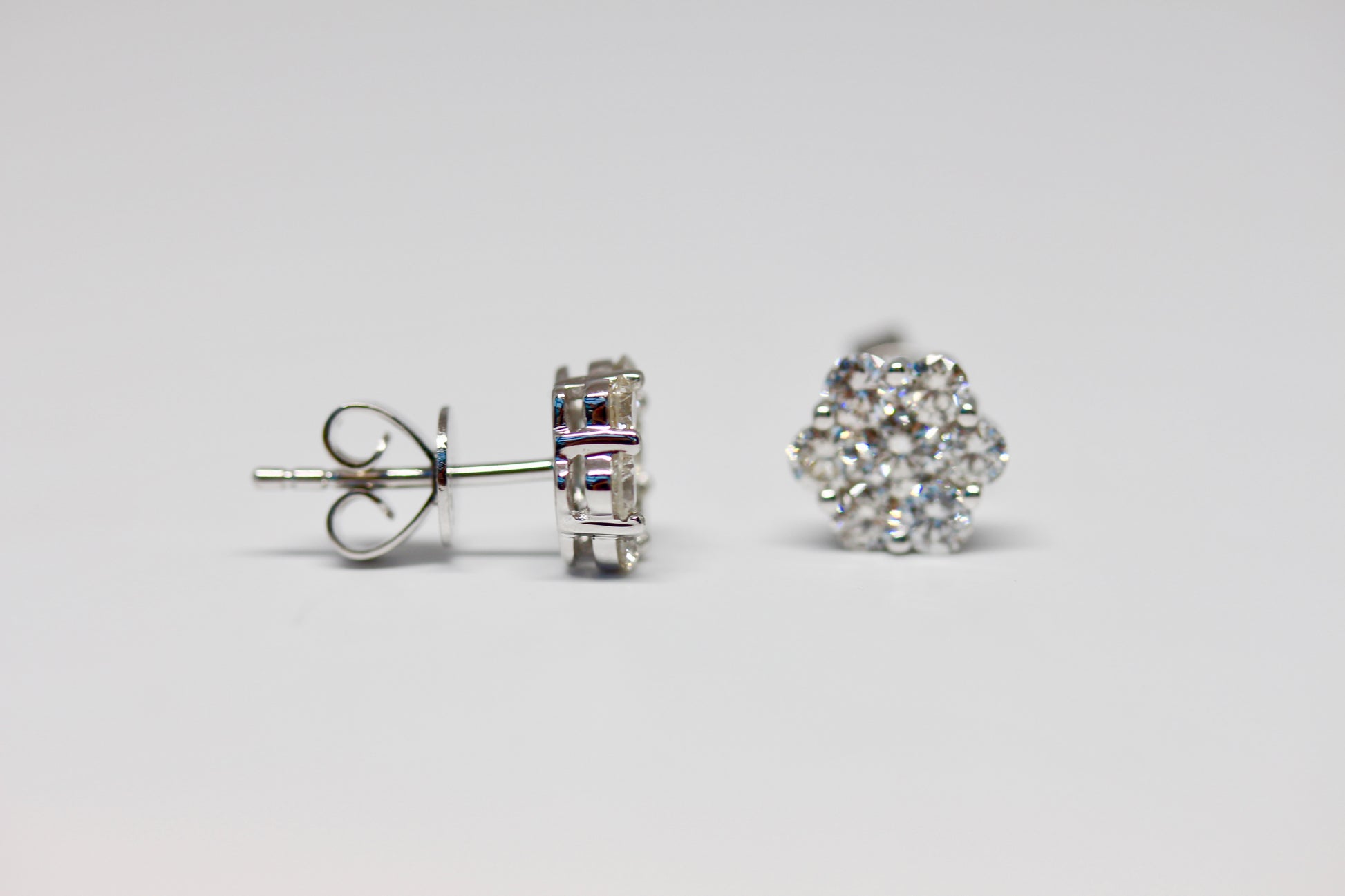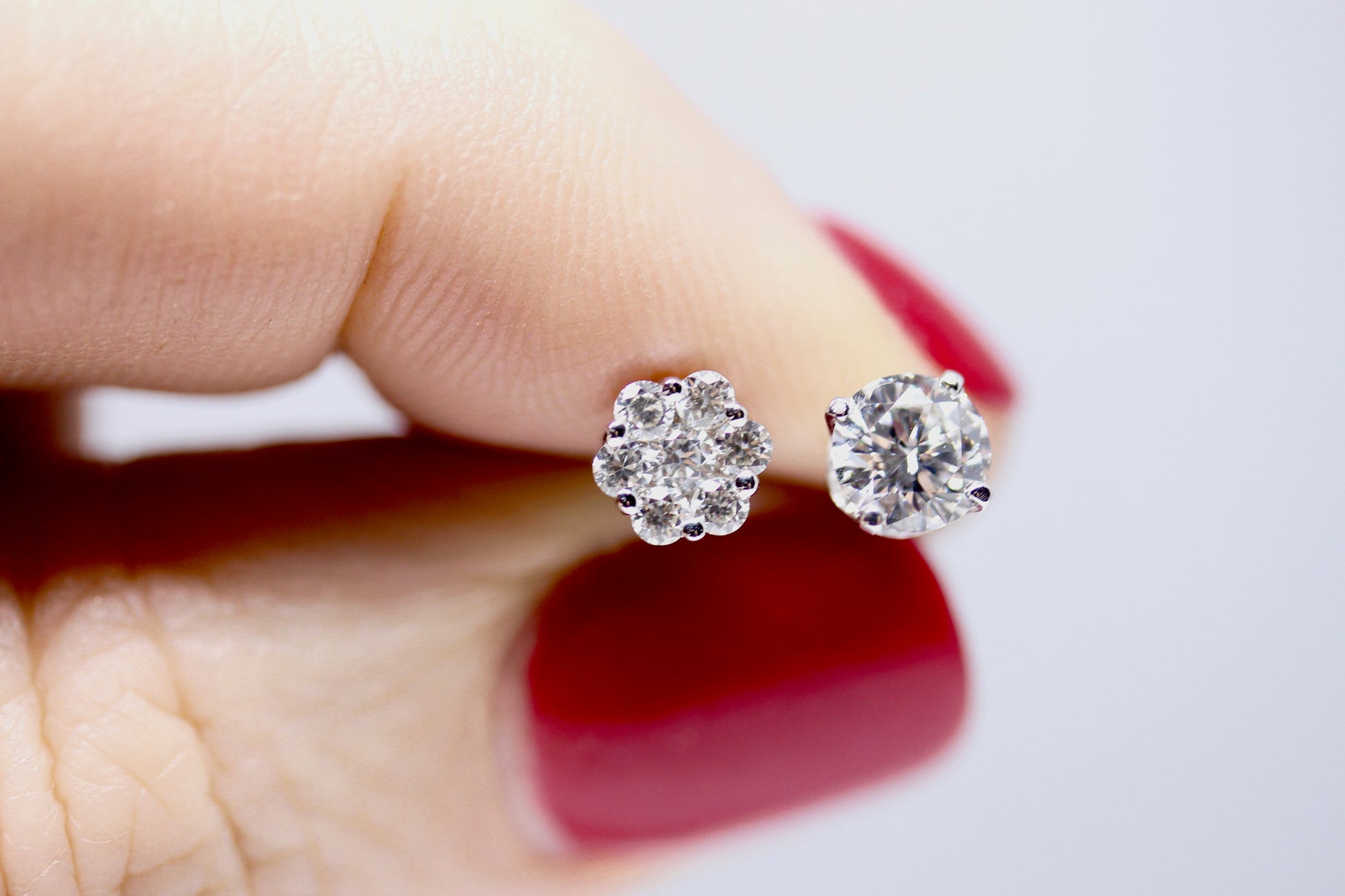 Each earring has 7 round brilliant cut diamonds clustered together to form a round scalloped shape. They are shared prong set and each pair comes in 3 different carat weights; 0.50tcw, 0.75tcw, 1.00tcw. The 0.50tcw gives the illusion of having a pair of round 1-carat diamond studs at 5.5mm in width. The 0.75tcw gives the illusion of having a pair of 2 carat round cut diamond studs at 7mm in width. Then the 1.00tcw studs give the illusion of having a pair of 4 carats round diamond studs at 7.5mm width. The backs on all are friction back and high polish.
