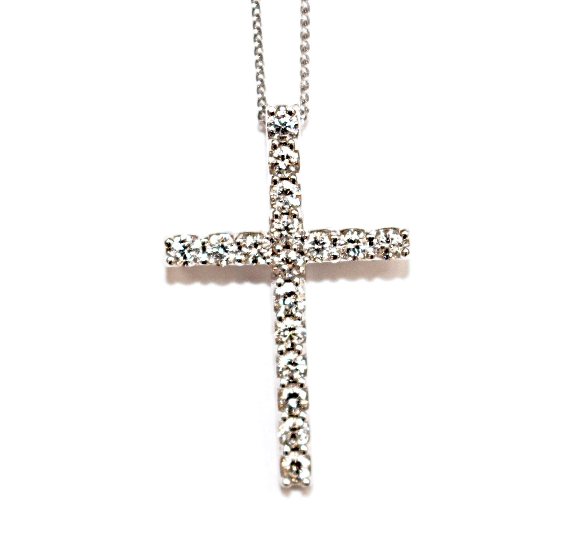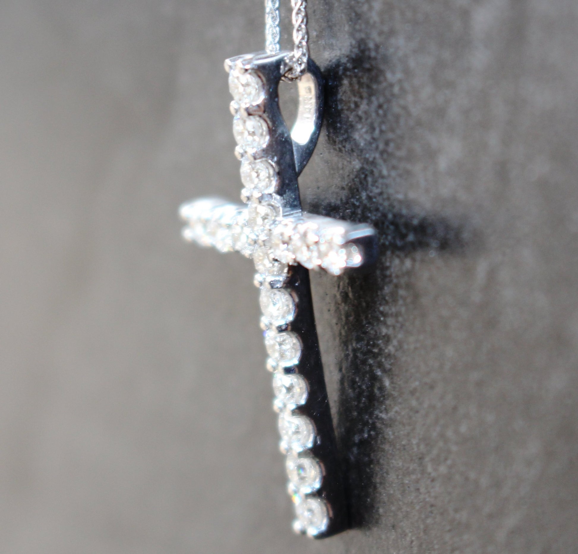 This diamond cross pendant has 17 Round Brilliant Cut Diamonds Shared Prong Set for a total of 0.68cts. It measures 27mm in Length and 17mm in Width. The back has a hidden bail connected for a chain to easily pass through.