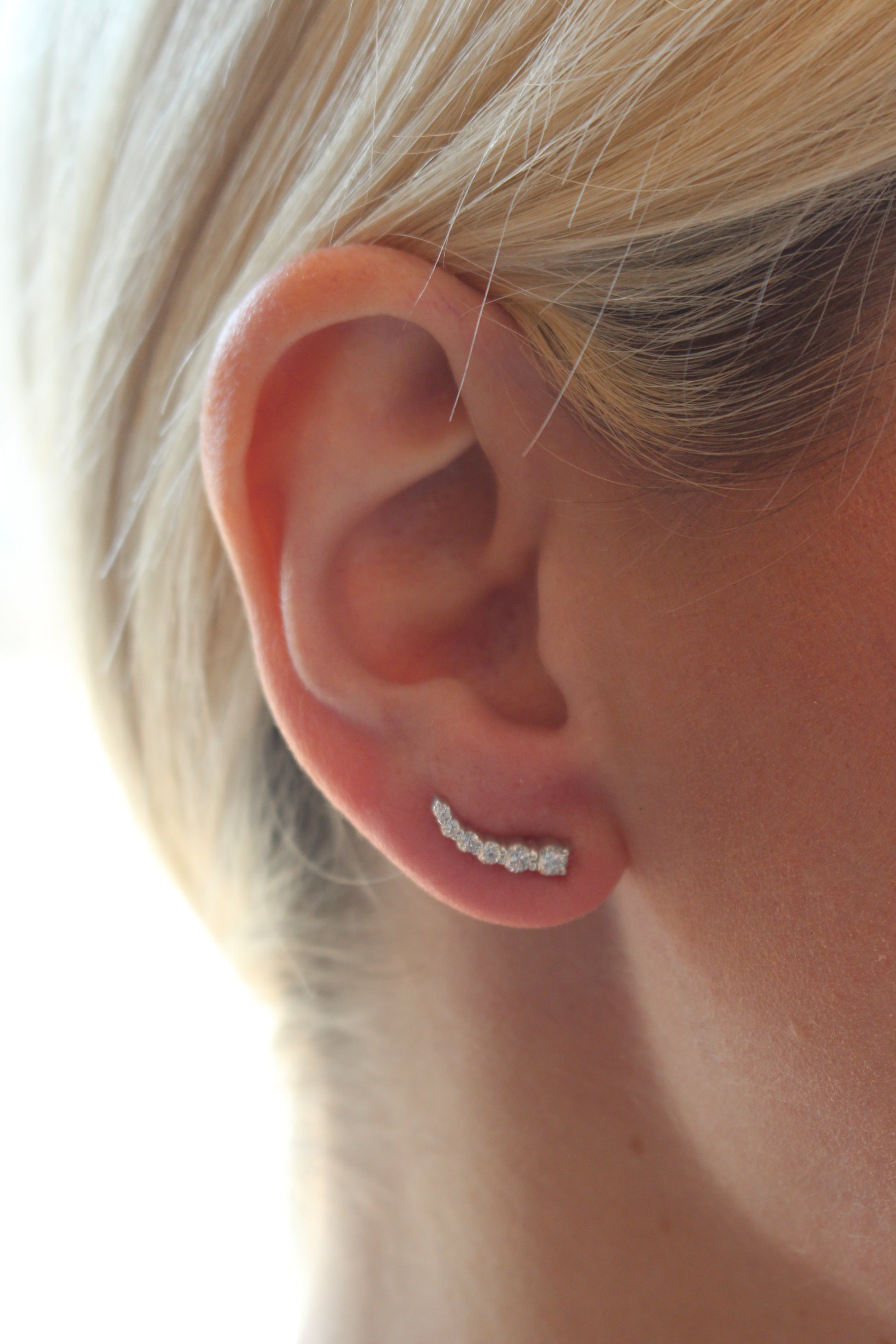 These earrings have 12 round brilliant cut graduated diamonds that climb up the ear. These earing climbers are noticeable and sparkle. The backs are friction/butterfly backs also in 14kt white gold. Currently, these earrings are available for next day delivery in 14kt white gold but if you would like it in another metal, please call/text us at (630)355-7464 for availability time frame.