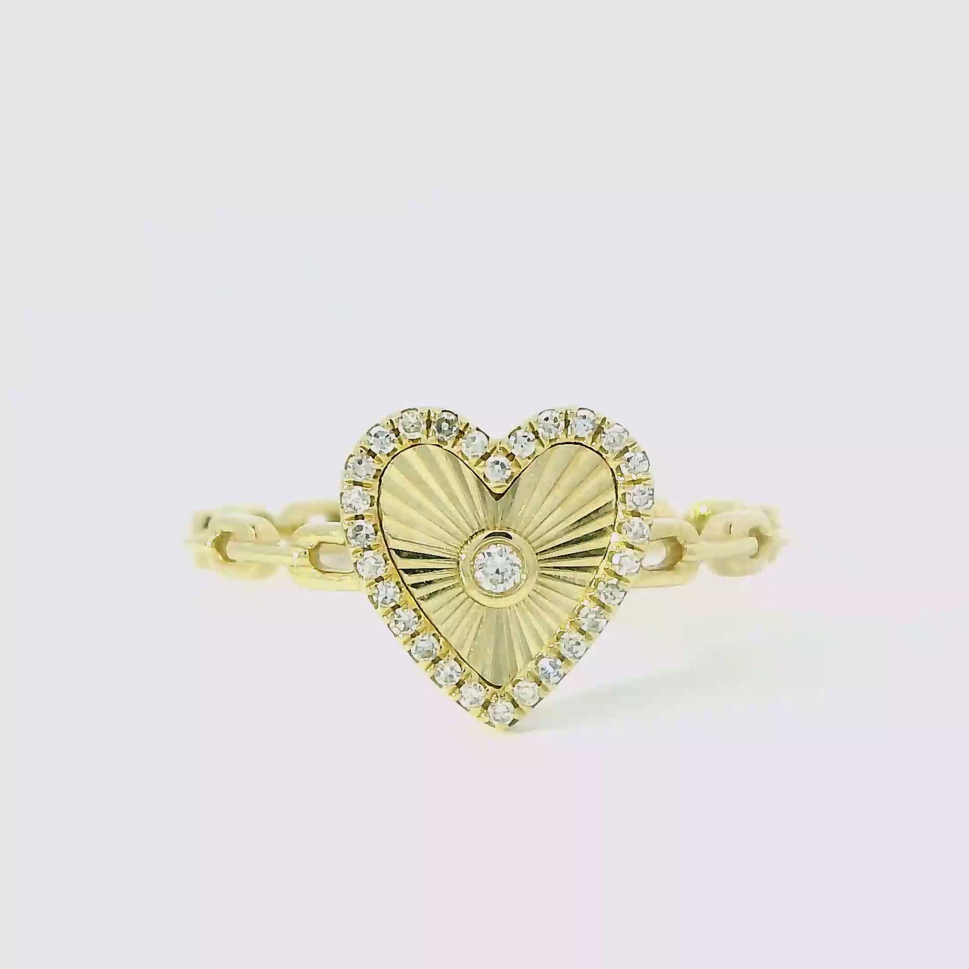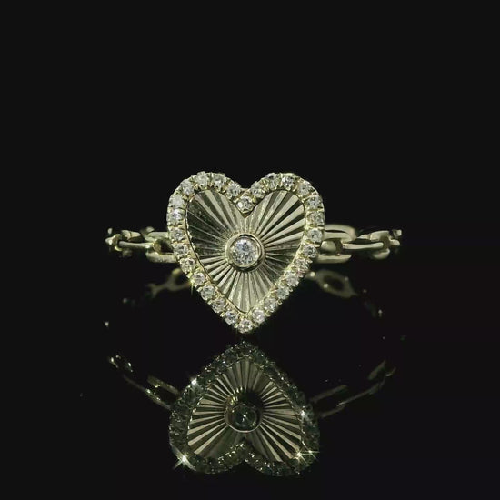 Radiant, romantic, and undeniably chic — this Diamond Heart Cable Link Ring captures the essence of love in a bold, modern design. Handcrafted in solid 14K yellow gold, the ring features a luminous heart centerpiece with a sunburst-engraved texture surrounded by a halo of natural round brilliant diamonds.